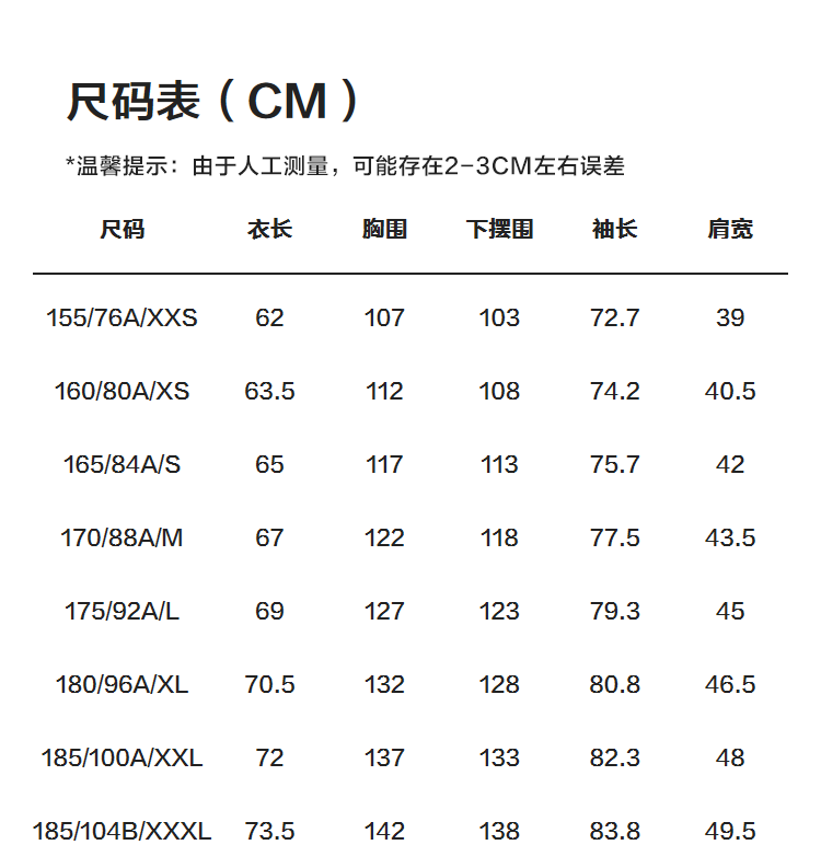 | Размер: | 155/76A/XXS, 160/80A/XS, 165/84A/S, 170/88A/M, 175/92A/L, 180/96A/XL, 185/100A/XXL, 185/104B/XXXL |