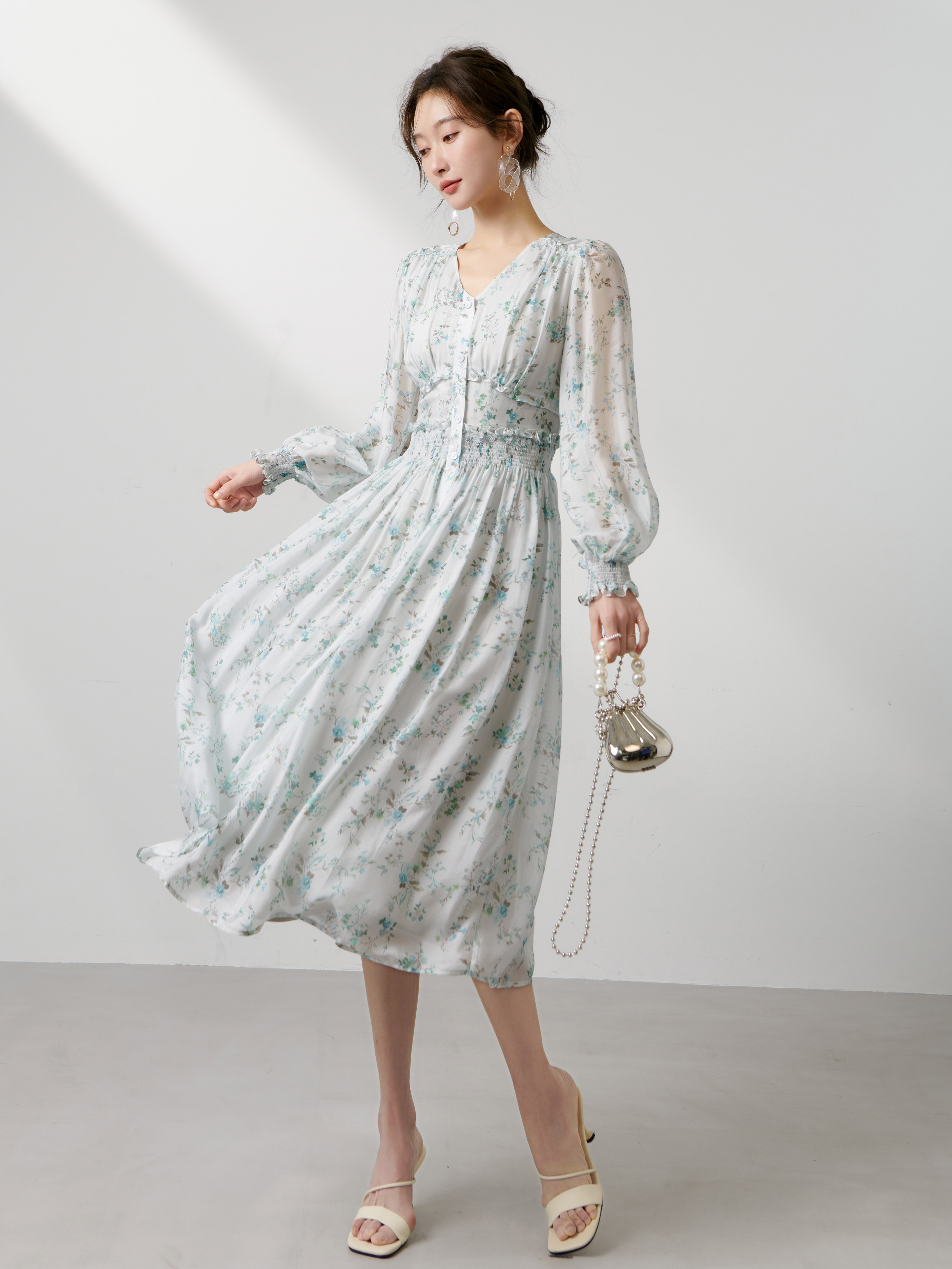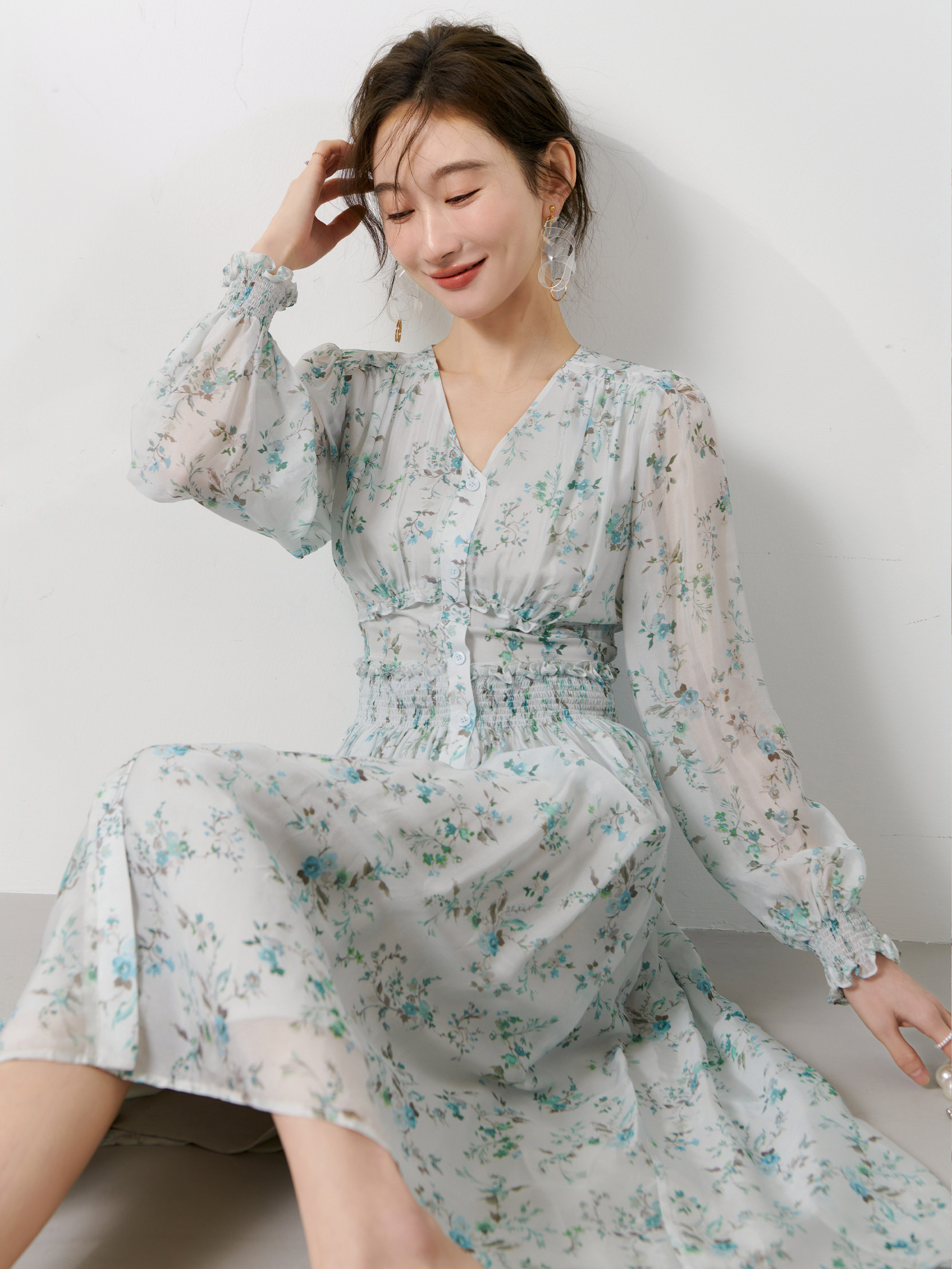 Шелковое шифоновое весеннее платье, V-образный вырез, 2023
