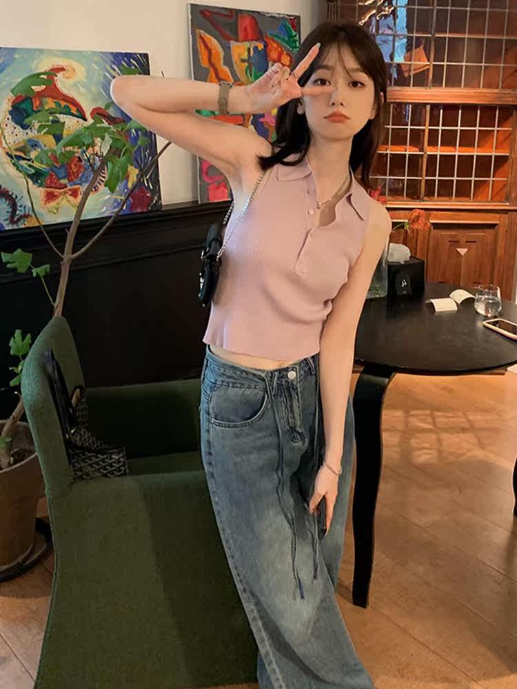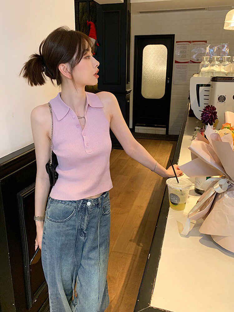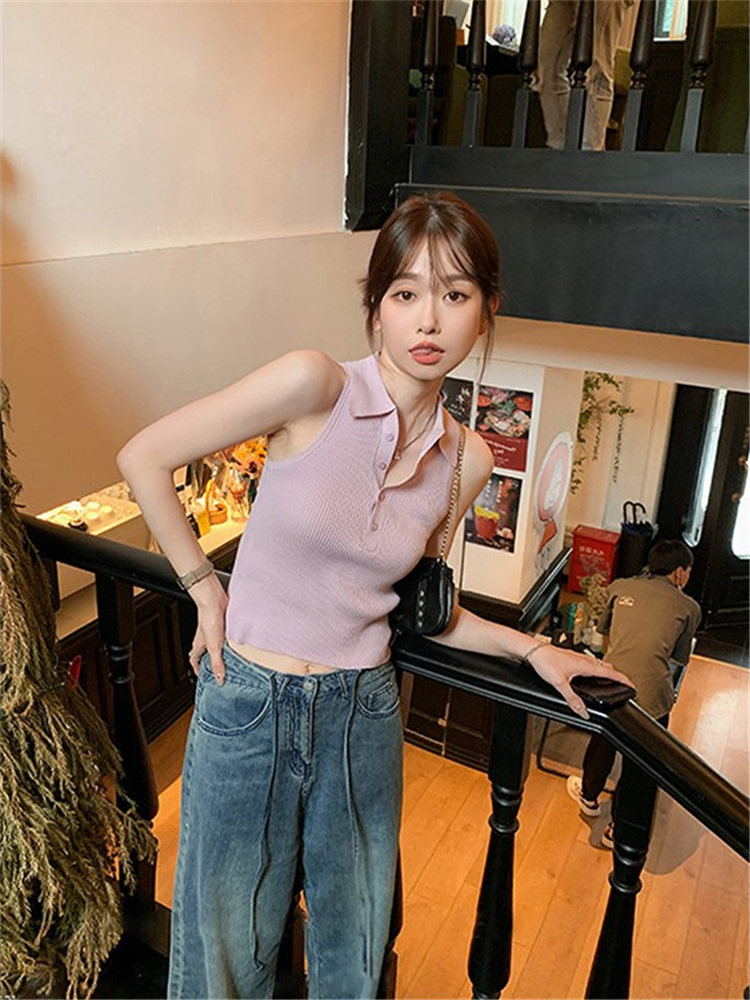 Сиреневая майка топ без рукавов, короткая футболка с коротким рукавом, жилет, воротник поло, облегающий крой