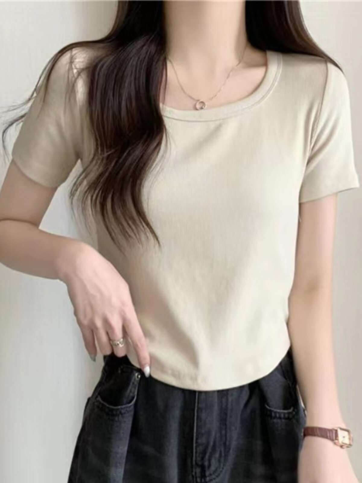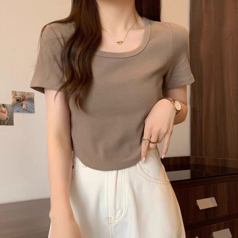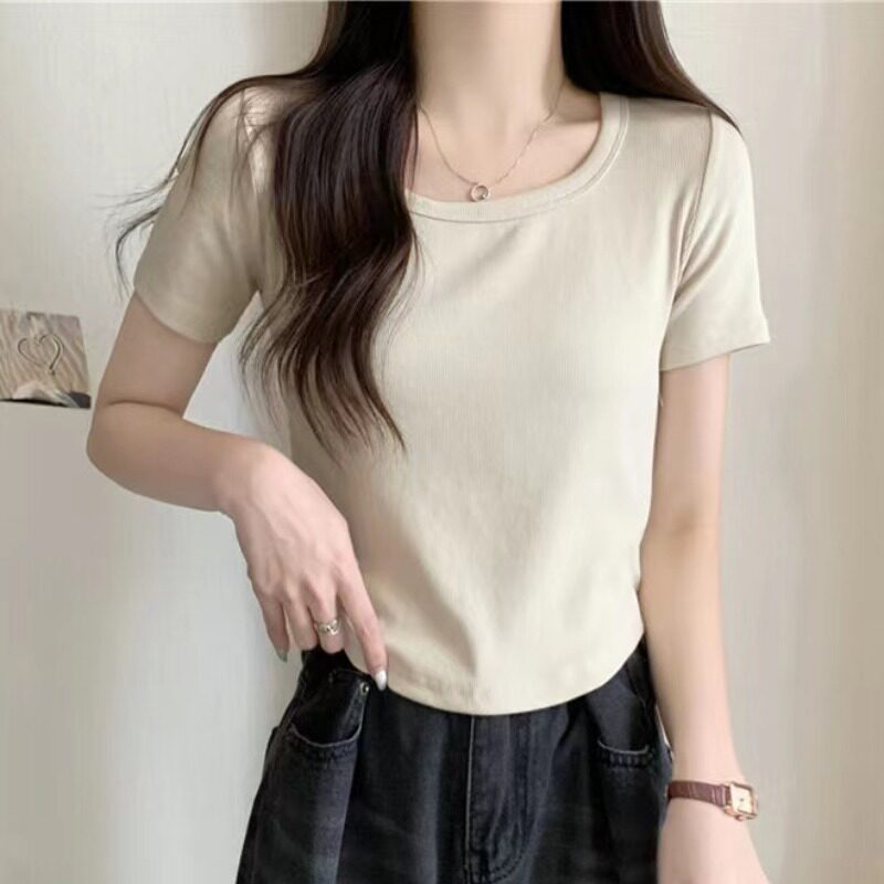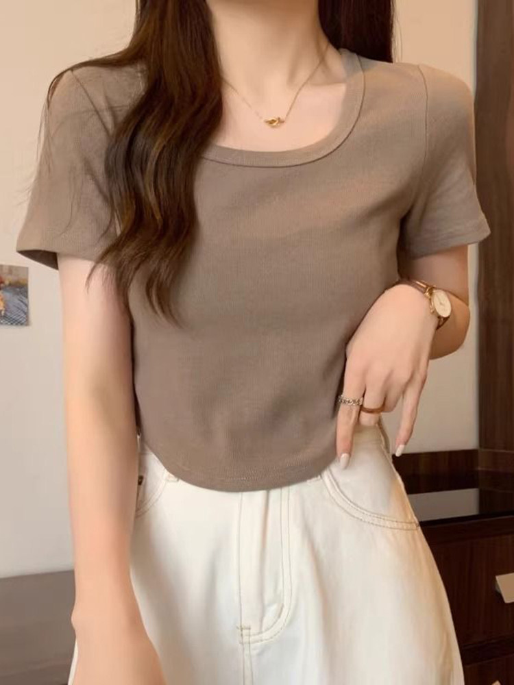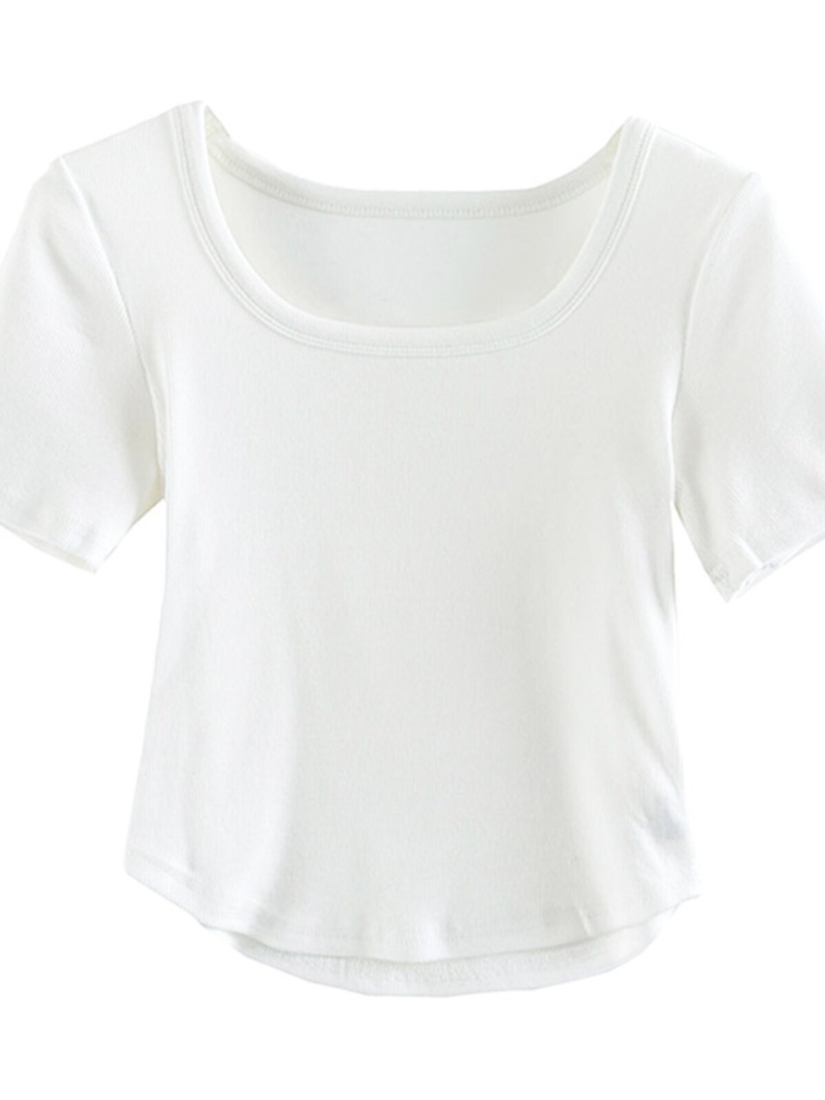 Белая весенняя однотонная короткая футболка, квадратный вырез