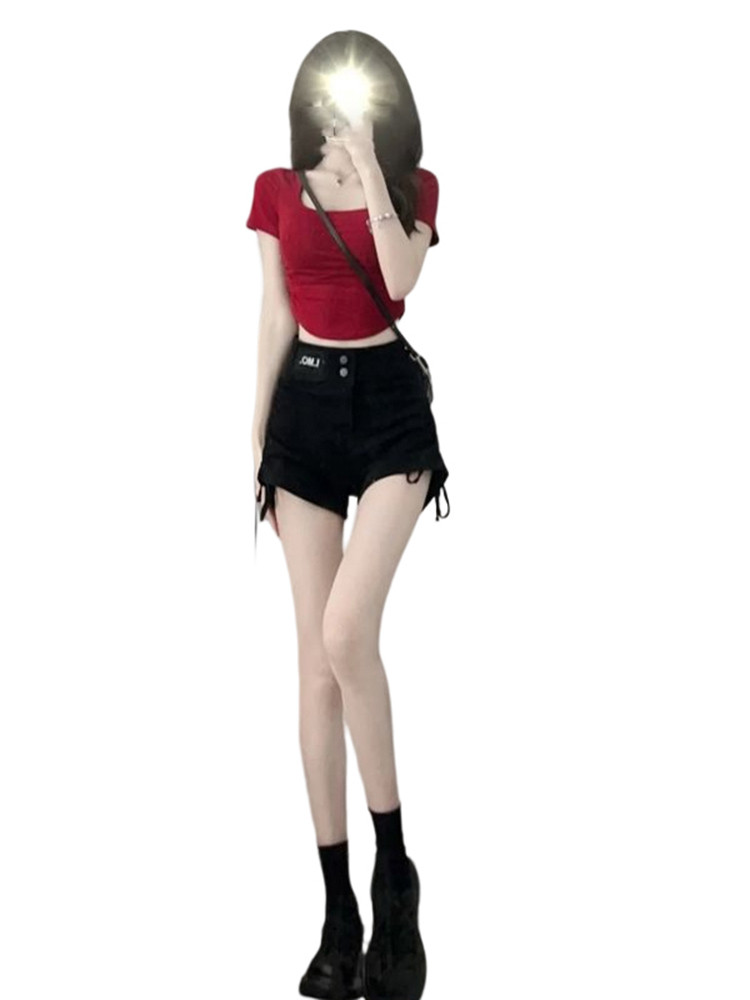 Красная сексуальная летняя базовая футболка с коротким рукавом, французский стиль, короткий рукав, в обтяжку
