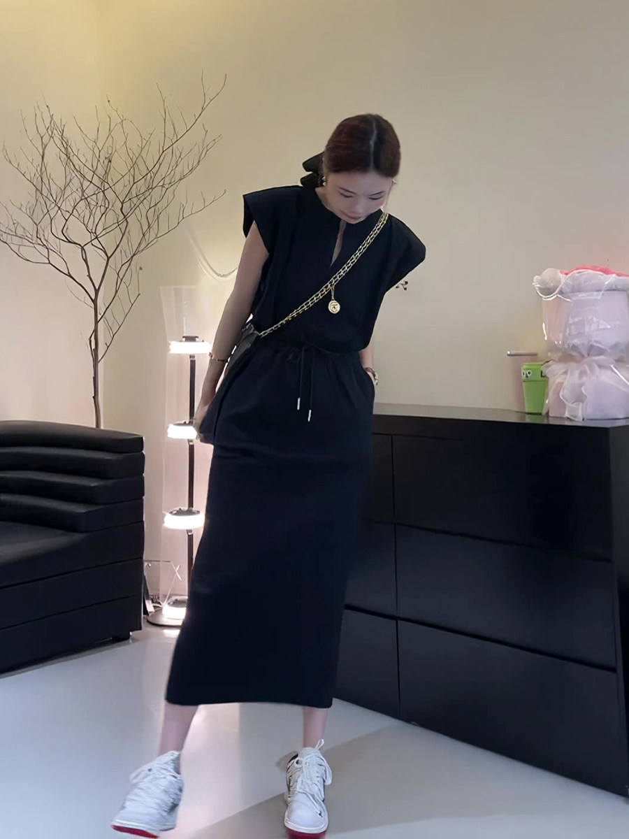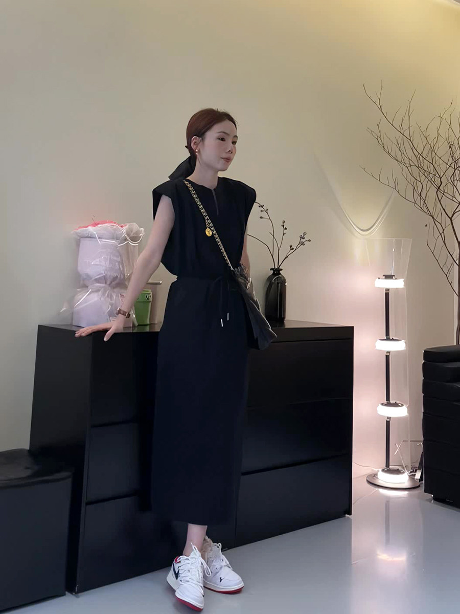 Черное приталенное летнее платье без рукавов, юбка для отдыха, в корейском стиле, изысканный стиль, на шнурках, высокая талия