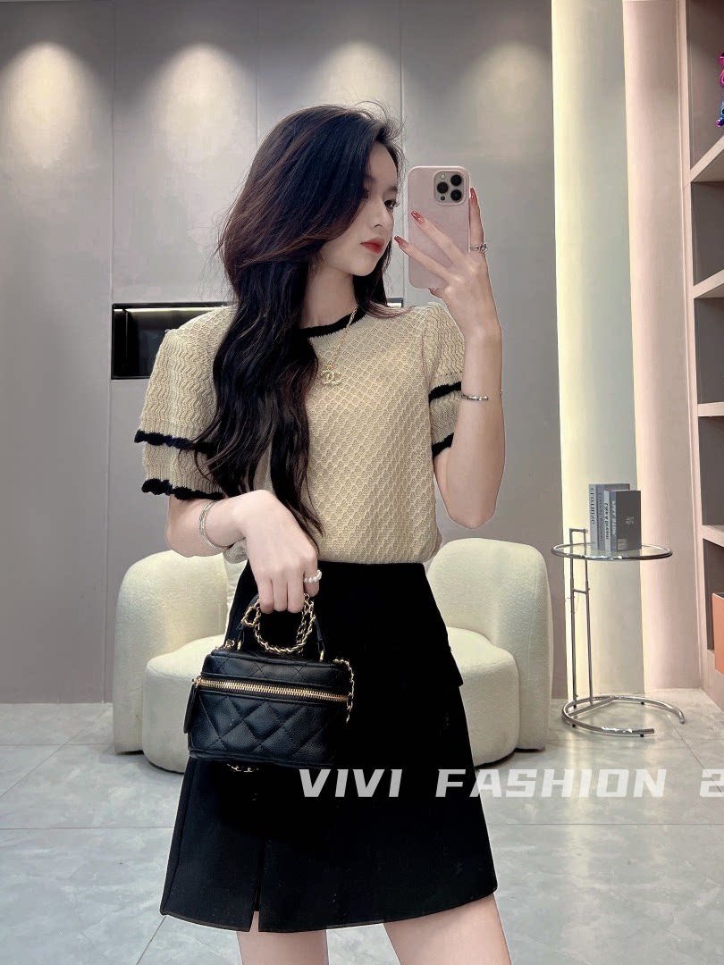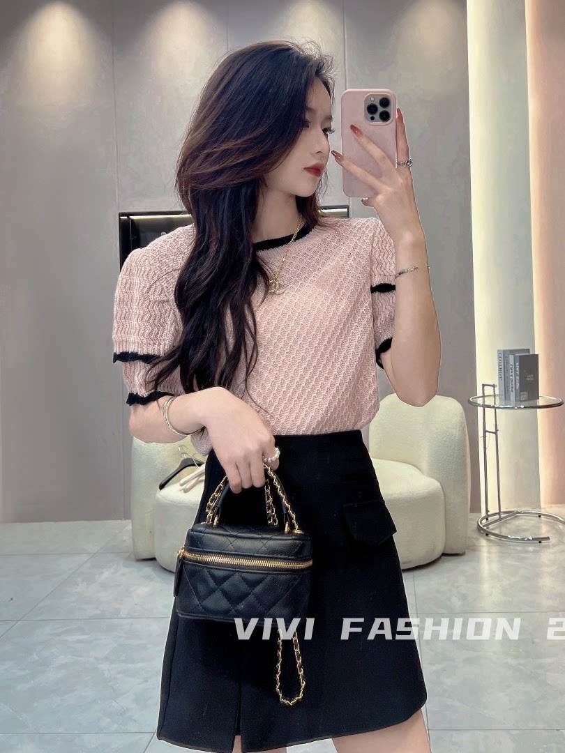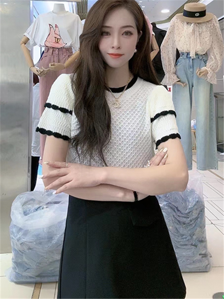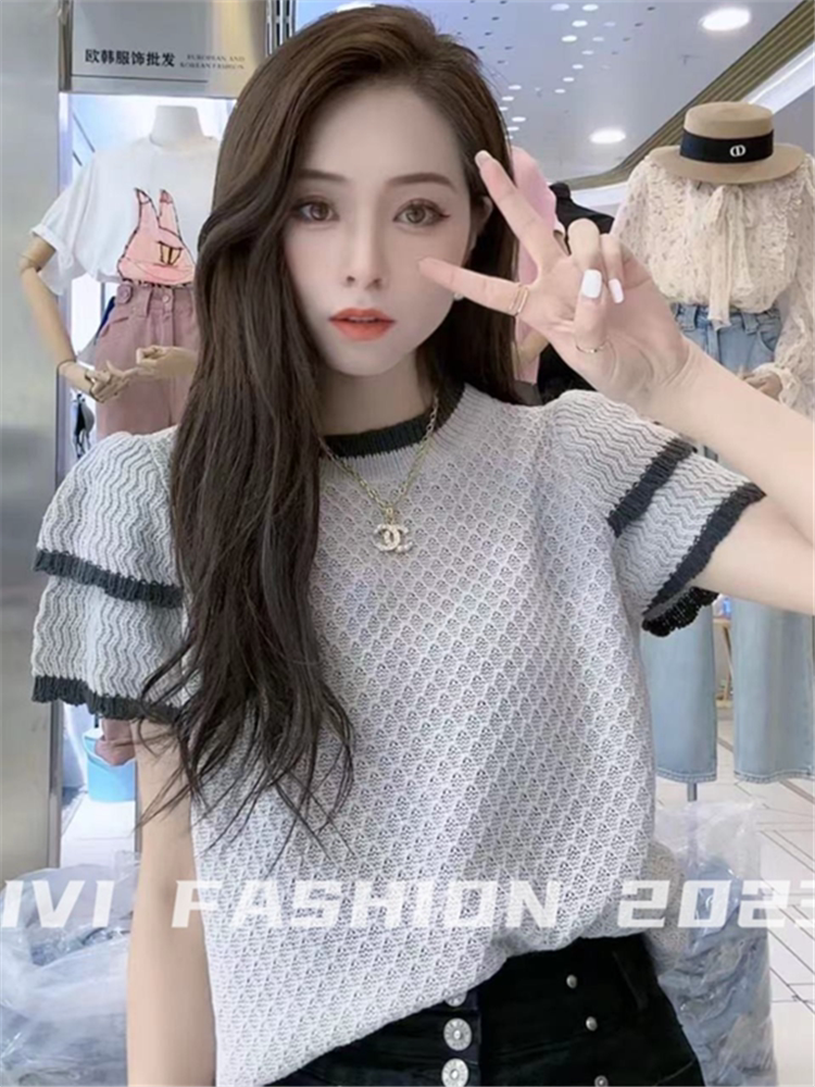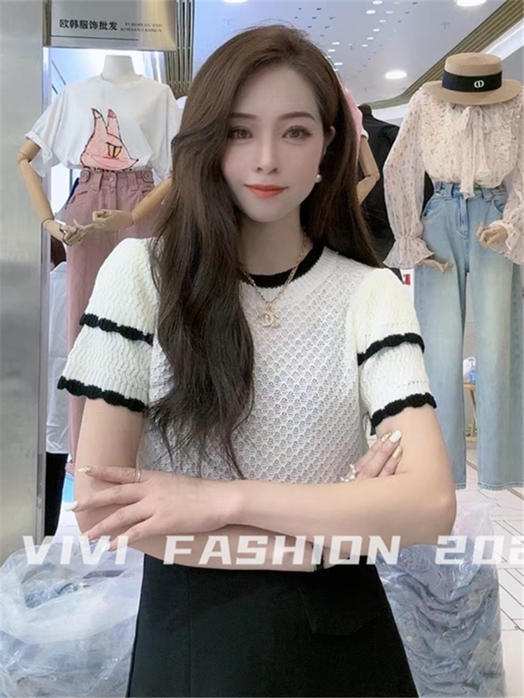 Летний трикотажный свитер с круглым воротником, футболка, короткий рукав, 2023, французский стиль
