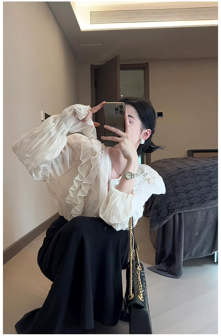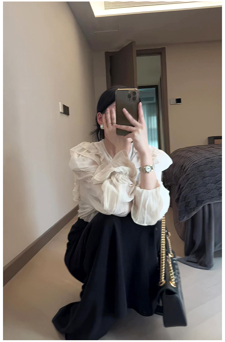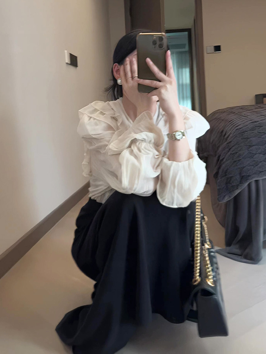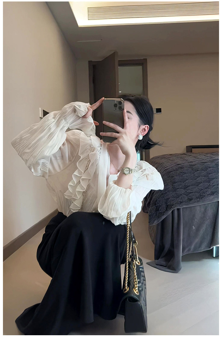 Тонкий ремень, шифоновая цветная осенняя рубашка, французский стиль, V-образный вырез, свободный крой, городской стиль