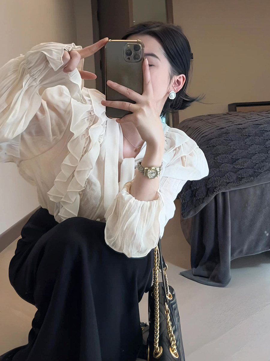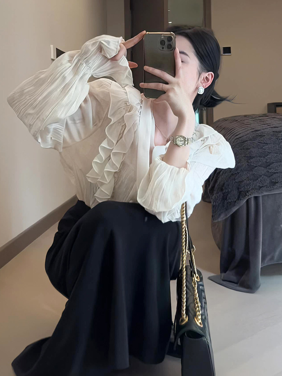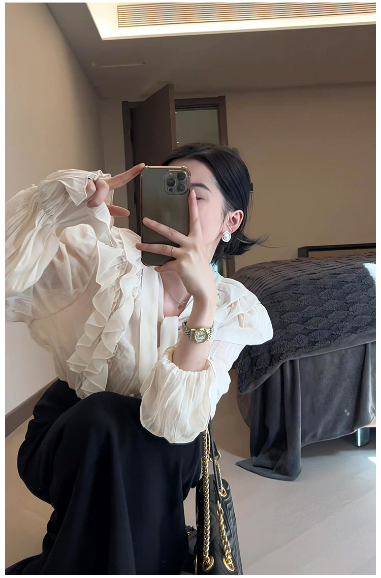 Тонкий ремень, шифоновая цветная осенняя рубашка, французский стиль, V-образный вырез, свободный крой, городской стиль