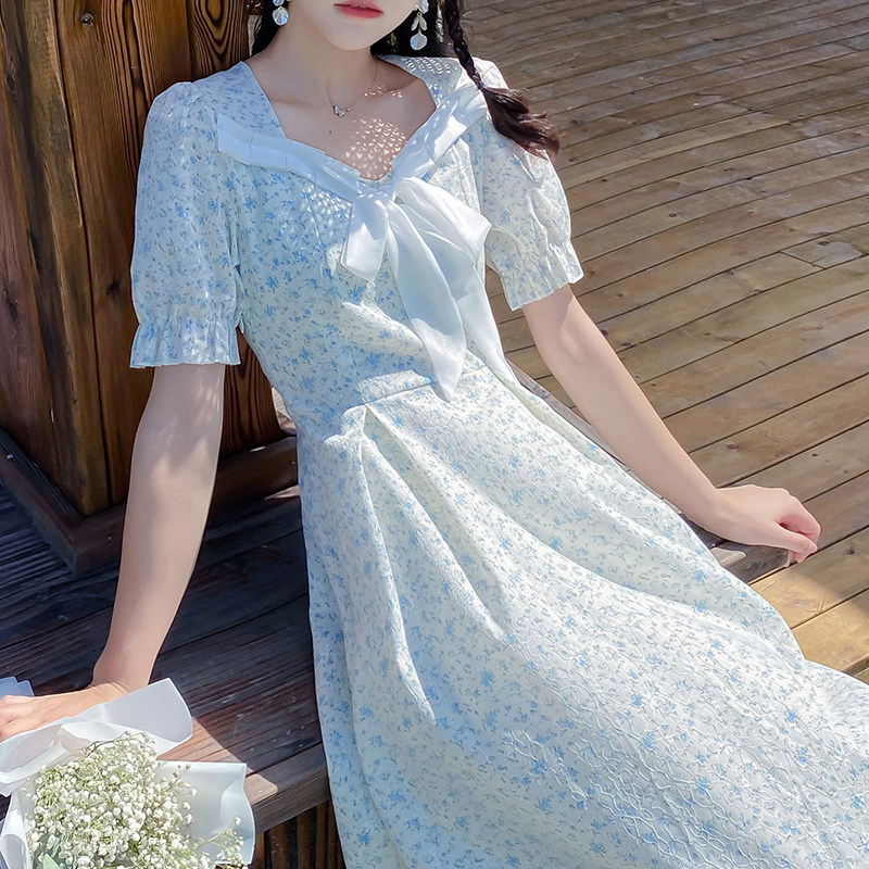 Шифоновое платье, летняя длинная юбка, цветочный принт, подходит для подростков, французский стиль, квадратный вырез