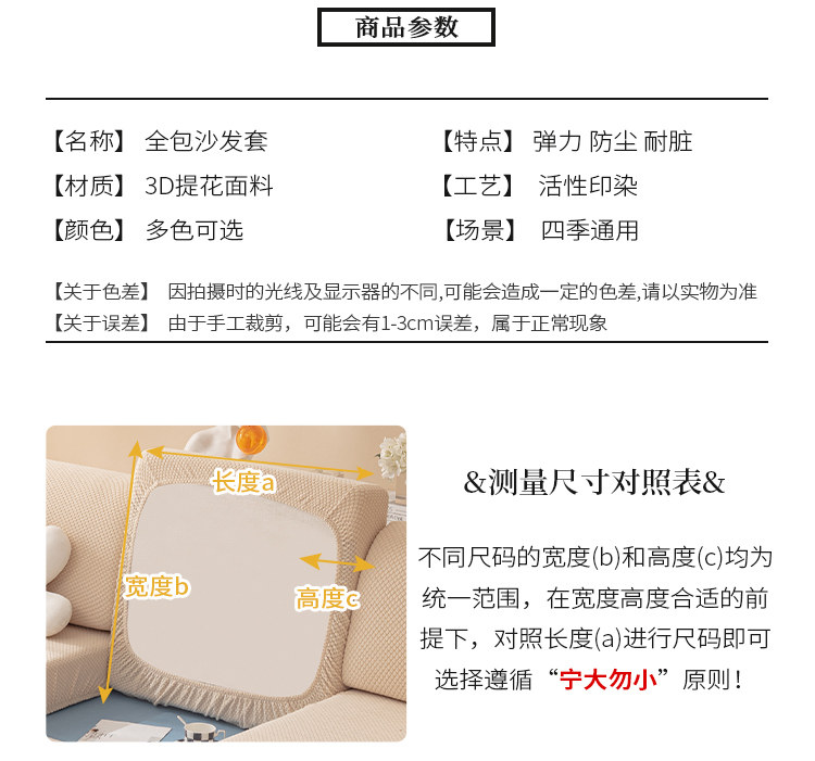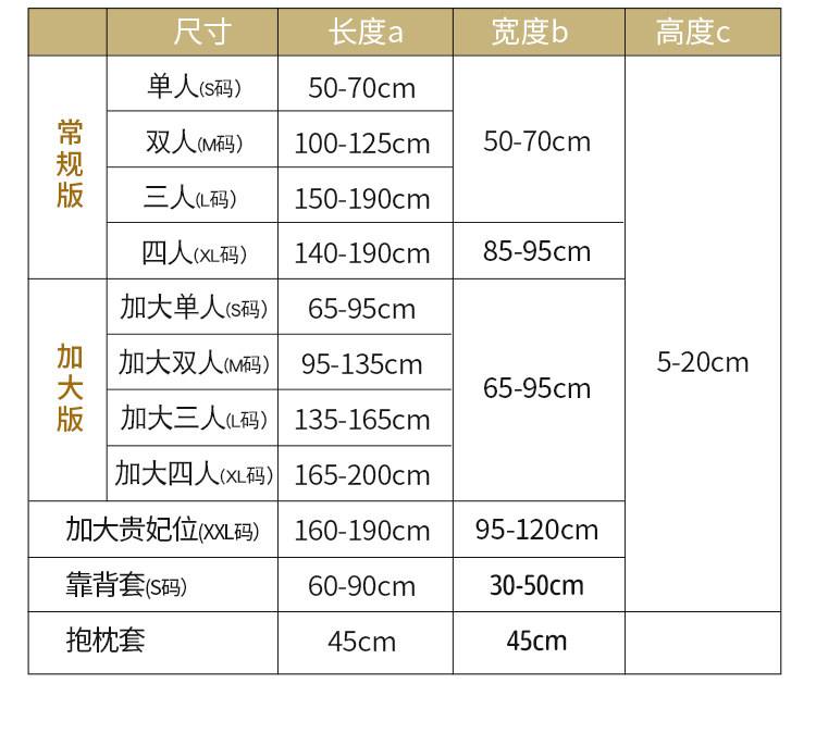 | Размер: | [大单人S码【宽65-85cm,长65-85cm】], [大单人M码【宽65-85cm,长85-135cm】], [双人位L码【宽65-85cm,长135-165cm】], [三人位XL码【宽65-85cm,长165-200cm】], [加大贵妃/不分左右【宽95-120cm,长160-190cm】], [靠头s码【宽30-40cm,长60-80cm】], [靠背M码【宽50-65cm,长80-100cm】], [同款抱枕套45*45cm【不含芯】] |