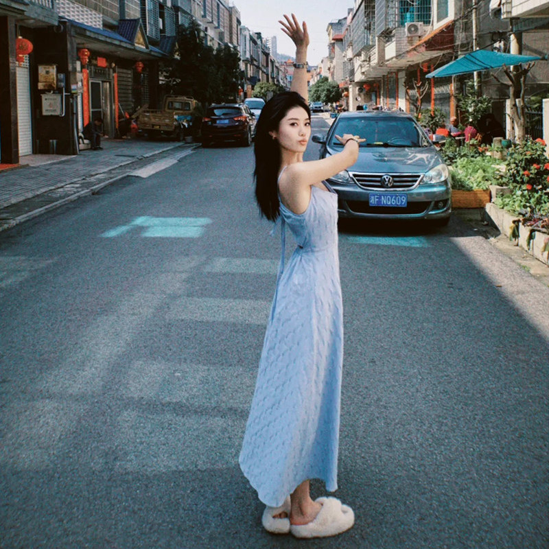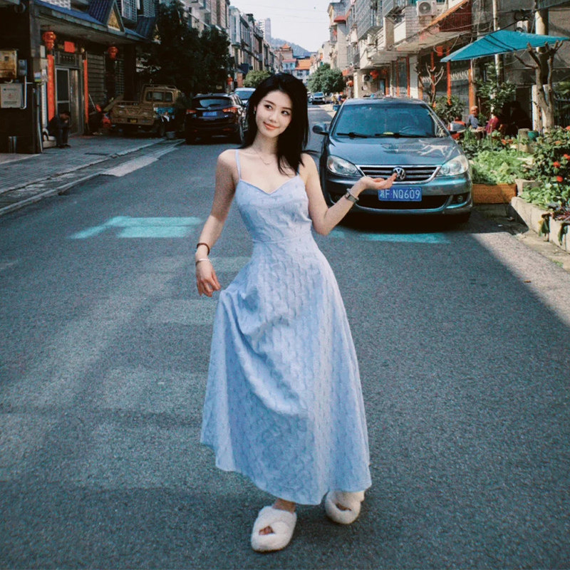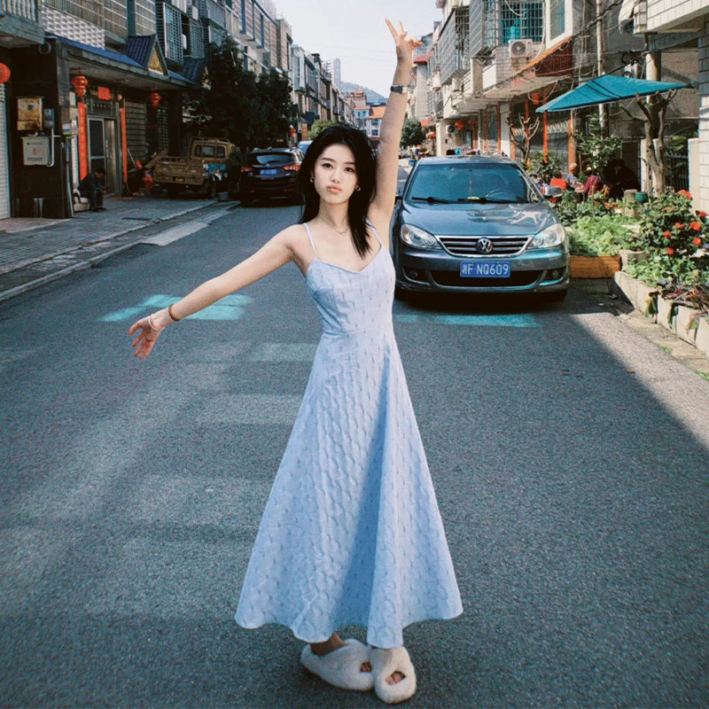 Синее летнее платье без рукавов, длинная юбка, подходит для подростков, с открытой спиной, французский стиль