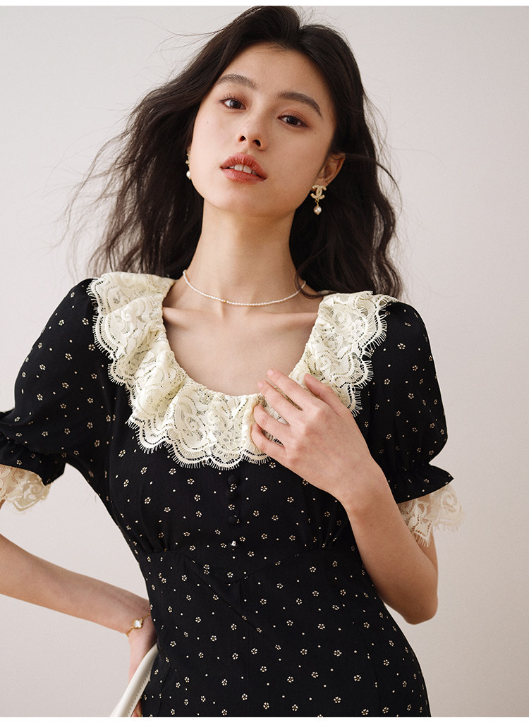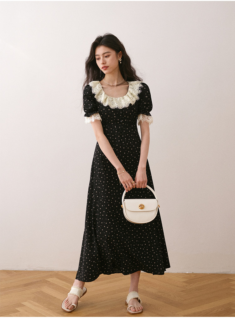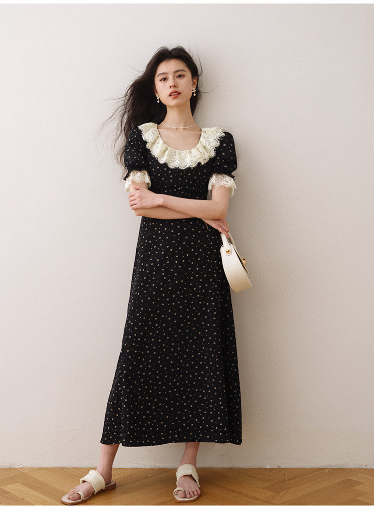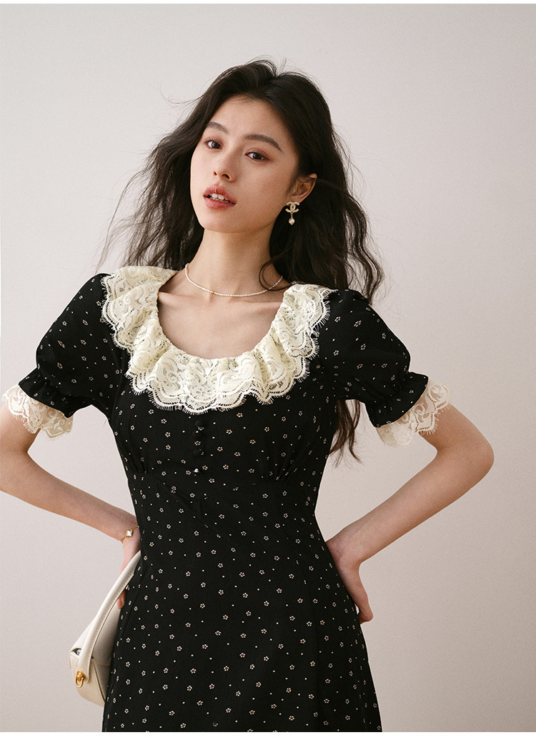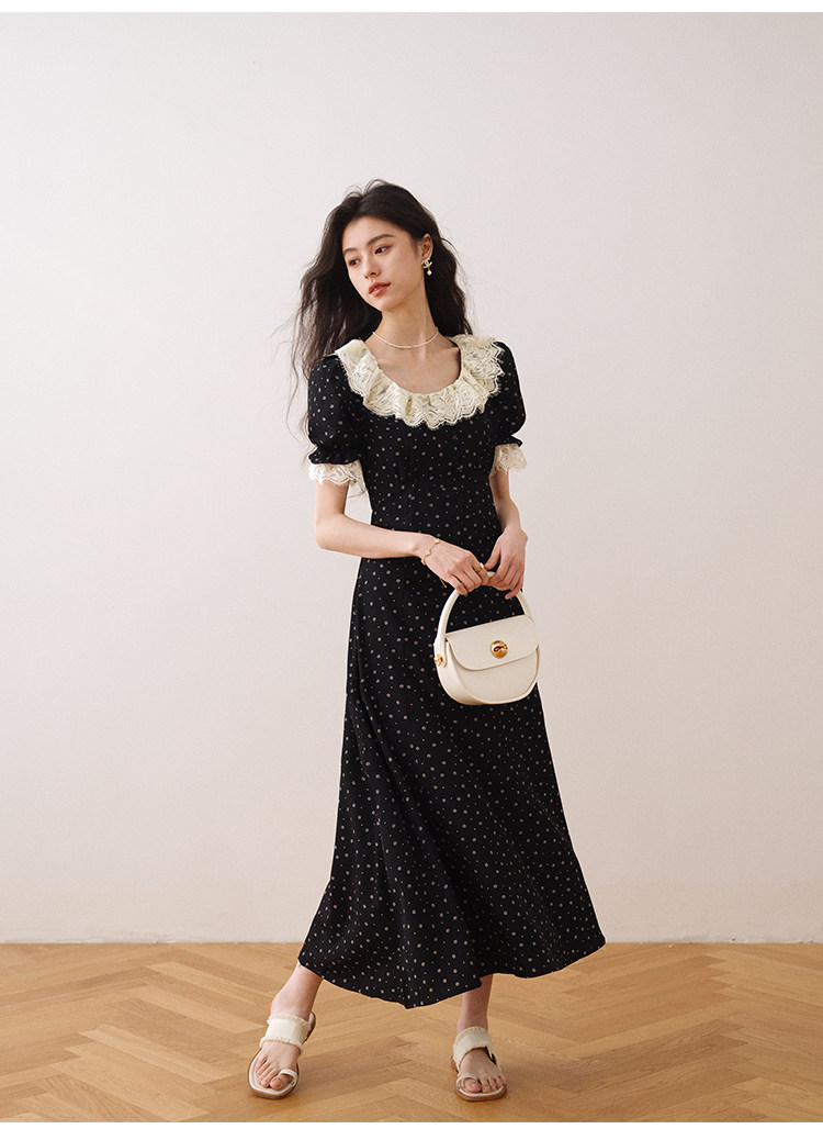 Летнее платье, длинная черная юбка, французский стиль, в цветочек, средней длины, короткий рукав