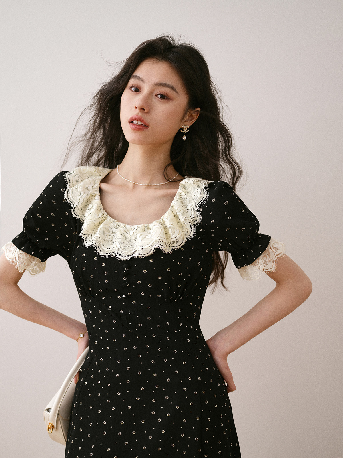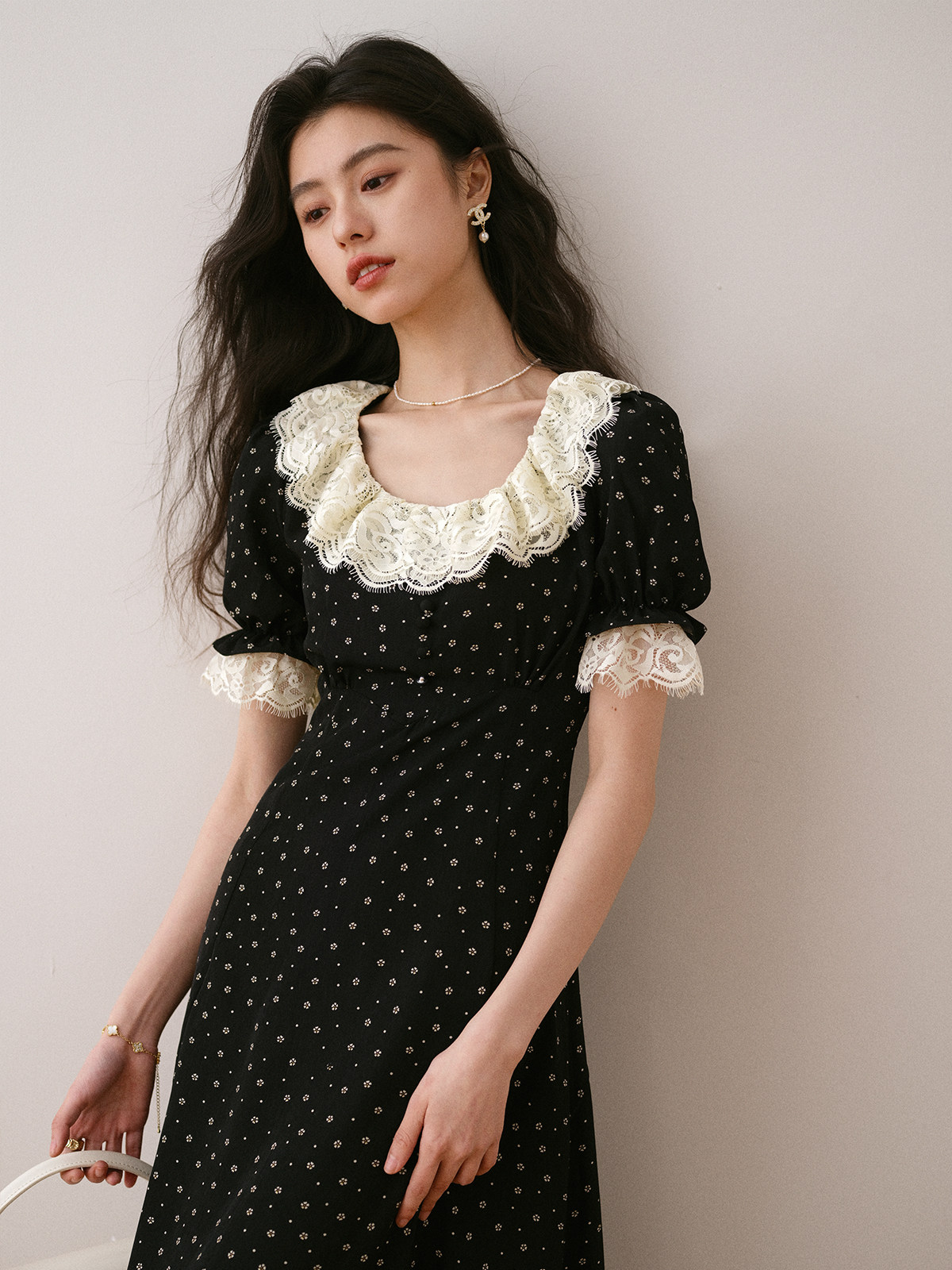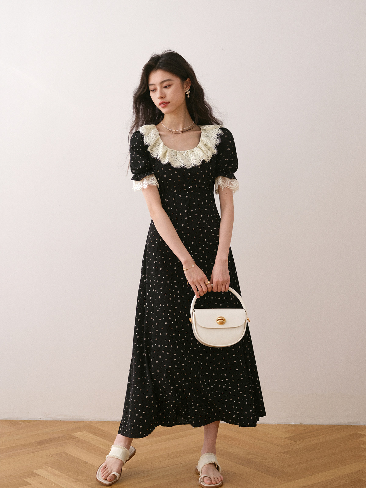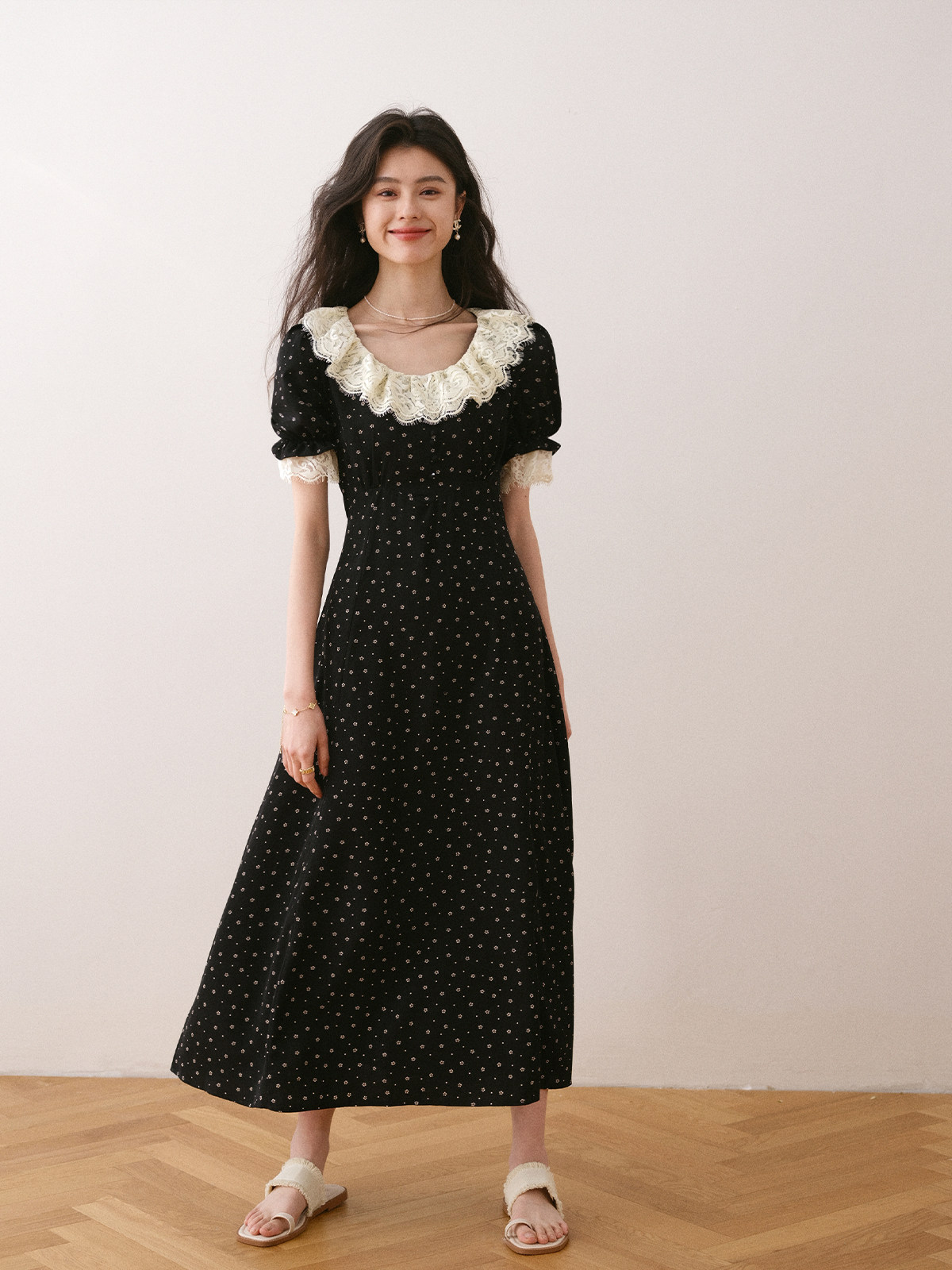 Летнее платье, длинная черная юбка, французский стиль, в цветочек, средней длины, короткий рукав