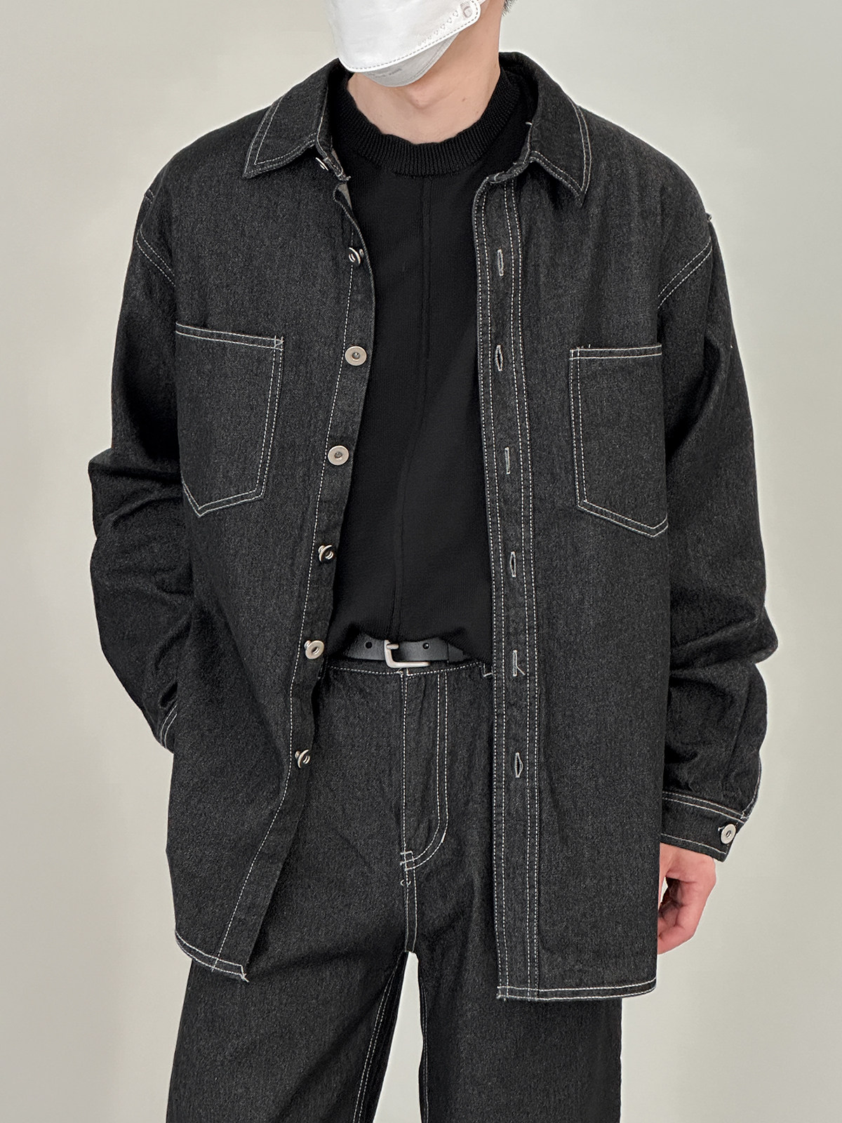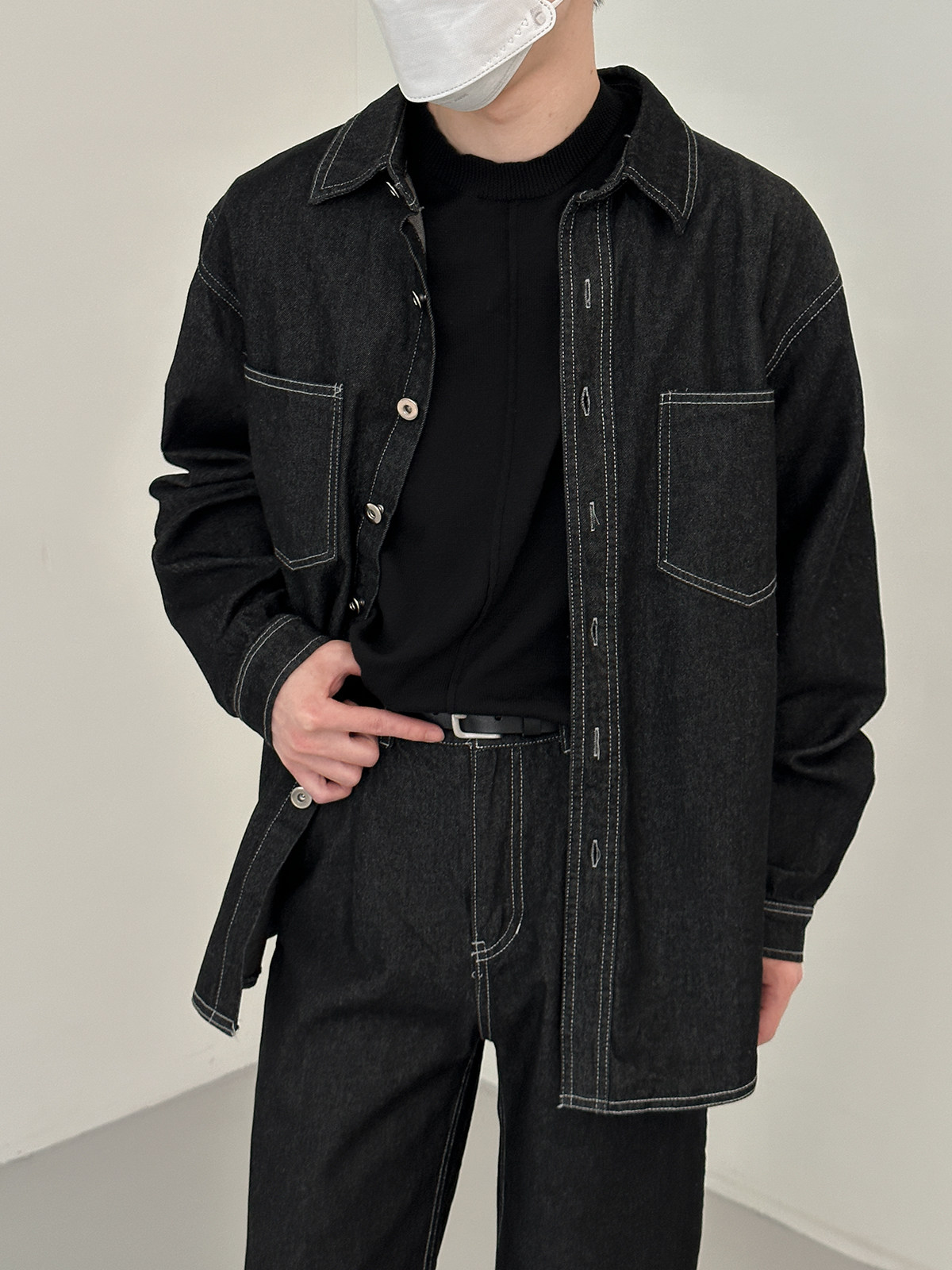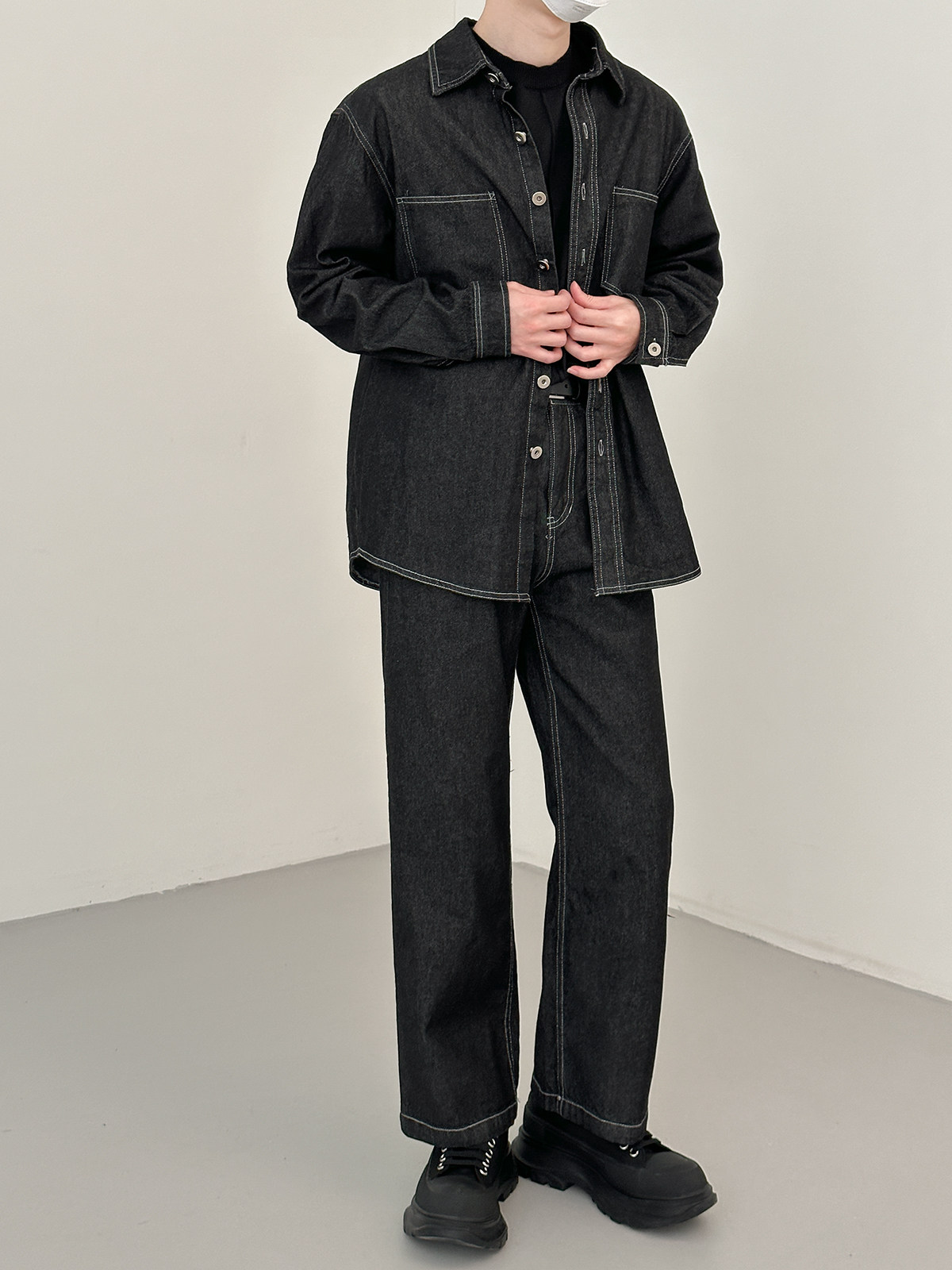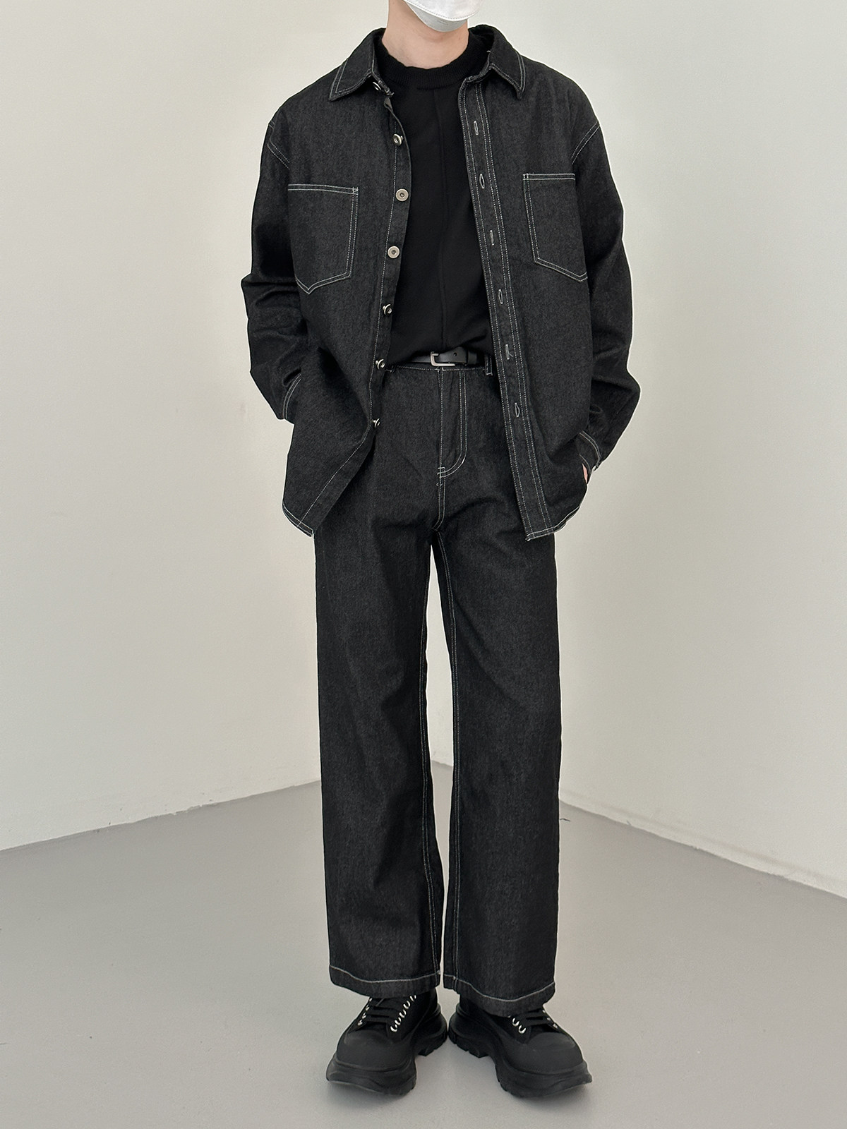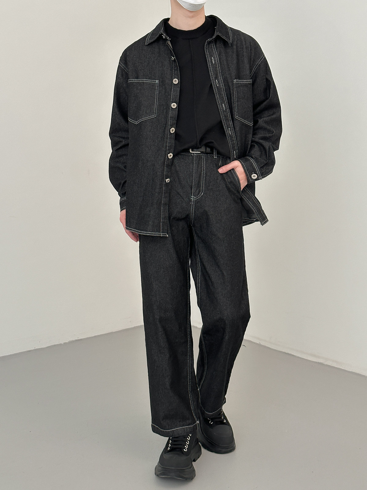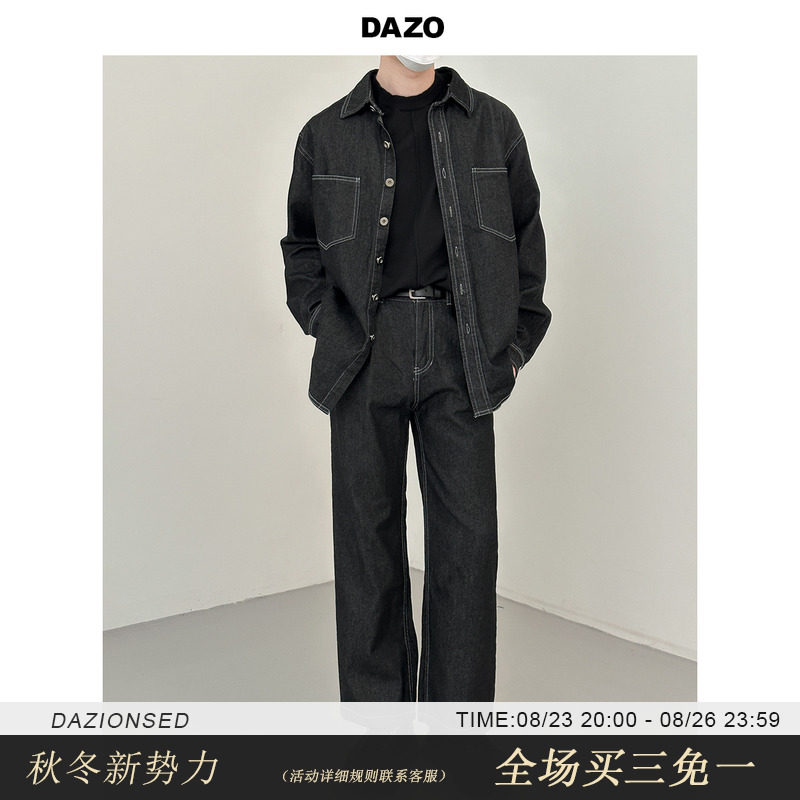Джинсовый летний комплект, черная трендовая рубашка, свободный прямой крой, в корейском стиле