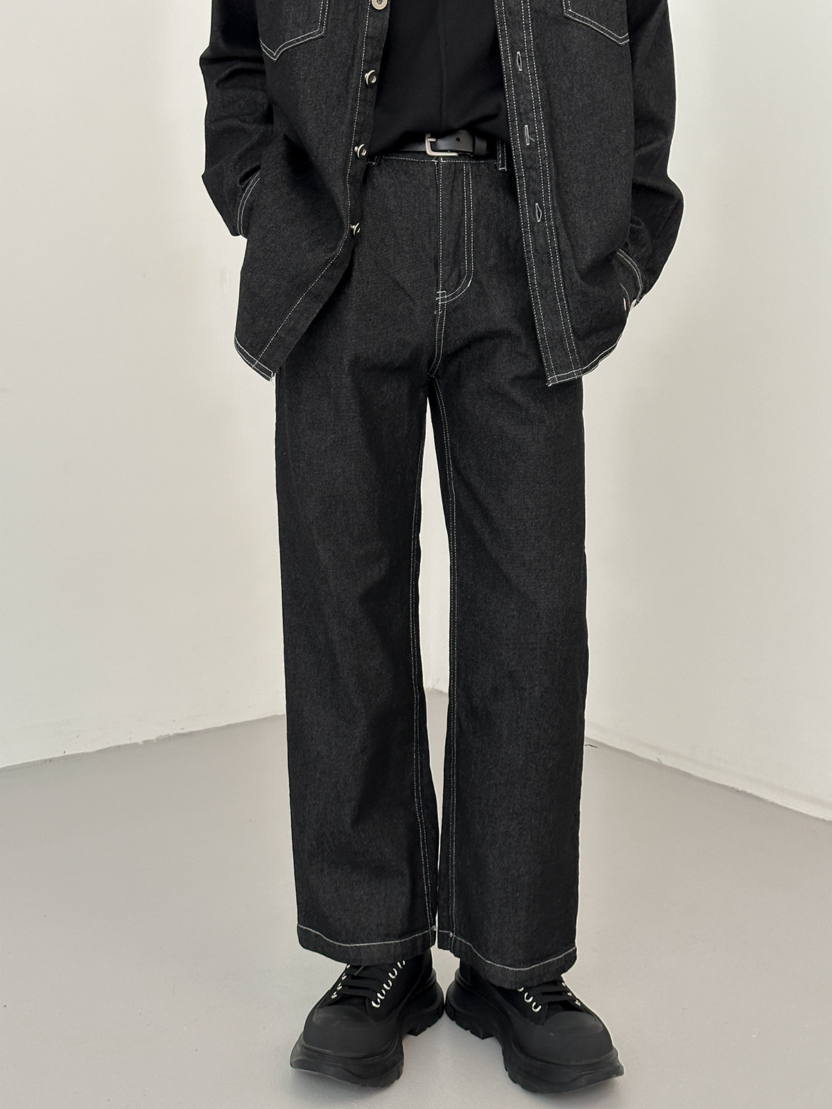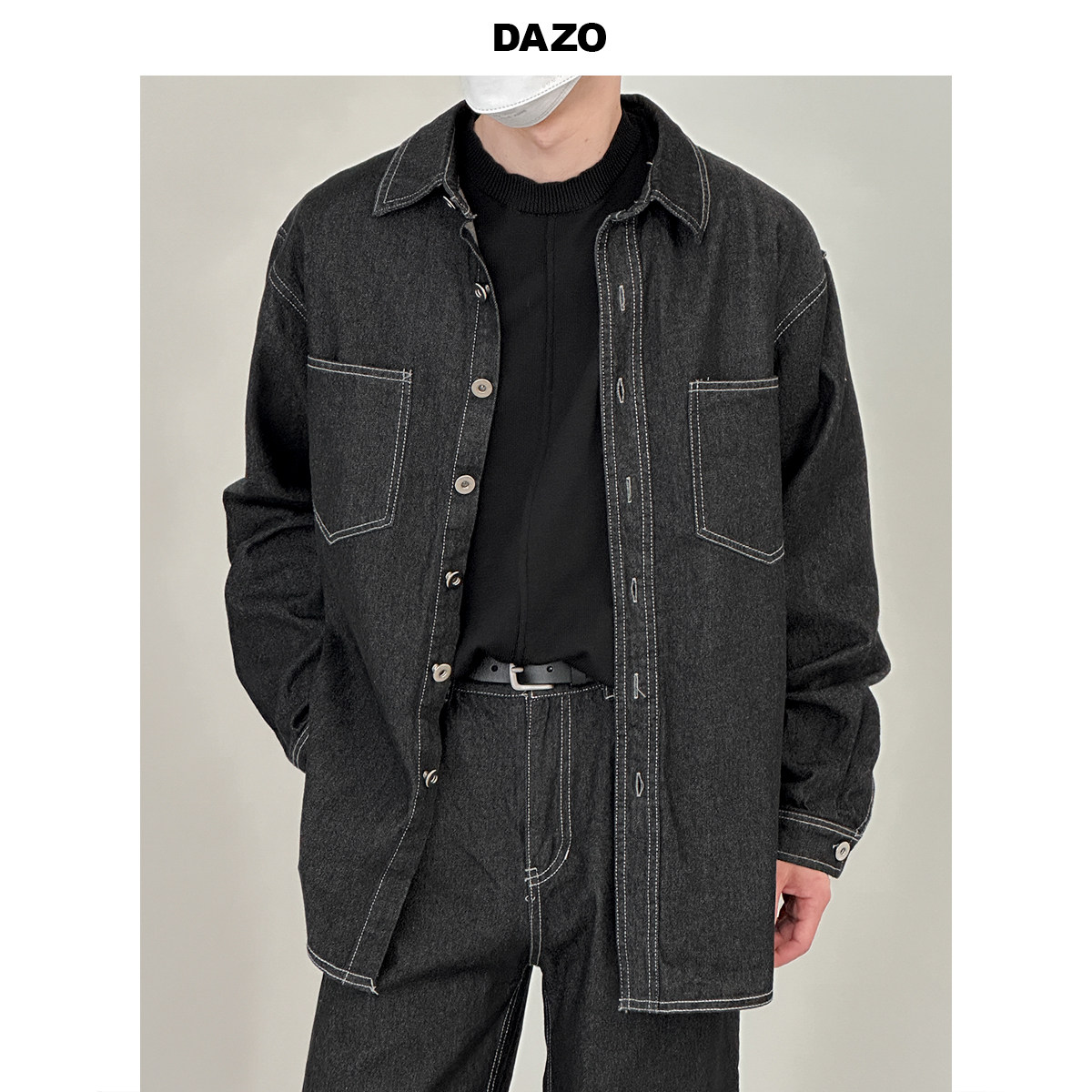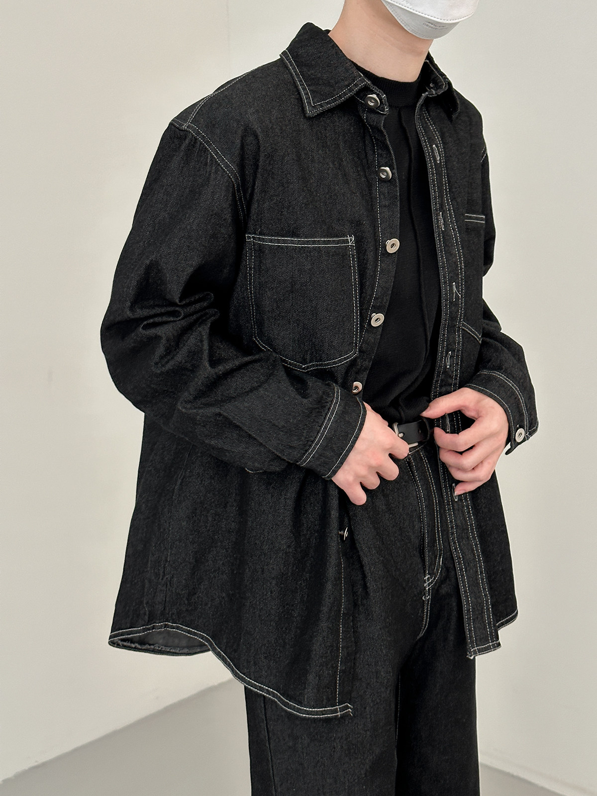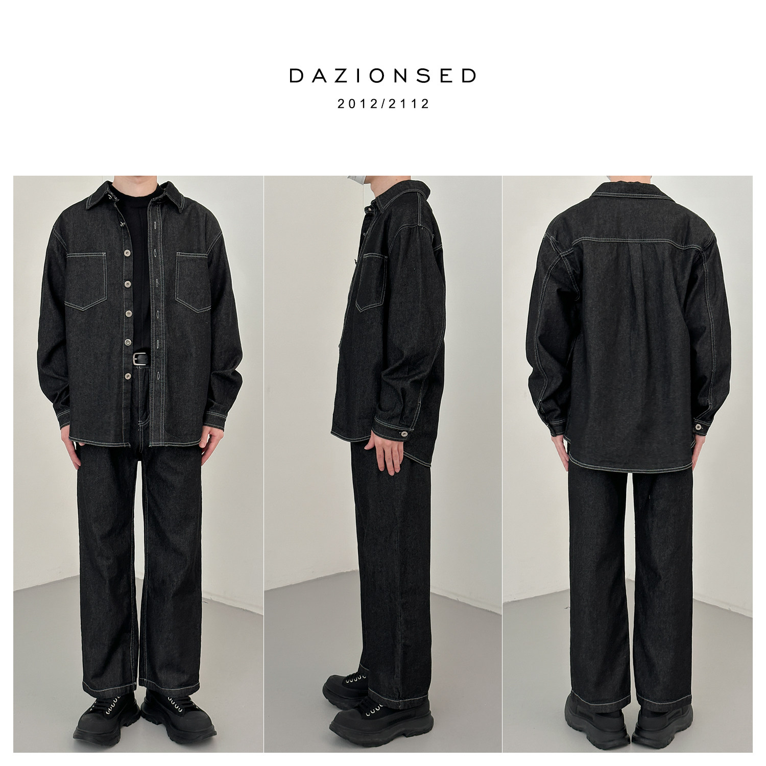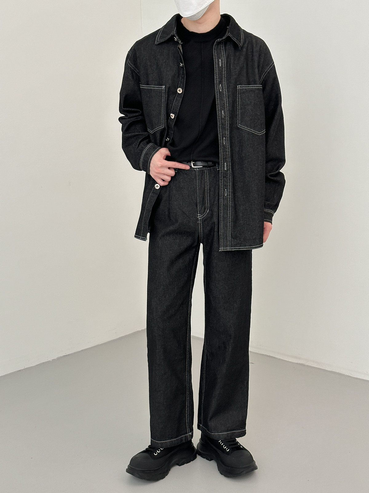 Джинсовый летний комплект, черная трендовая рубашка, свободный прямой крой, в корейском стиле