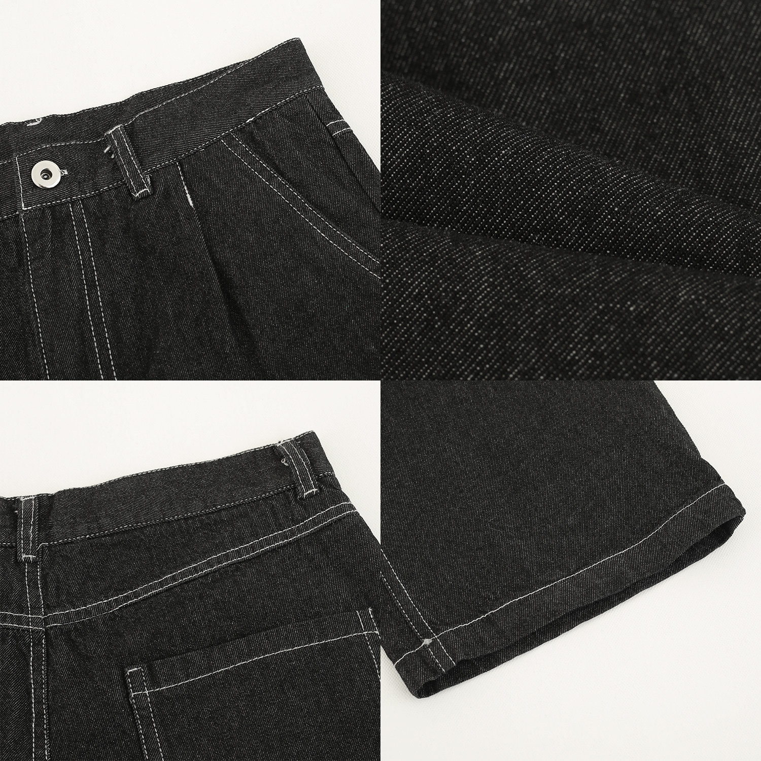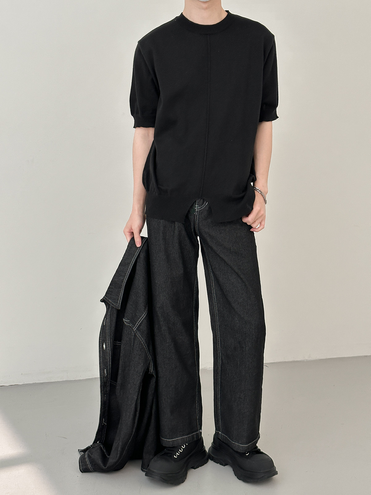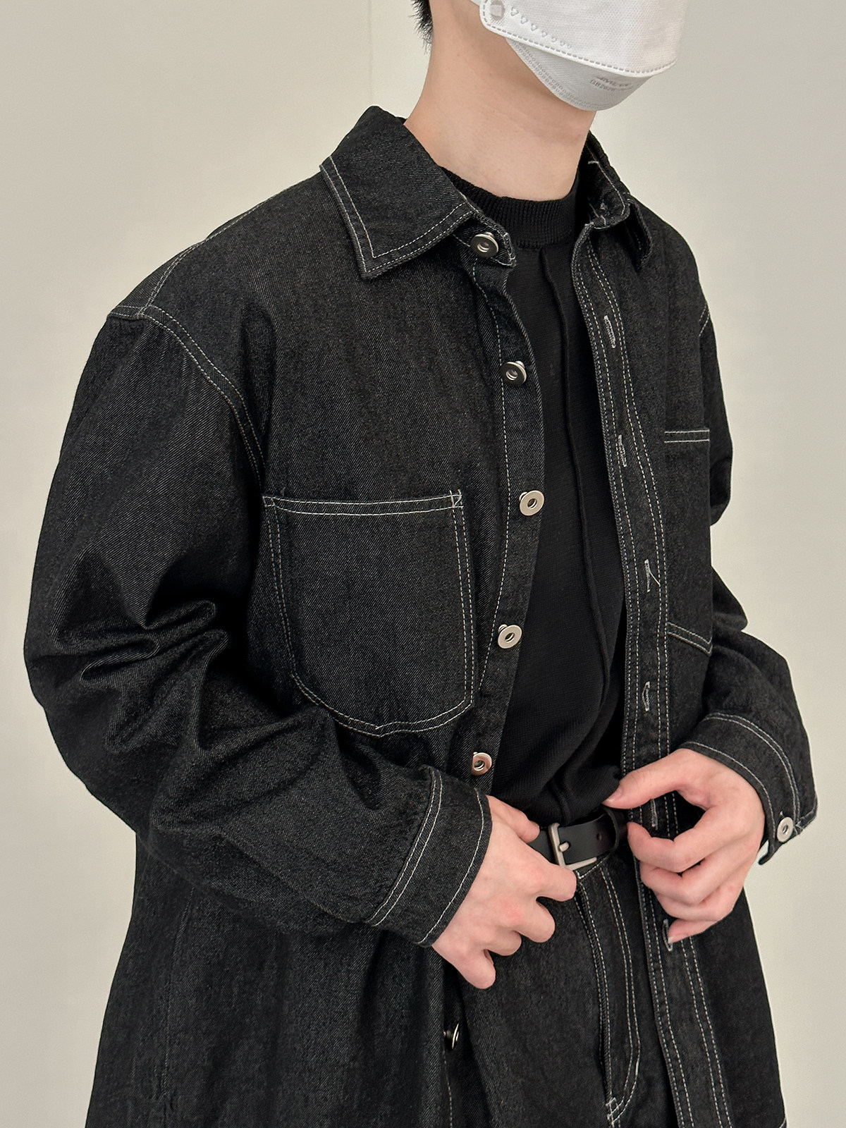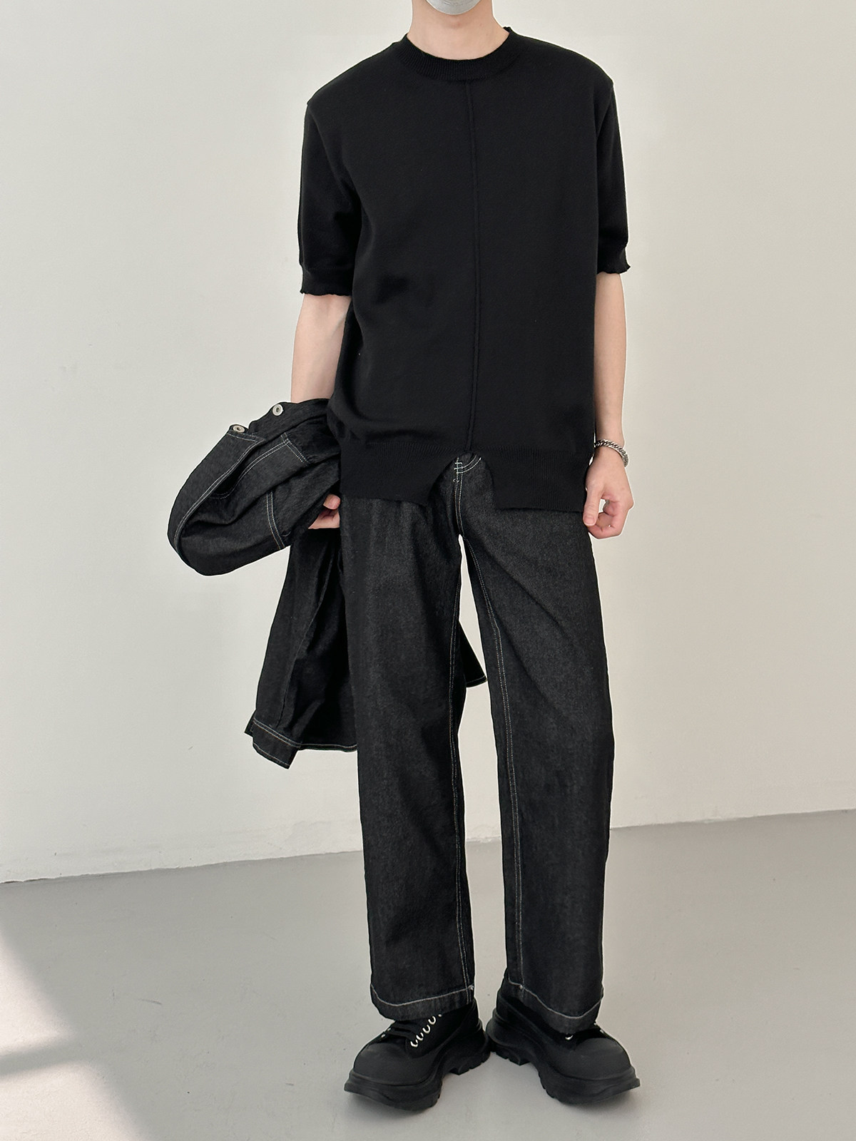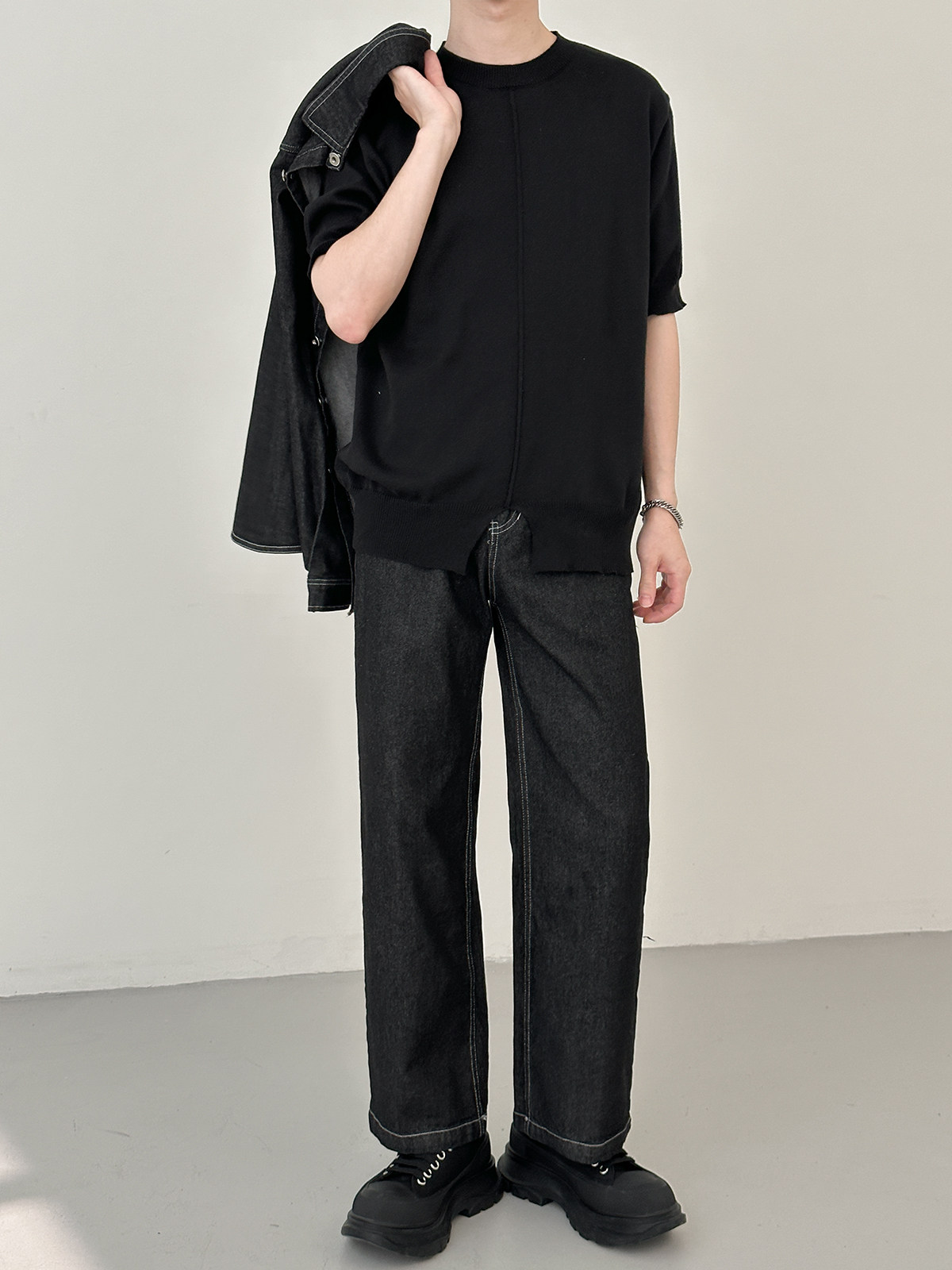 Джинсовый летний комплект, черная трендовая рубашка, свободный прямой крой, в корейском стиле