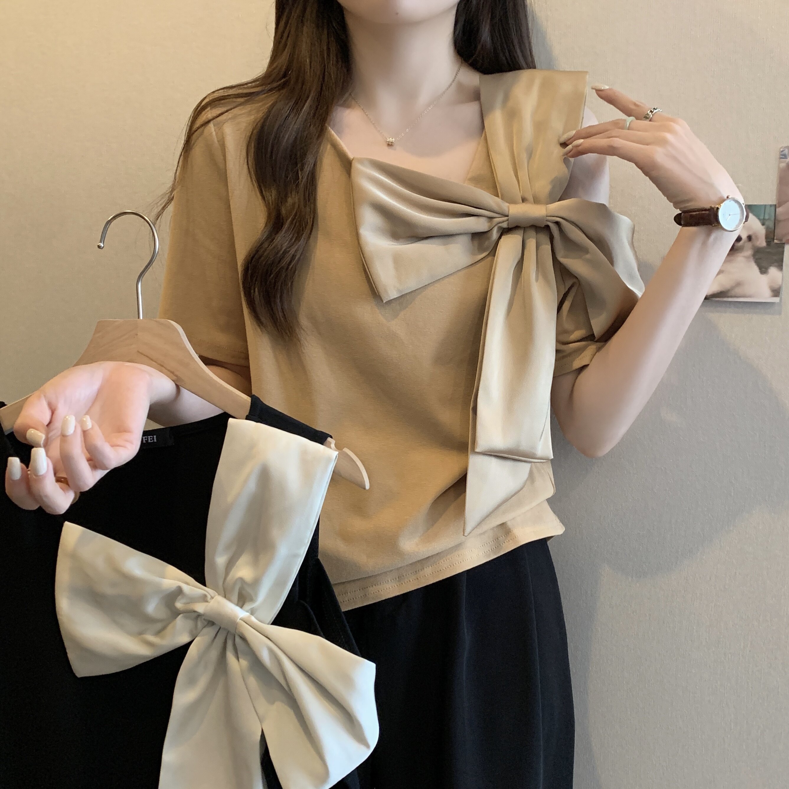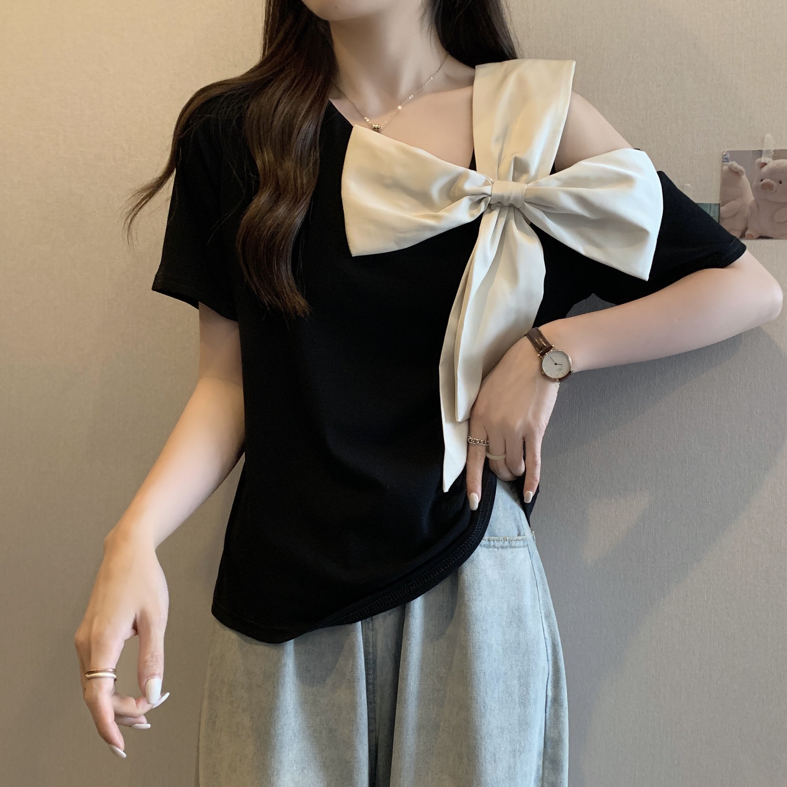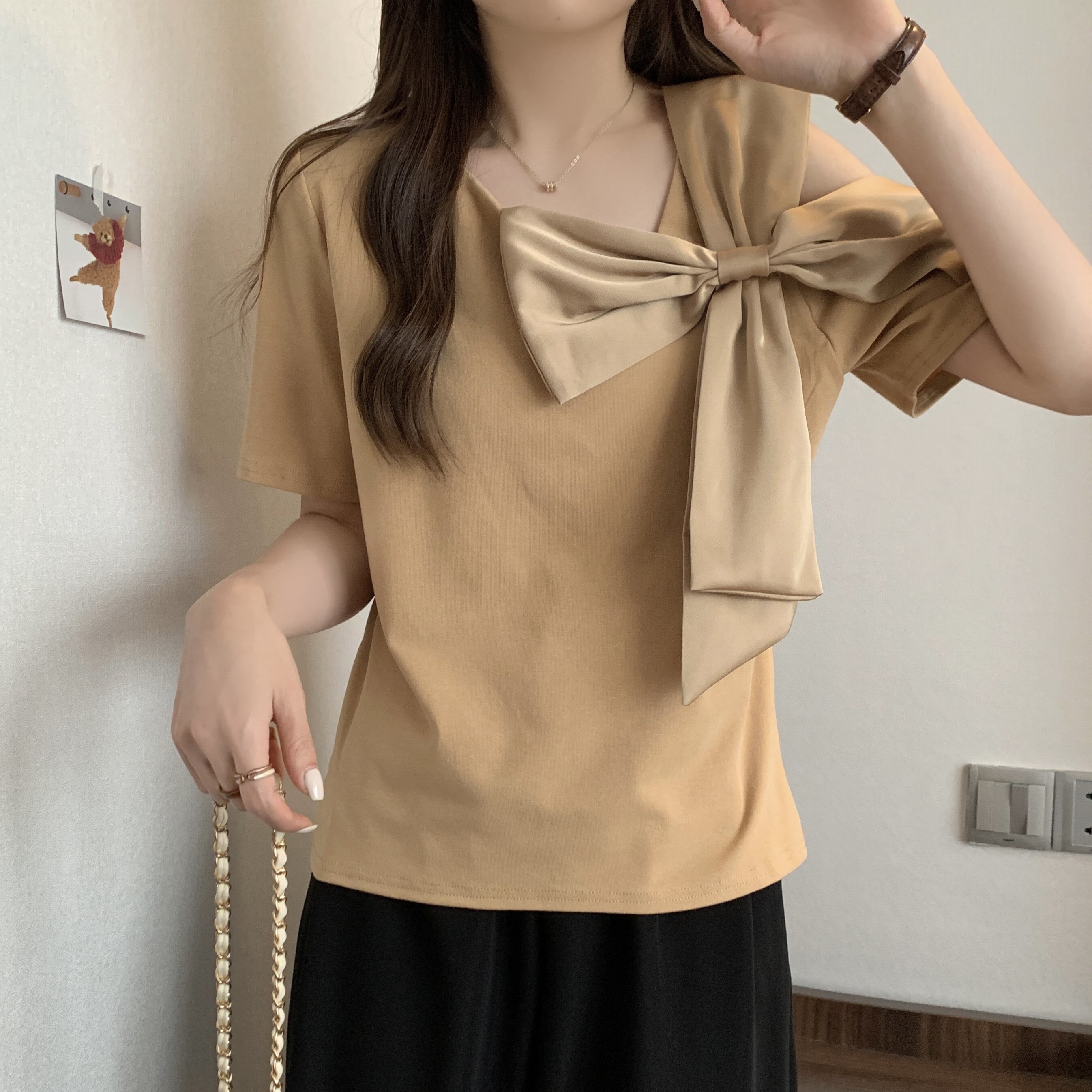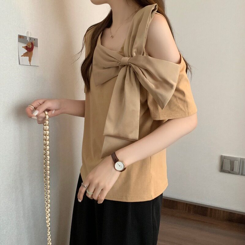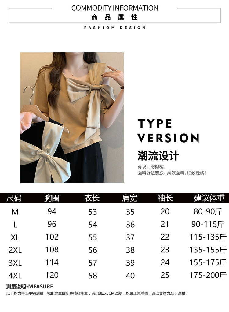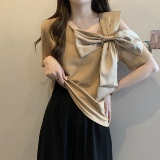 Летняя футболка с коротким рукавом с бантиком, французский стиль, большой размер, в западном стиле