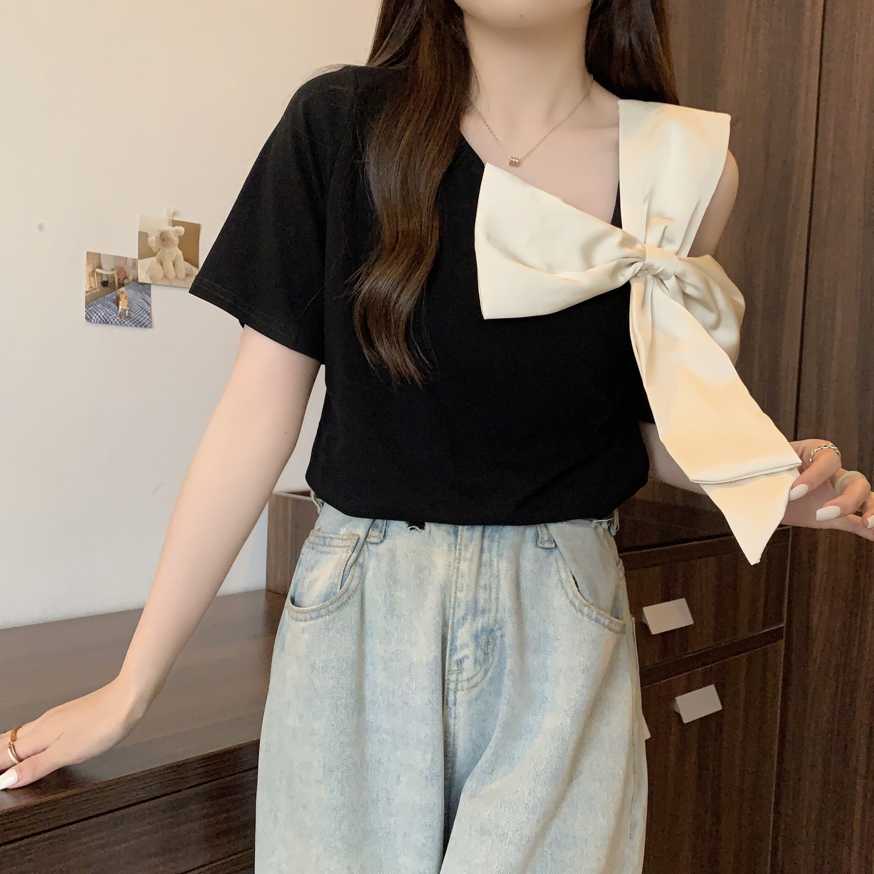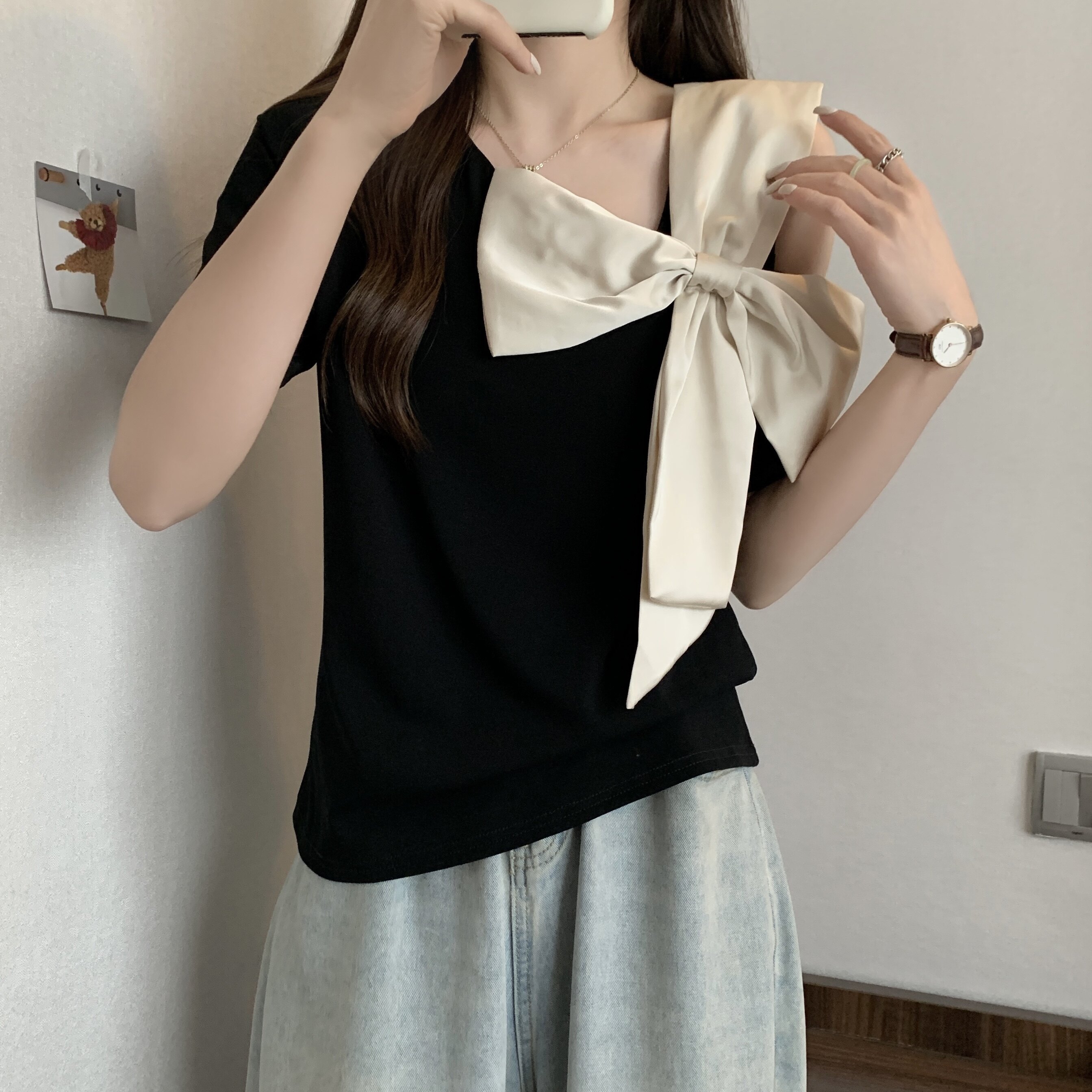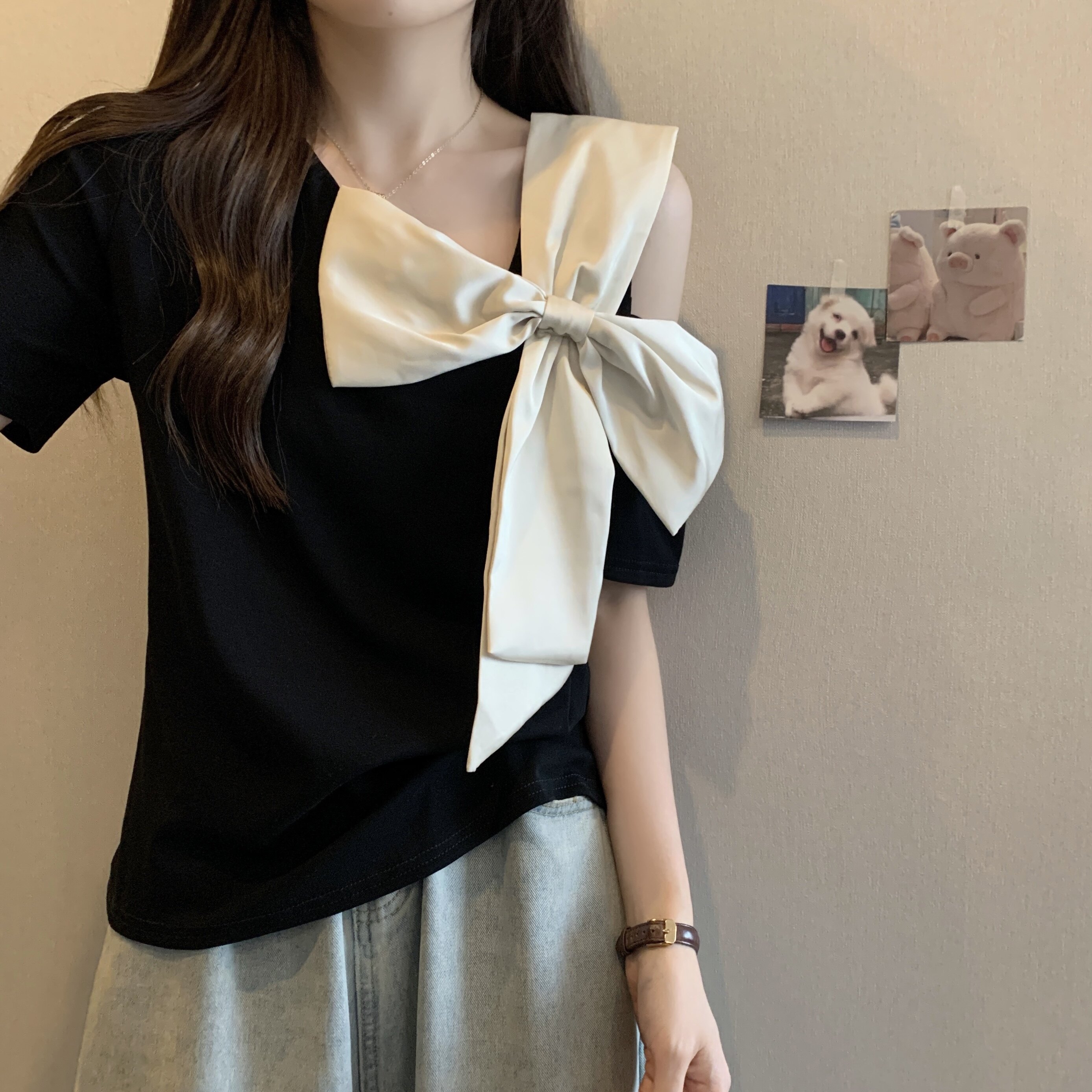Летняя футболка с коротким рукавом с бантиком, французский стиль, большой размер, в западном стиле