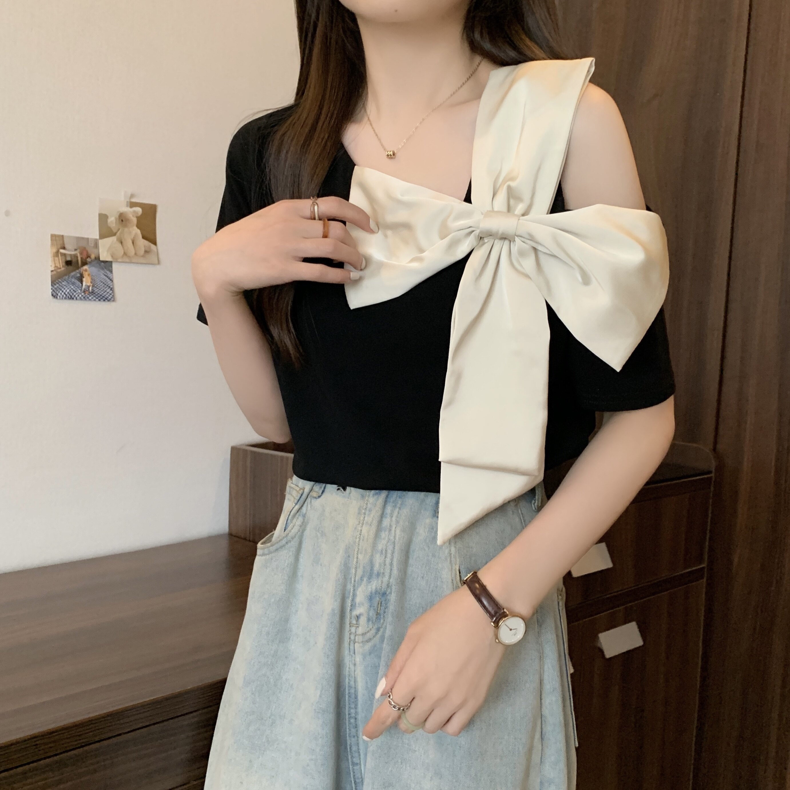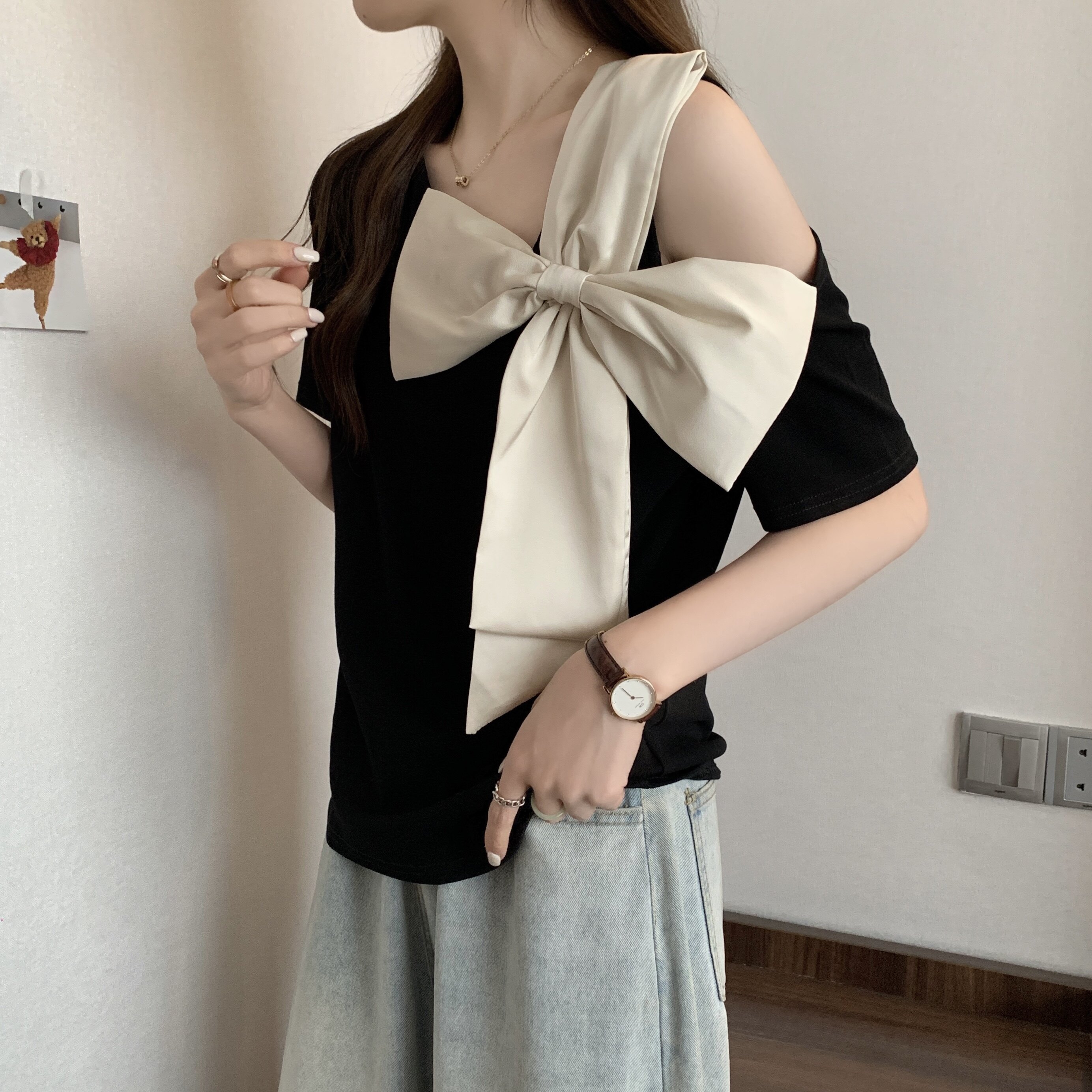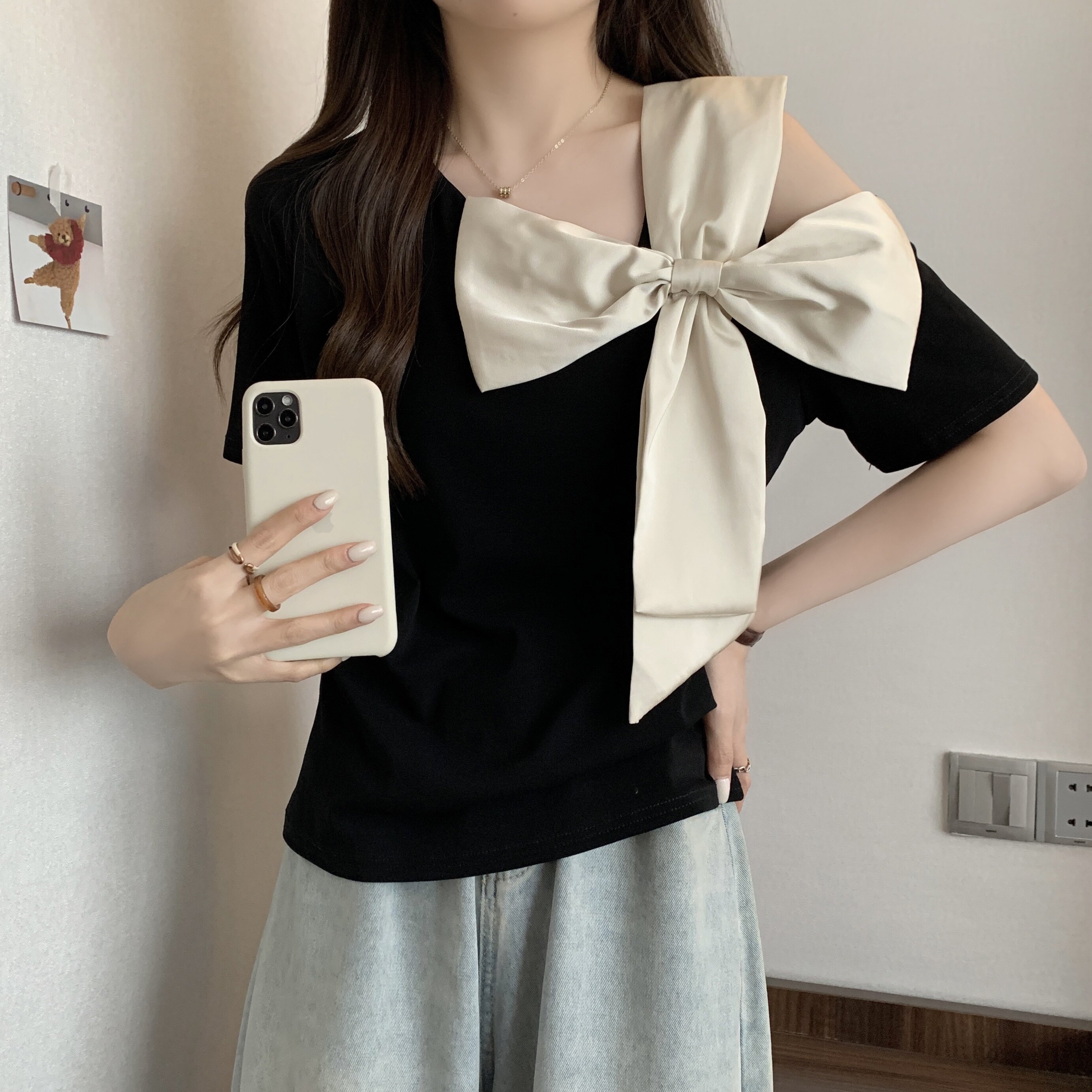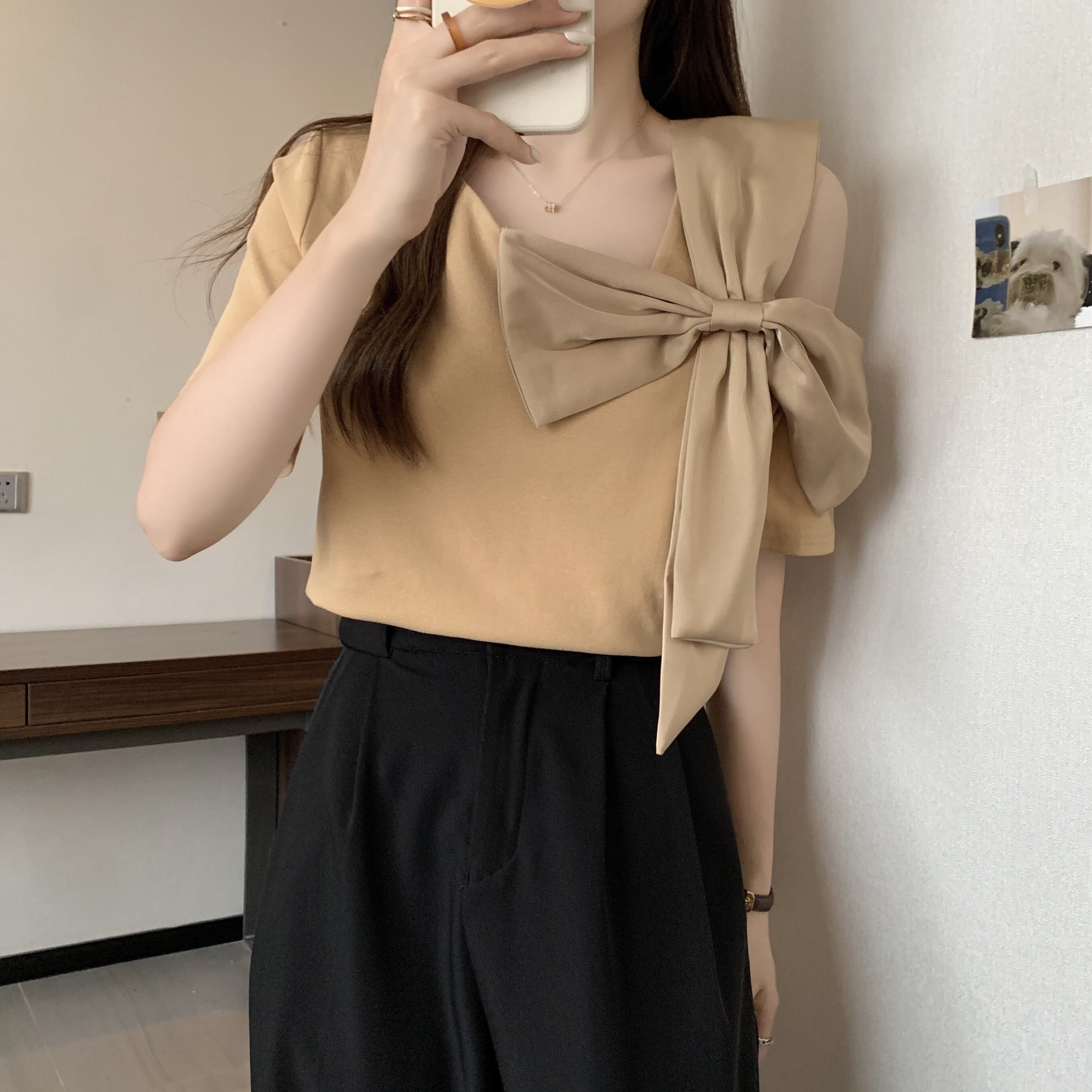 Летняя футболка с коротким рукавом с бантиком, французский стиль, большой размер, в западном стиле