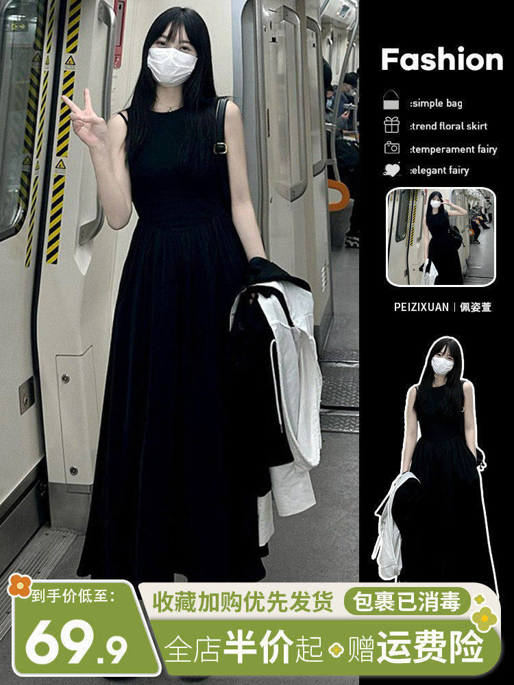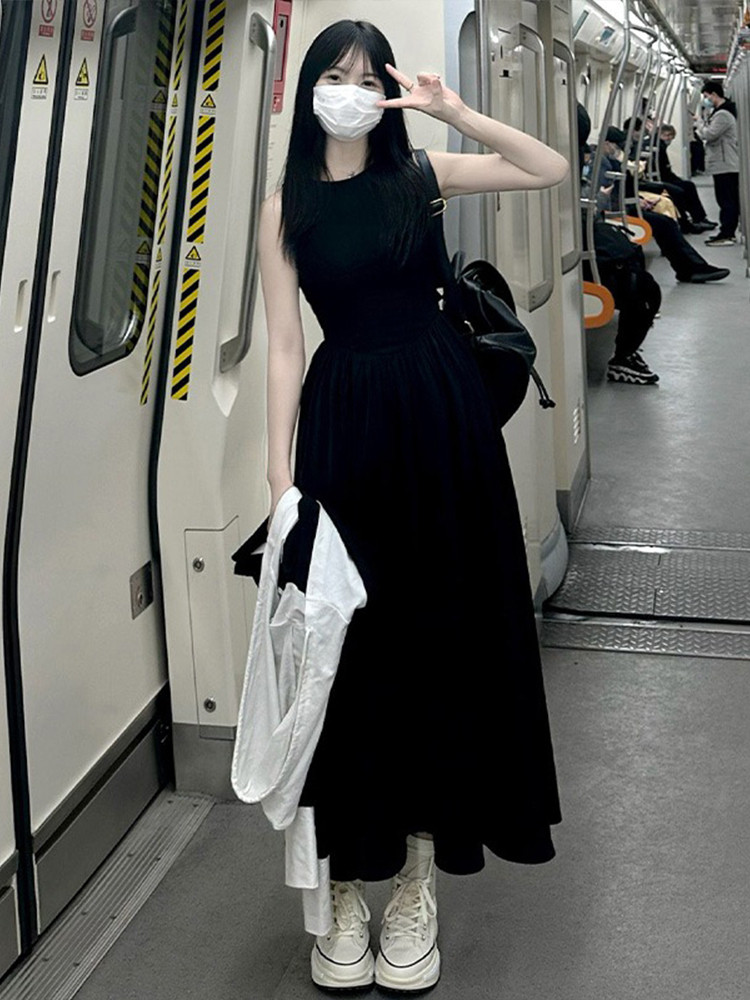 Черное летнее платье без рукавов, приталенный корсет, длинная юбка, французский стиль