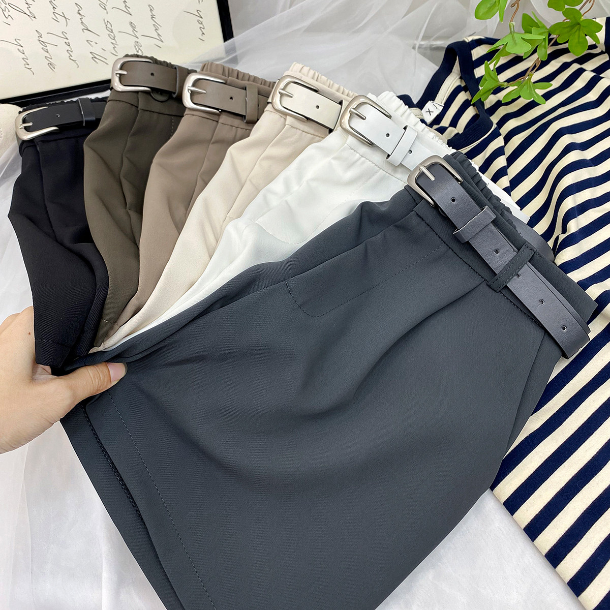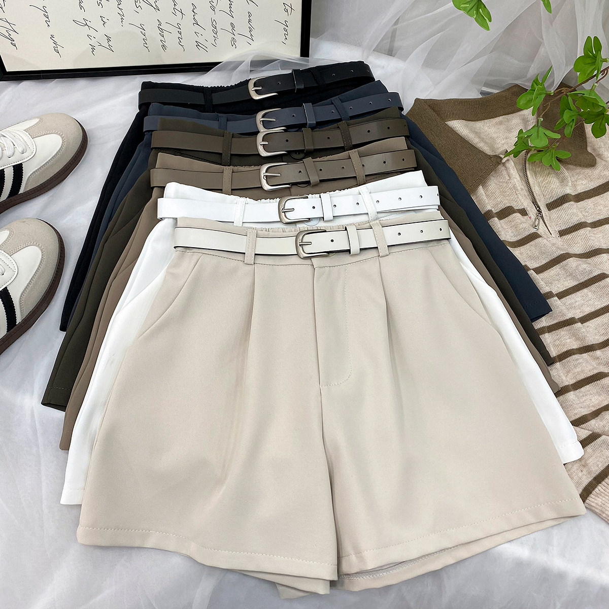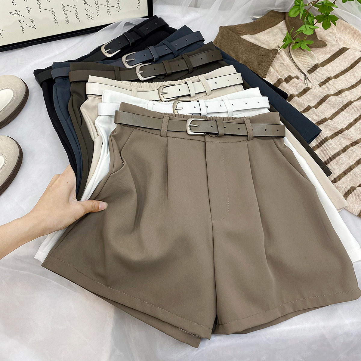 Хаки костюм, шорты, шелковые штаны, изысканный стиль, высокая талия, в западном стиле