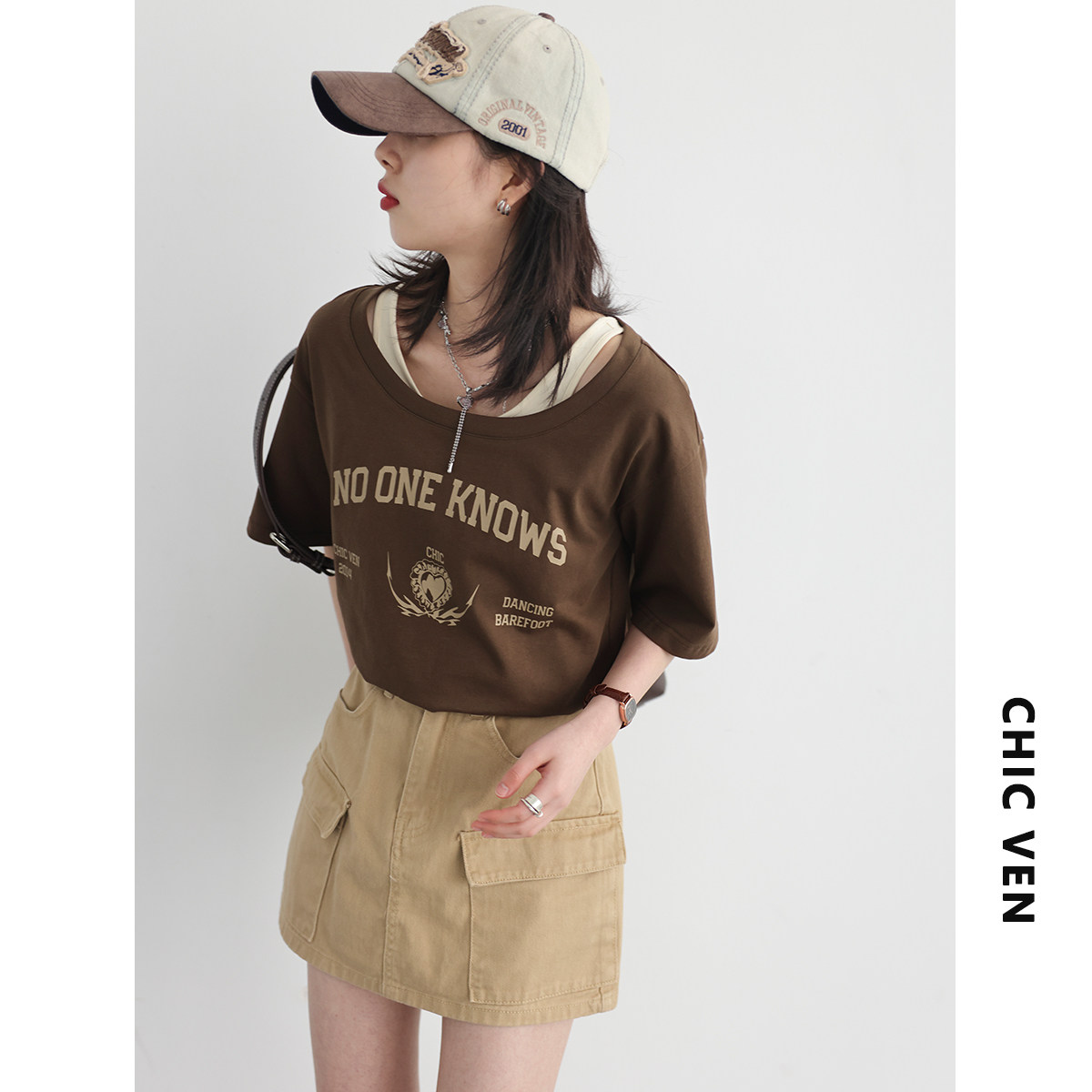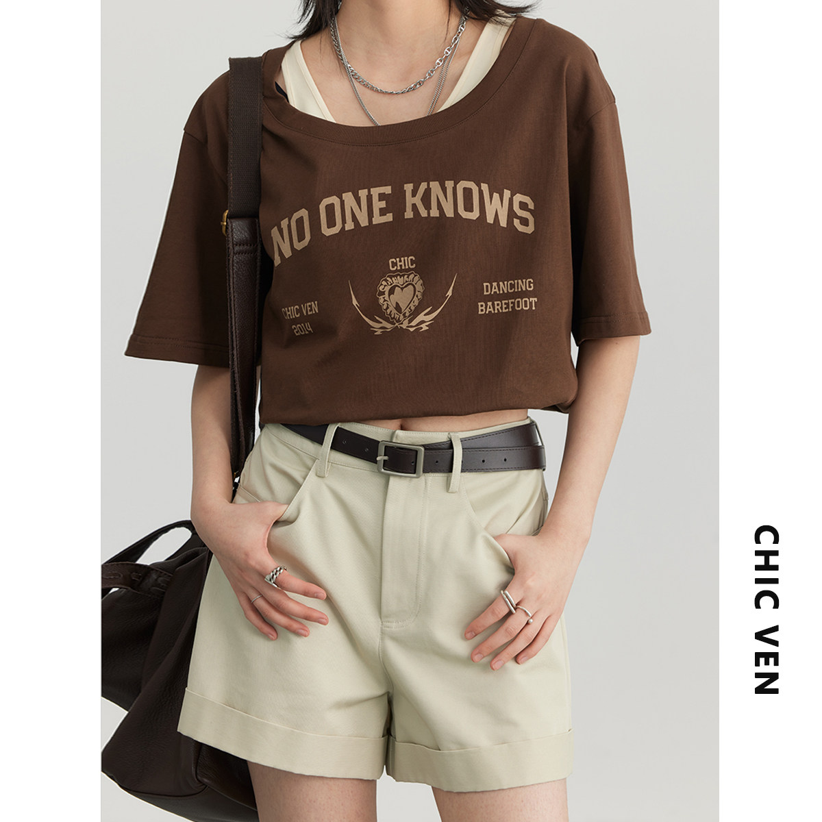 Свободная короткая версия, увеличьте долю фигуры оптимизации талии. Поддельные две части естественным образом образуют пустую, и соответствующее воздействие повторяет лето В подключении по подоле есть небольшая форма бутона, которая выглядит более тонкой Передняя грудная печать печать, текстура ретро, печатный клей не является сильным В сочетании с буквами бренда Chicven, против Counterfeiting подчеркивает качество