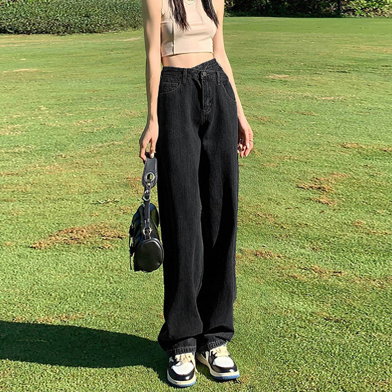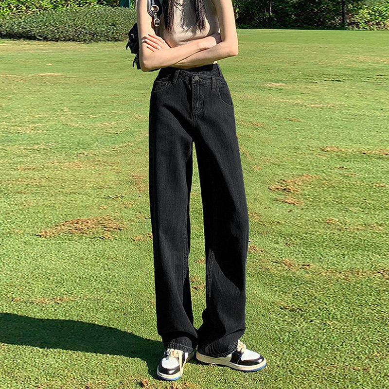 Черные осенние джинсы, демисезонные штаны, для формы тела «груша», большой размер, подходит для полных девушек, высокая талия, свободный прямой крой, стройный силуэт