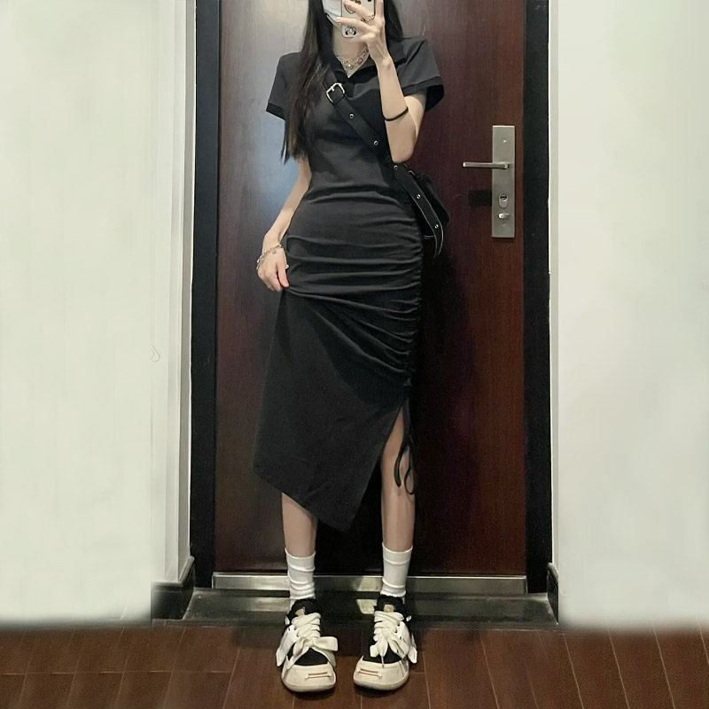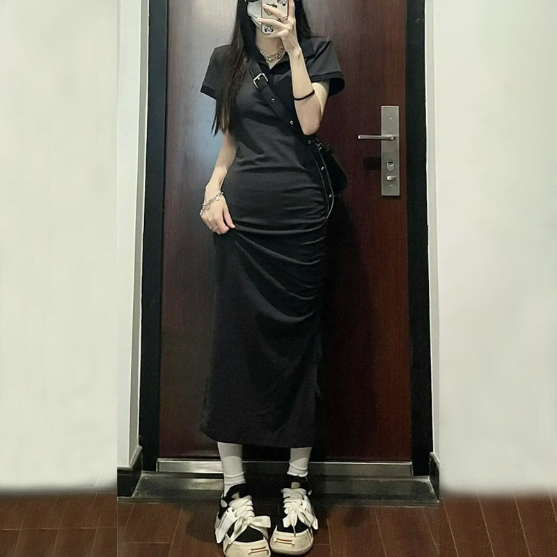 Черное летнее платье с коротким рукавом, приталенный корсет, длинная юбка, французский стиль