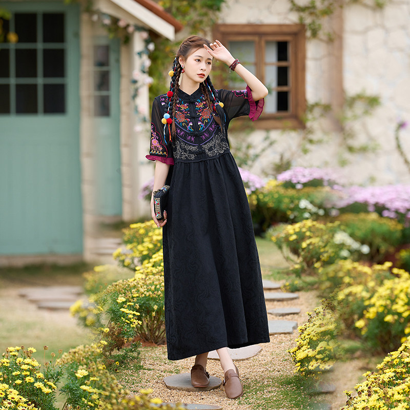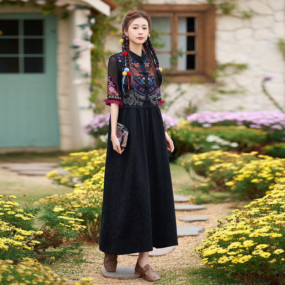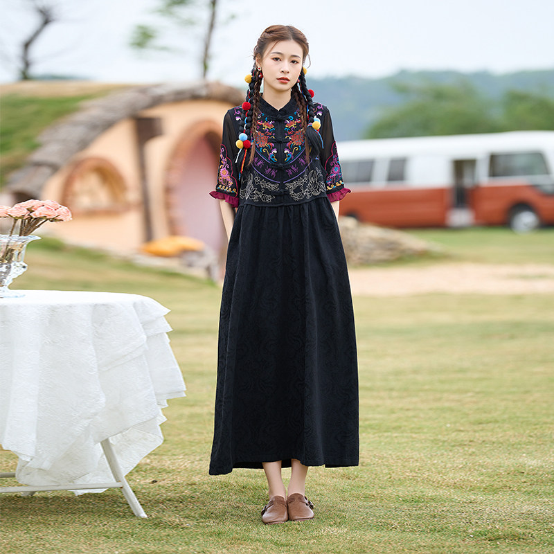 Этническая юбка, жилет, из хлопка и льна, этнический стиль, с вышивкой