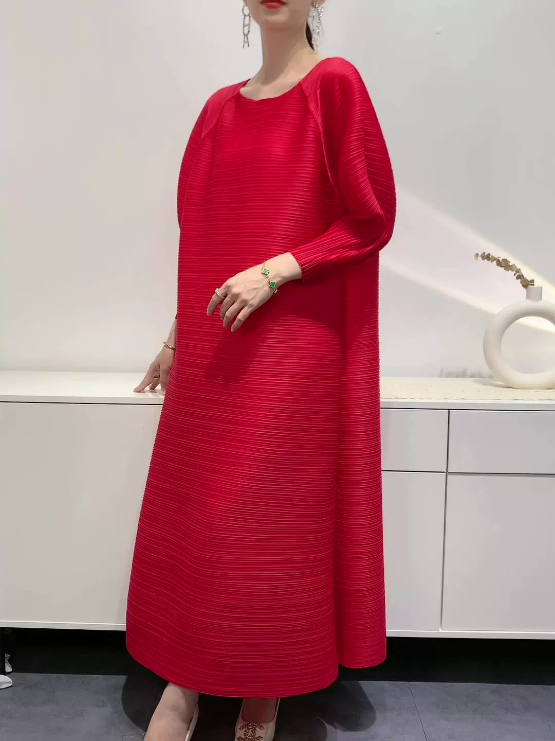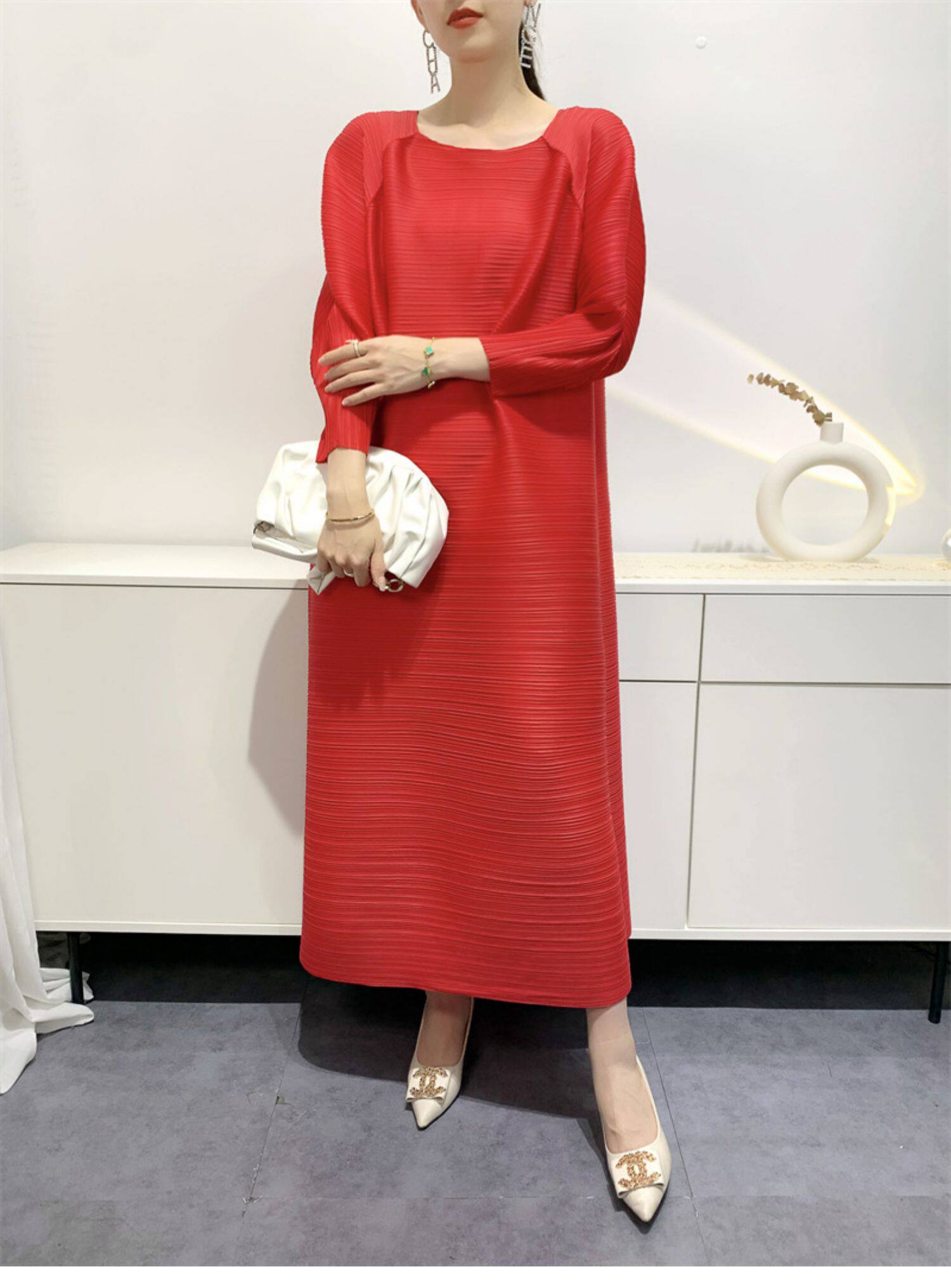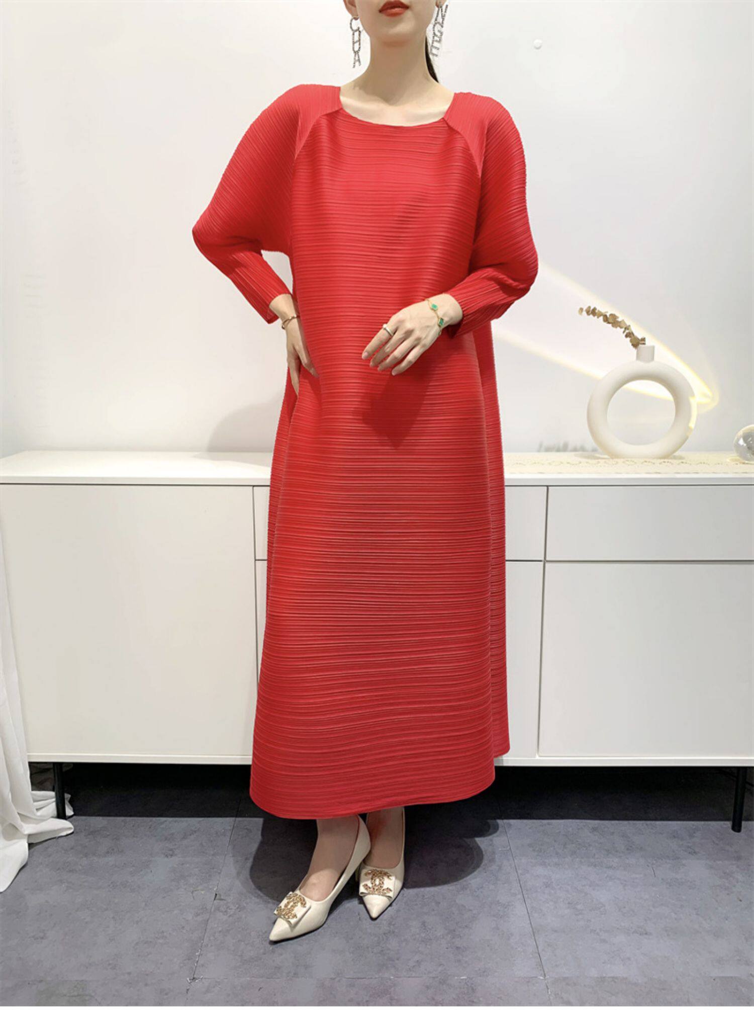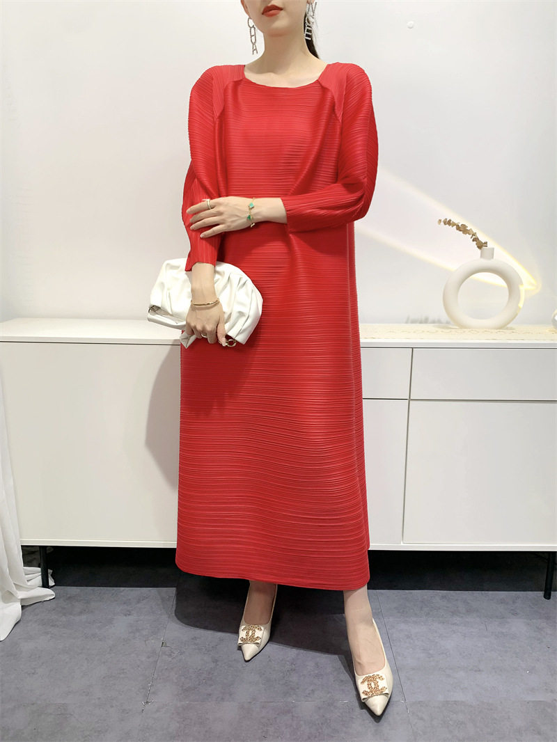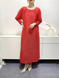 Платье, летняя красная длинная юбка в складку с круглым воротником, яркий броский стиль, средней длины
