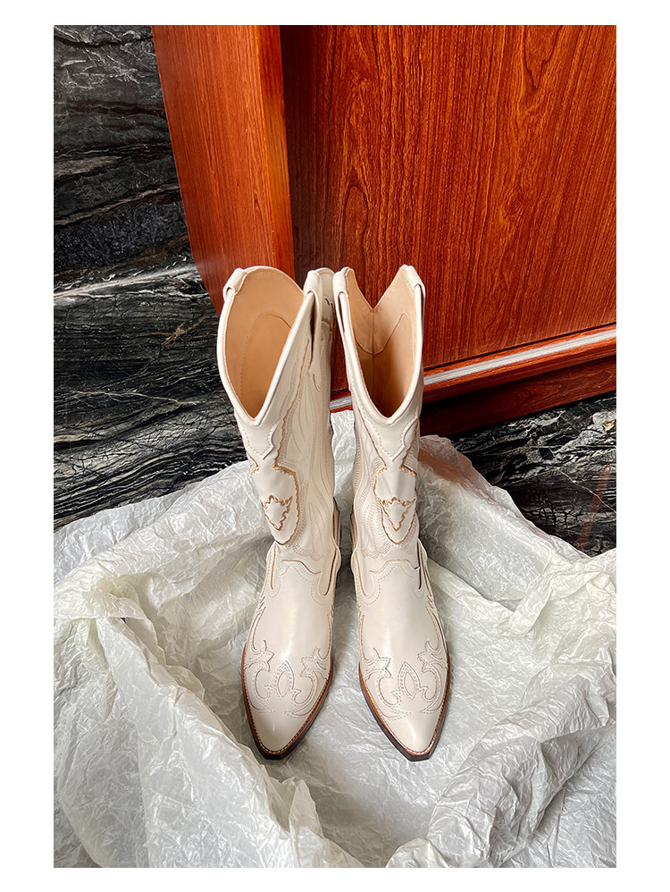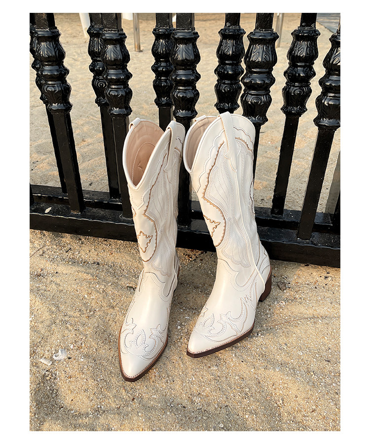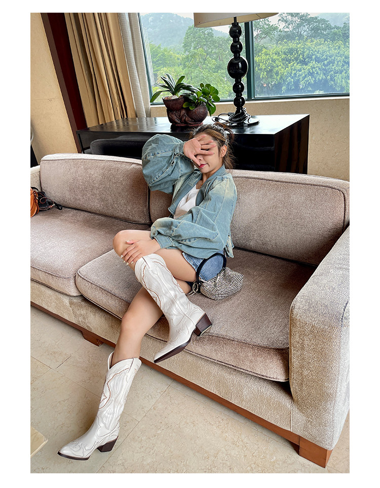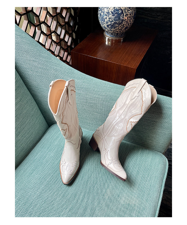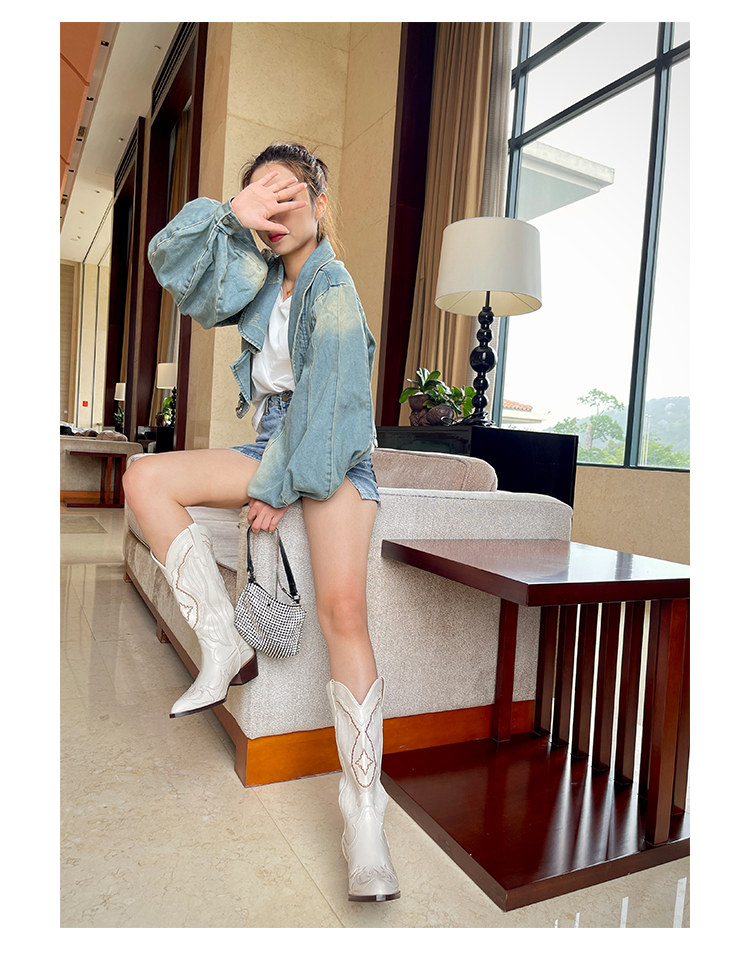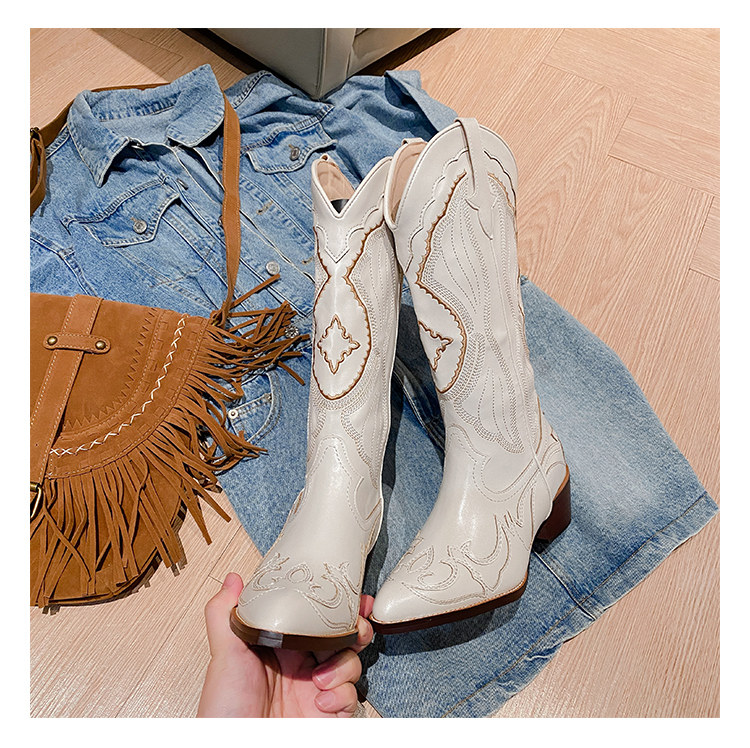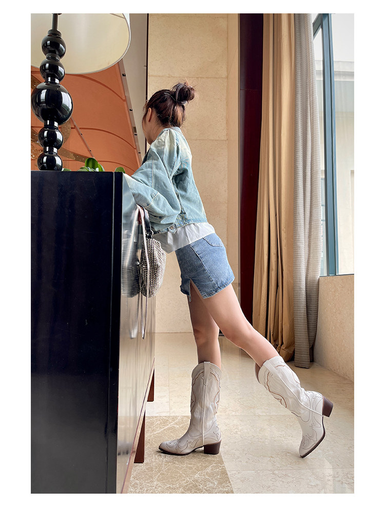 Джинсовые высокие белые высокие сапоги, ботинки, с вышивкой, по фигуре, из натуральной кожи