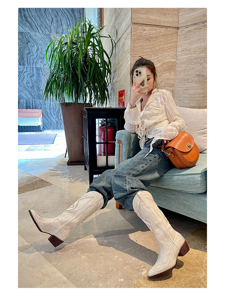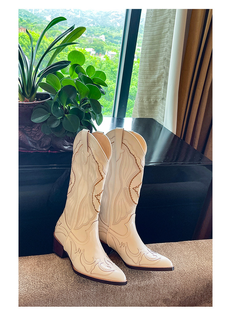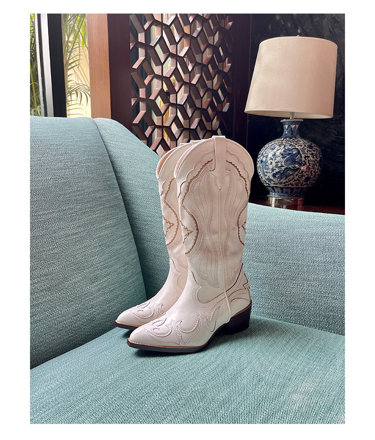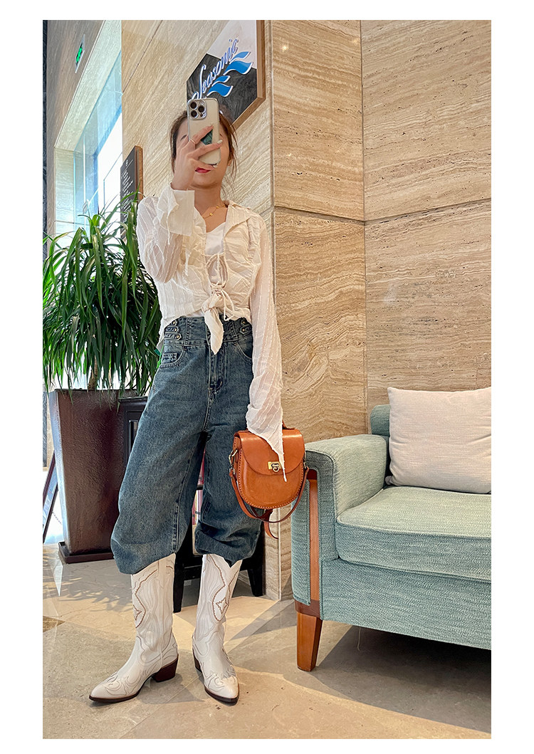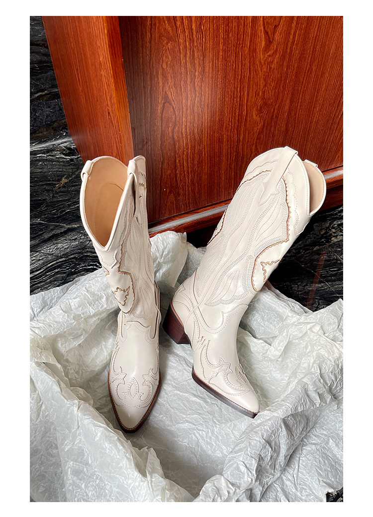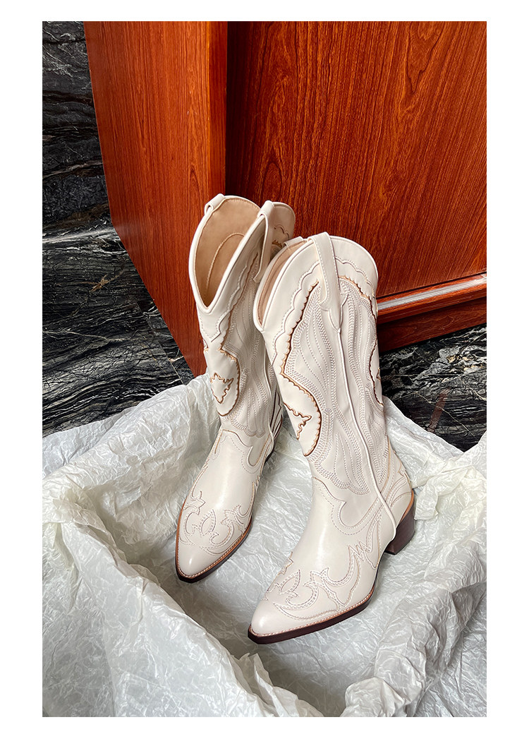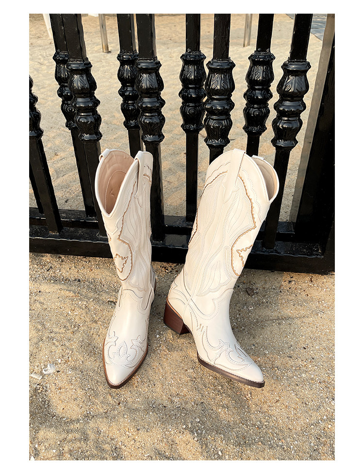 Джинсовые высокие белые высокие сапоги, ботинки, с вышивкой, по фигуре, из натуральной кожи