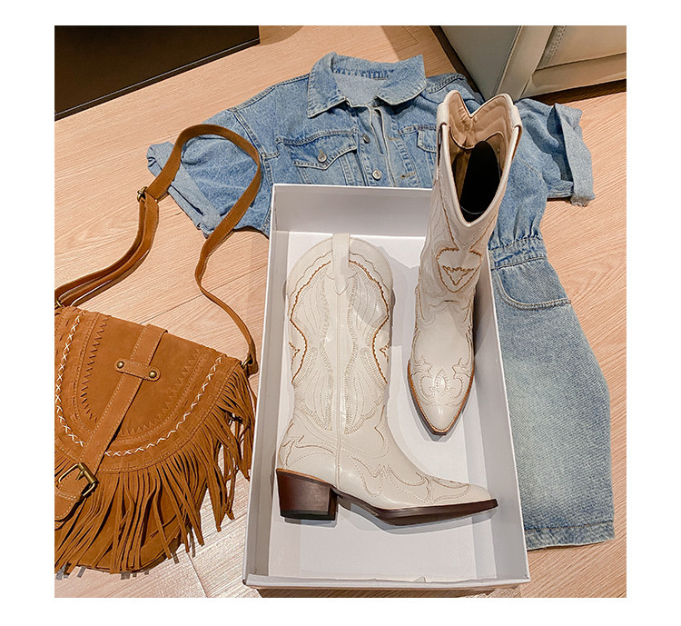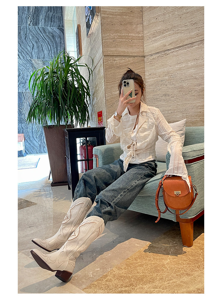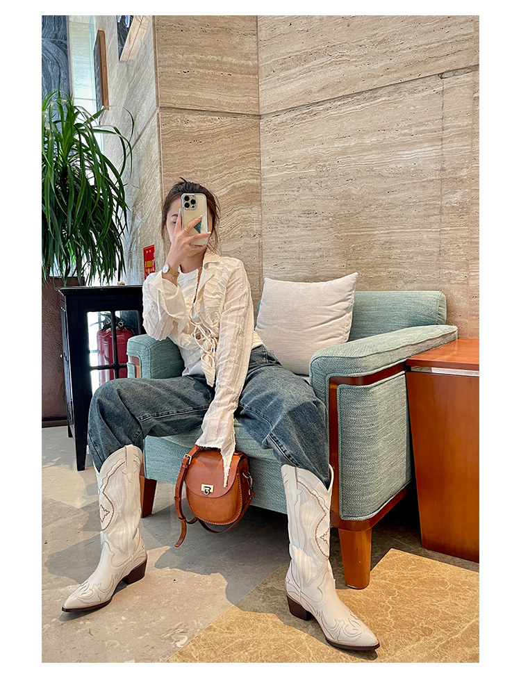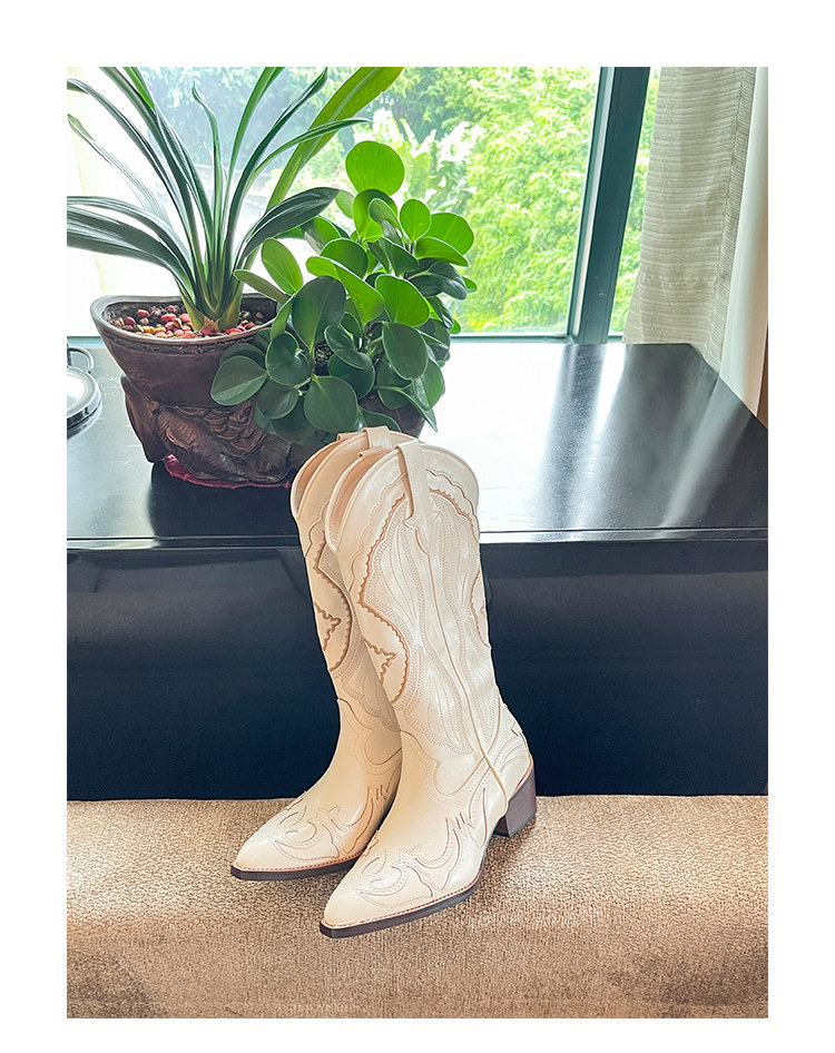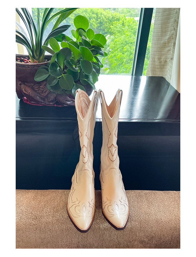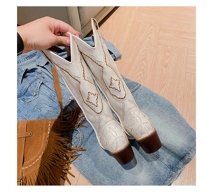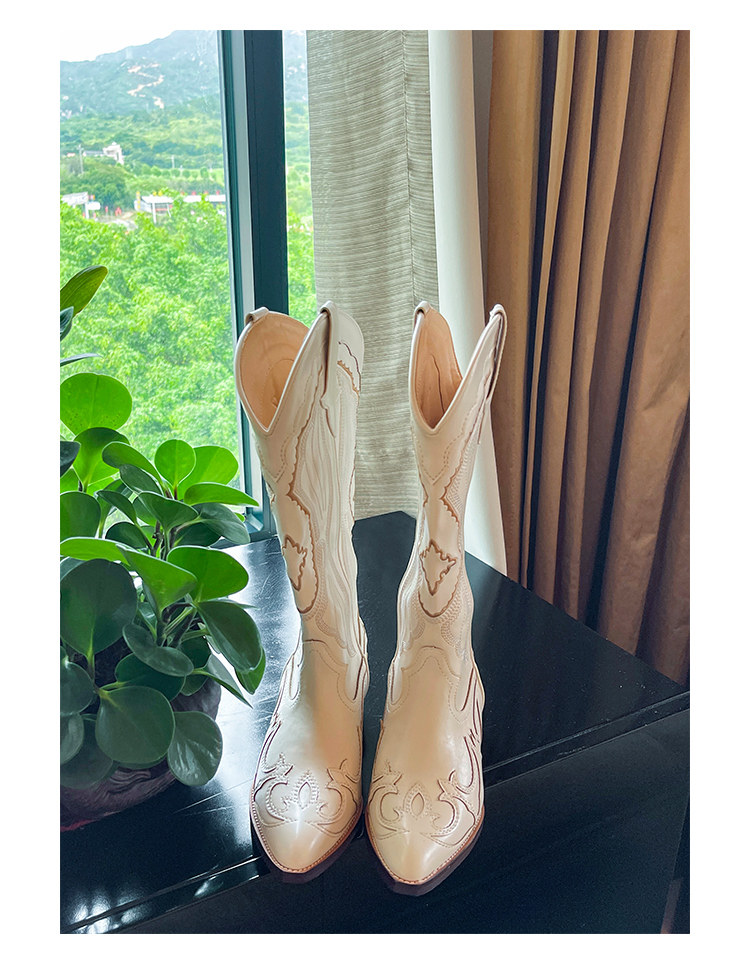 Джинсовые высокие белые высокие сапоги, ботинки, с вышивкой, по фигуре, из натуральной кожи