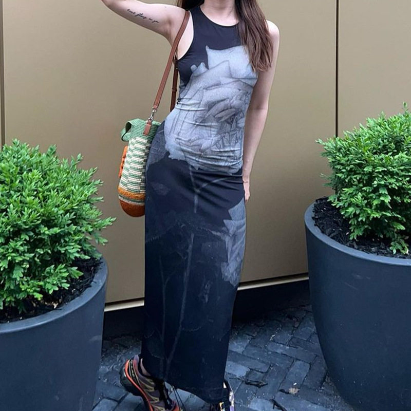 Печатное длинное платье с высоким содержанием таиста европейское и американское стиль, напечатанная круглое шея с высокой талией, длинная юбка с высокой талией с высокой талией