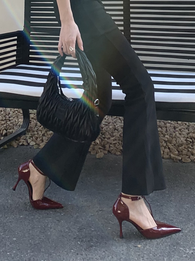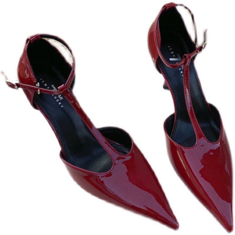 [4 апреля] Летние туфли из лакированной кожи с острым носком на мелкой шпильке, женственные бордовые туфли с Т-образным ремешком и полой подошвой.
