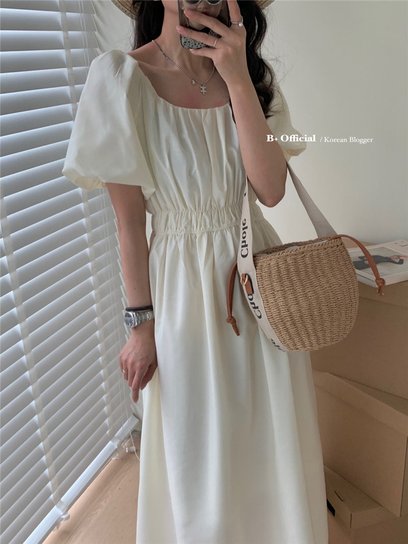 Платье, короткая длинная юбка, в корейском стиле, квадратный вырез, высокий воротник, рукава фонарики, средней длины, свободный крой, яркий броский стиль