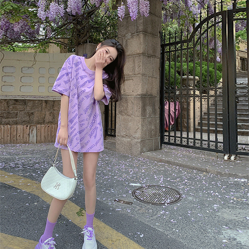 Сиреневая длинная футболка, короткий рукав, оверсайз, средней длины