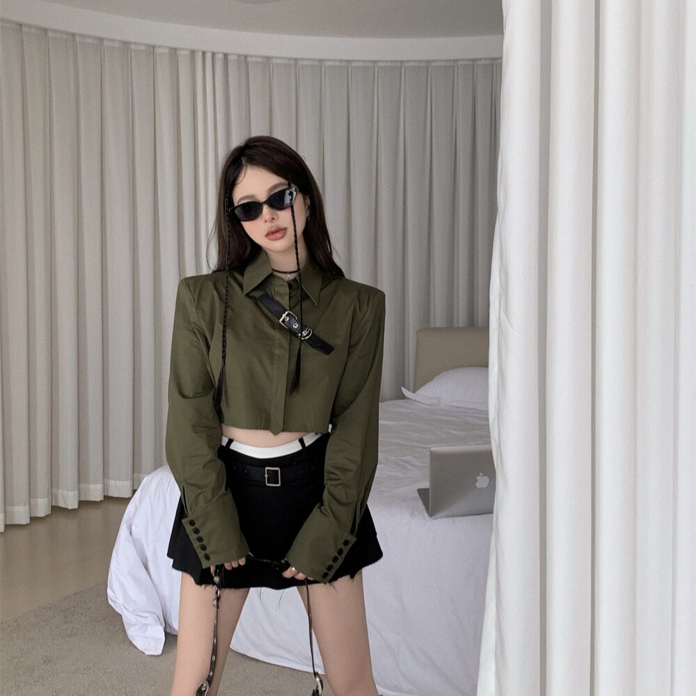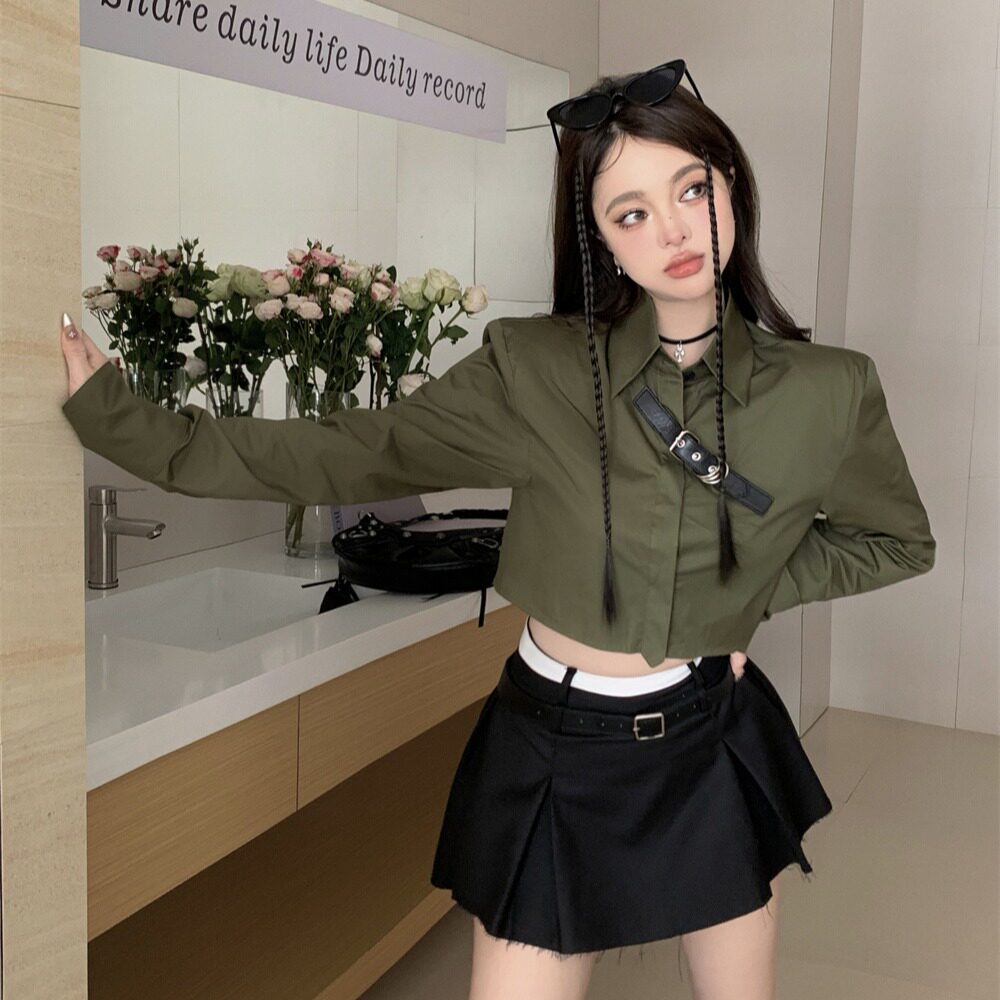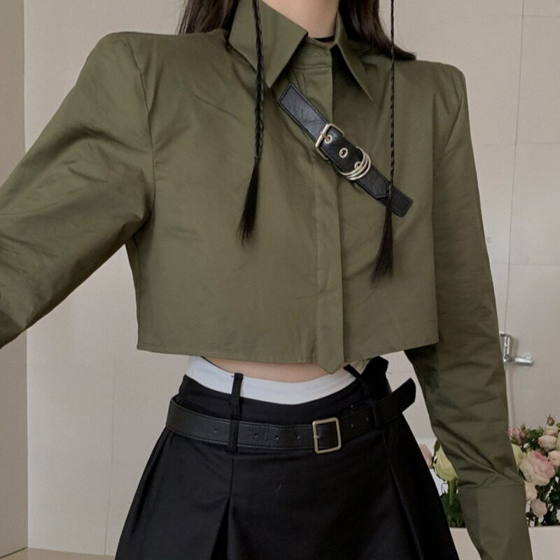 Ретро рубашка, короткий лонгслив, воротник поло, в корейском стиле, свободный крой