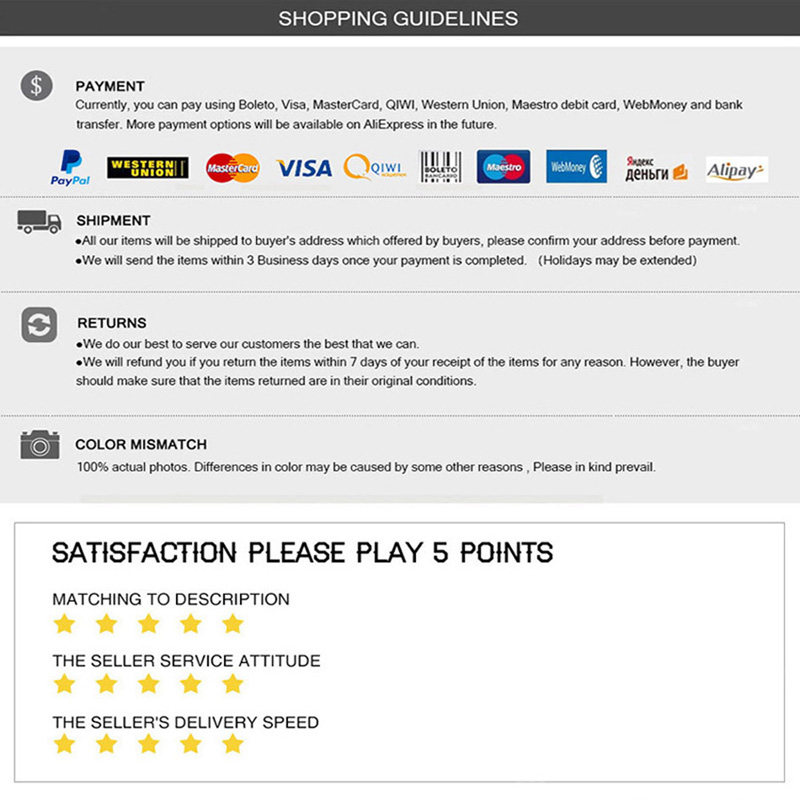 3. Если вы не удовлетворены нашими продуктами, пожалуйста, свяжитесь с нами, прежде чем оставить нейтральный (3 звезды) или отрицательный (1-2 звезды) отзыв. Мы гарантируем, что на 100% решим любую вашу проблему.