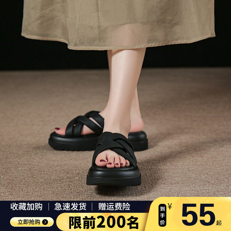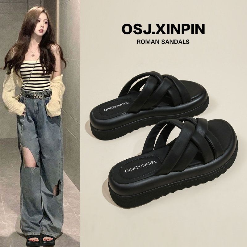 Летние тапочки, черные высокие слайдеры на платформе, пляжная обувь, коллекция 2023, популярно в интернете, изысканный стиль