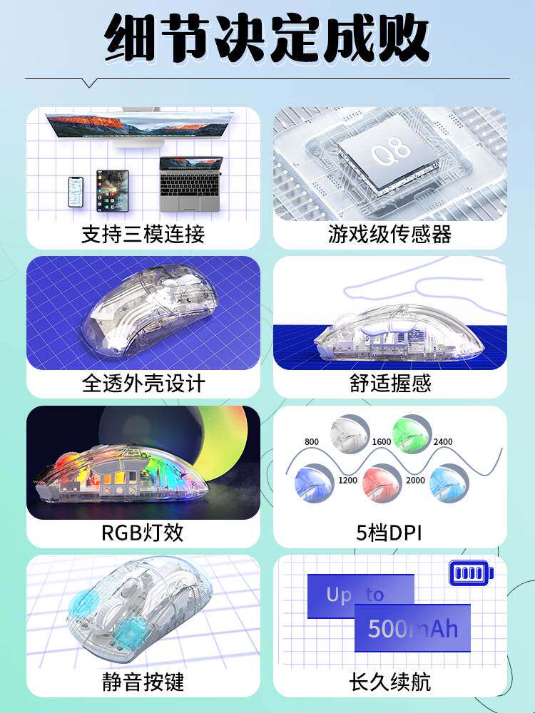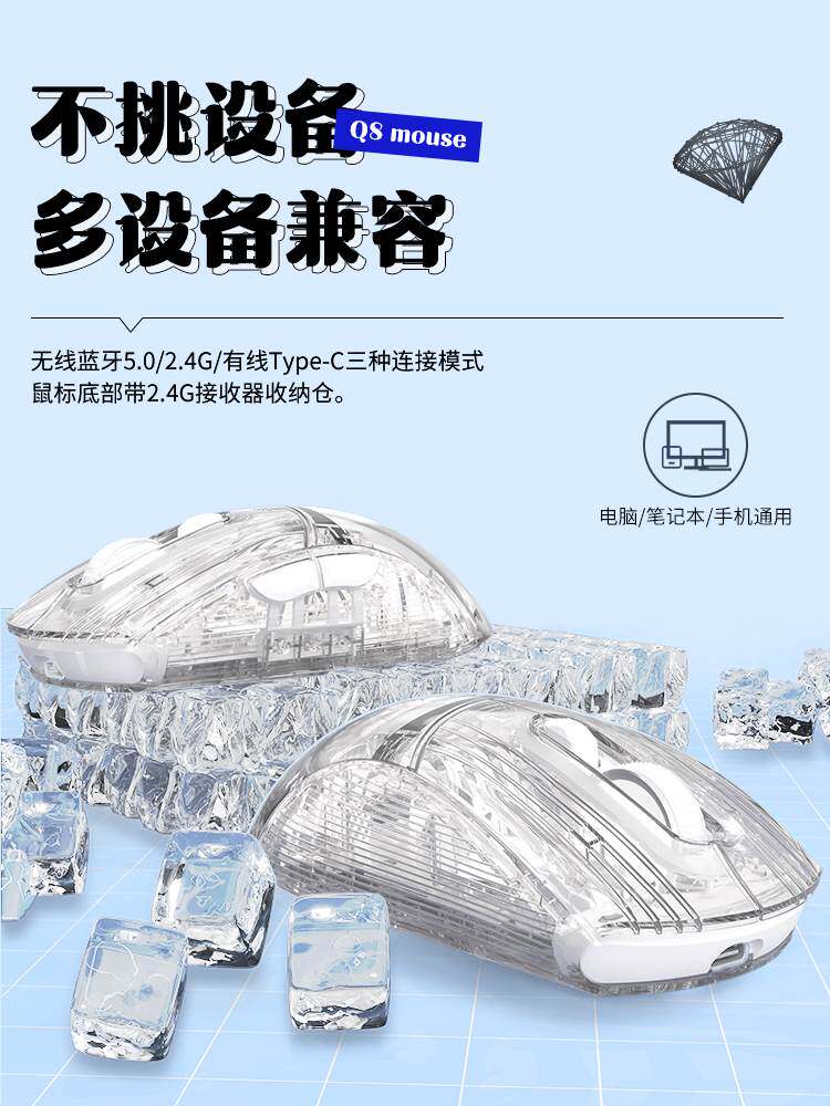 Вперед Q8 Прозрачная беспроводная Bluetooth мыши Трехмодовая офисная игра.