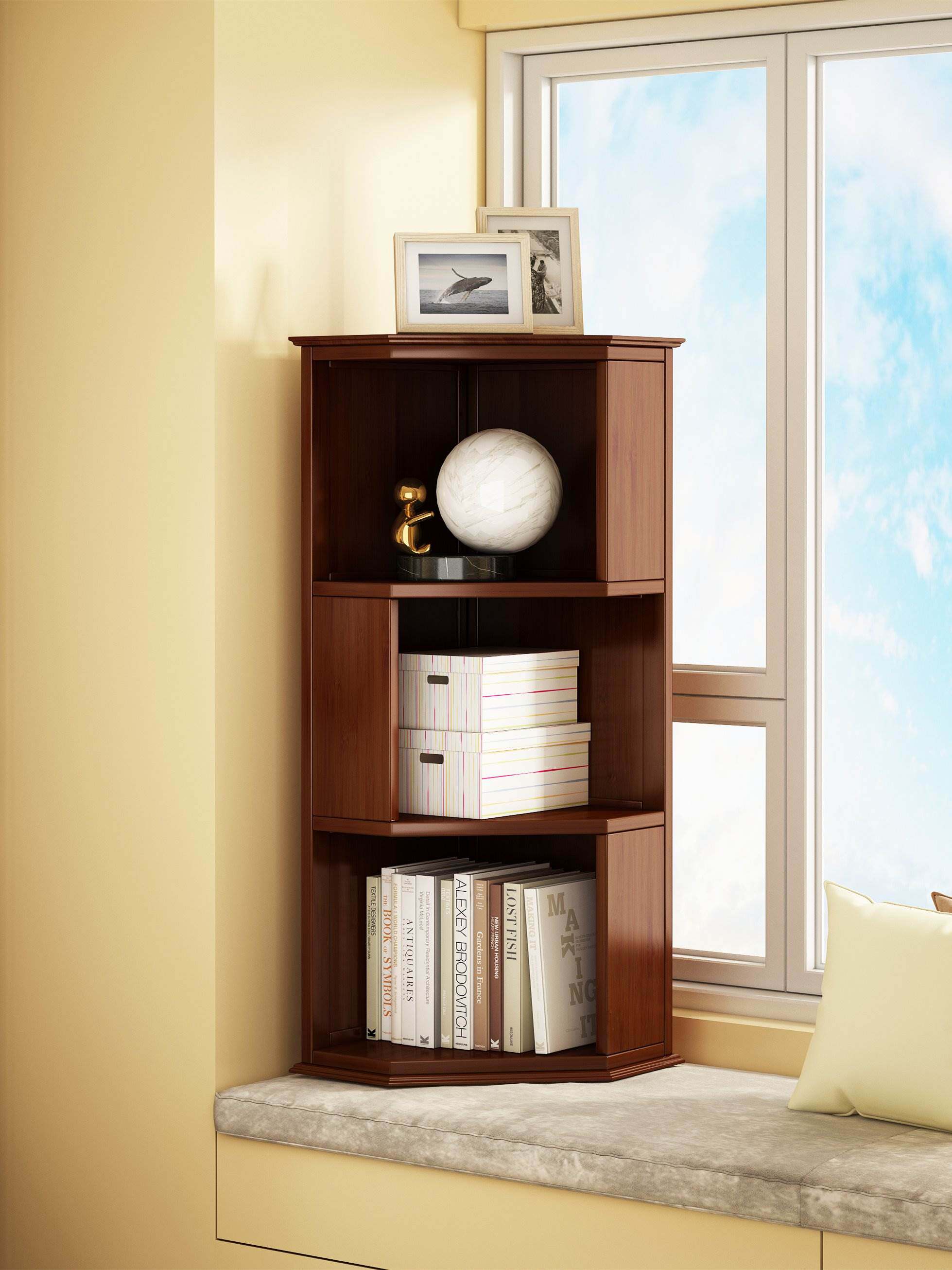 Угловой книжный шкаф дом сплошной деревянная стена, угловой, маленькие книжные положки на стене узкие полки комната отсека