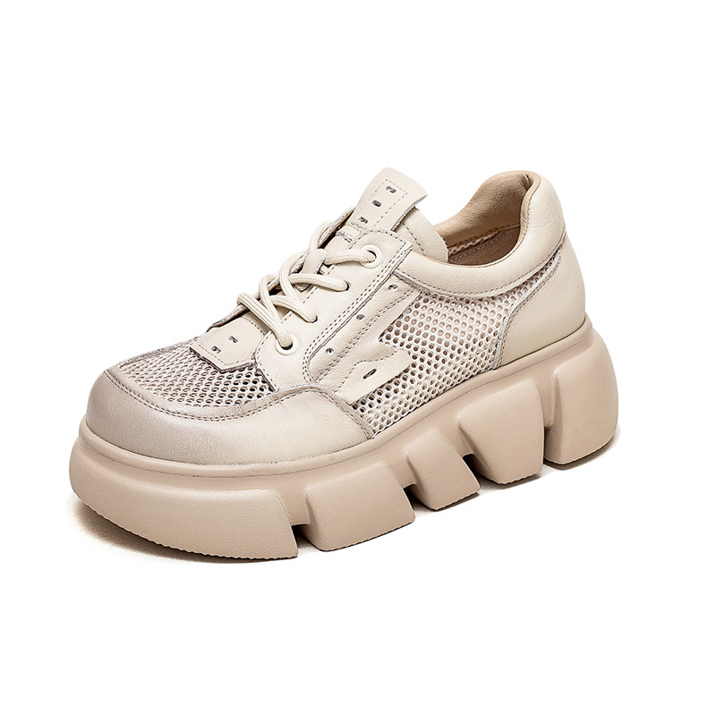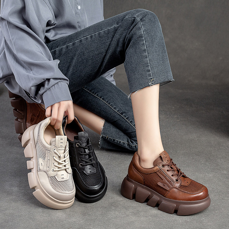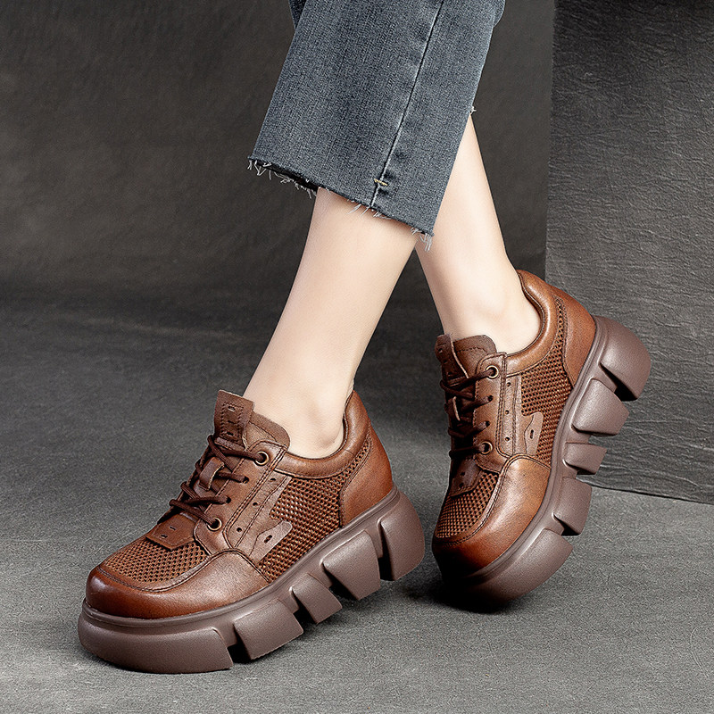 Кожаные сетчатые дышащие сандалии для отдыха на платформе, этническая обувь, 2023, из натуральной кожи, этнический стиль