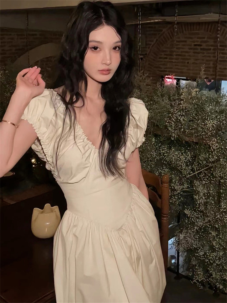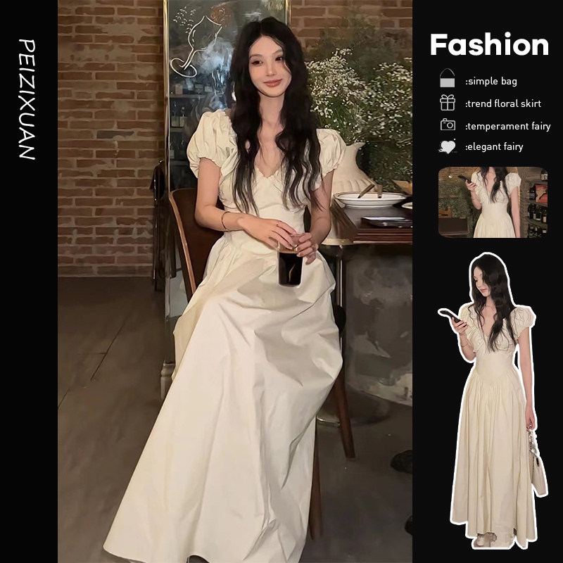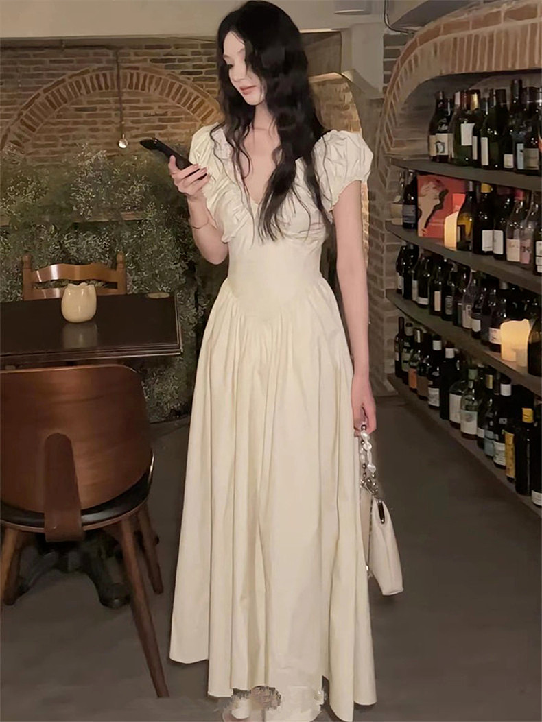 Белое летнее платье, приталенный корсет, длинная юбка, V-образный вырез, рукава фонарики, французский стиль