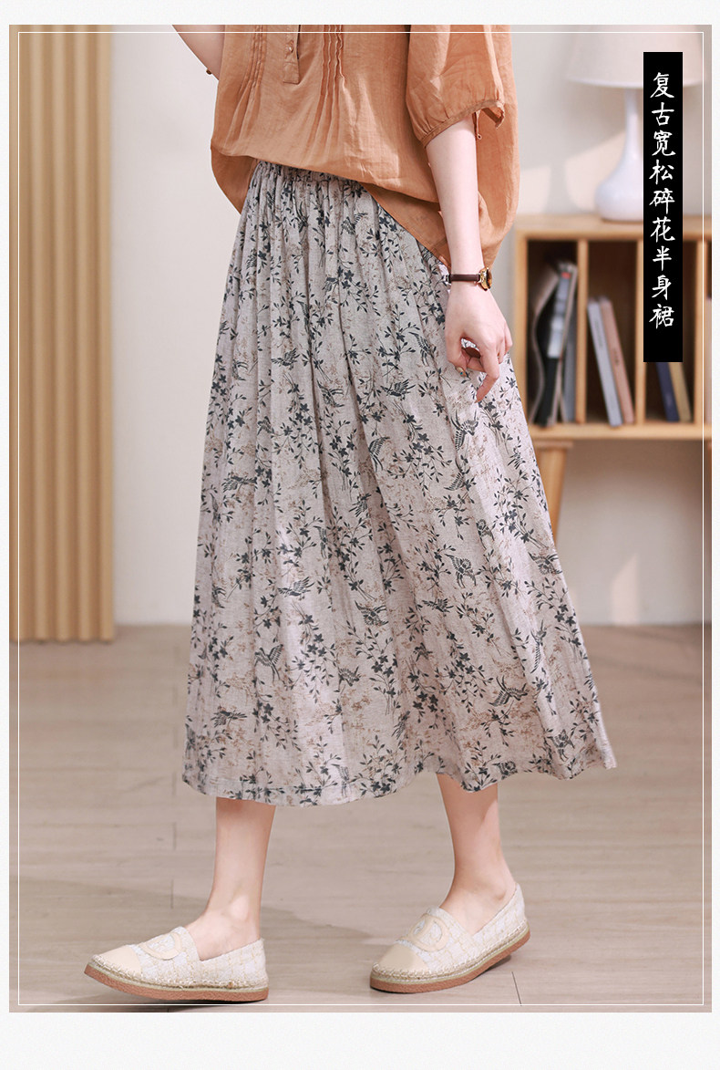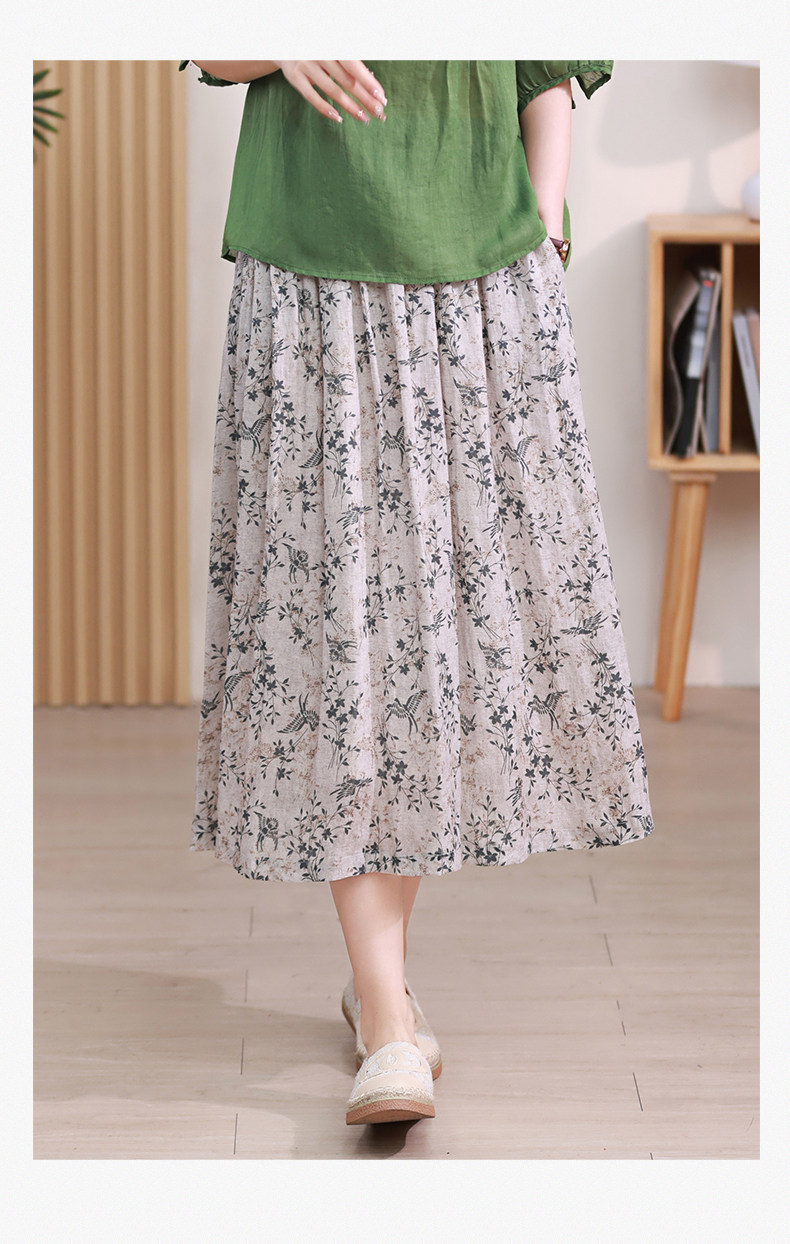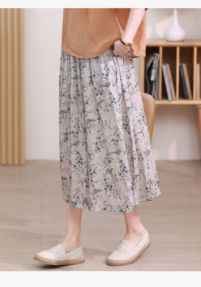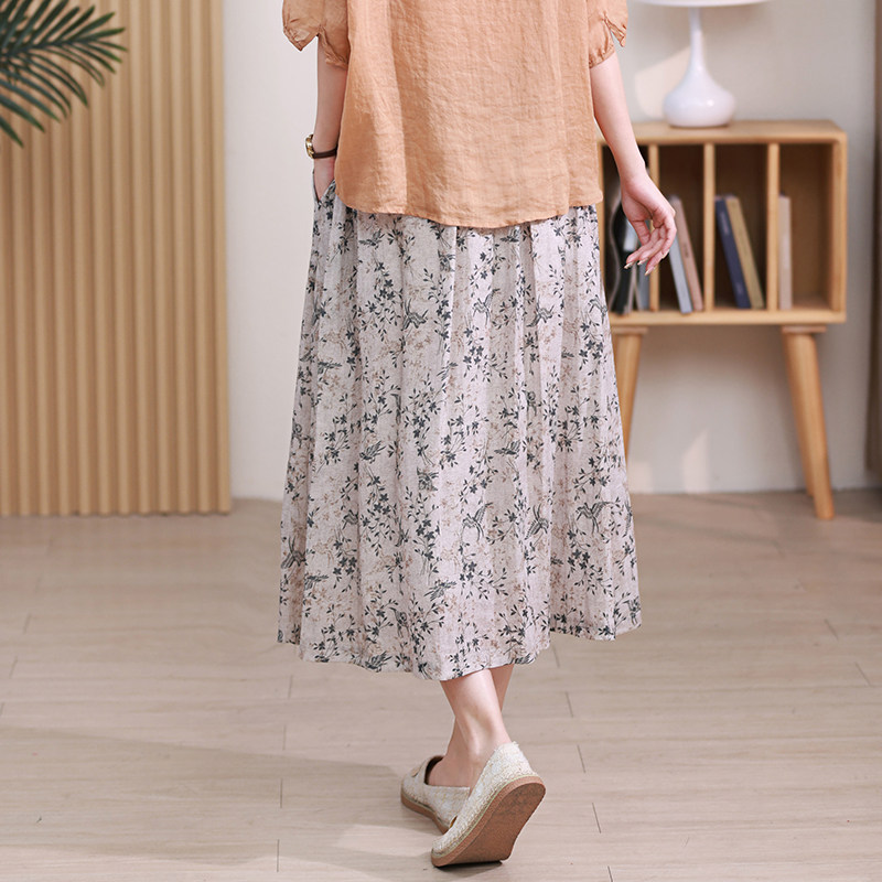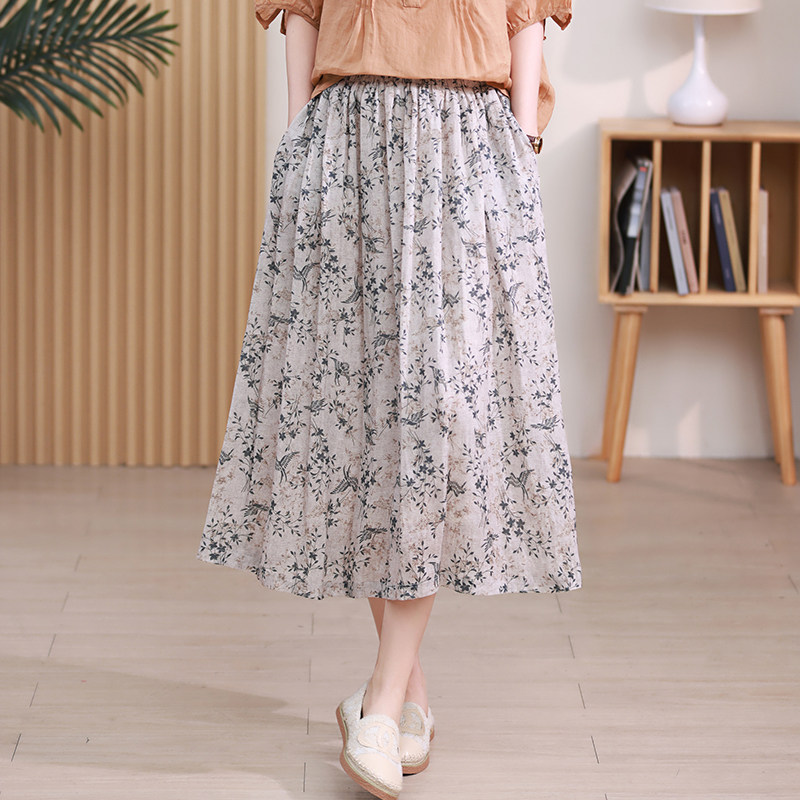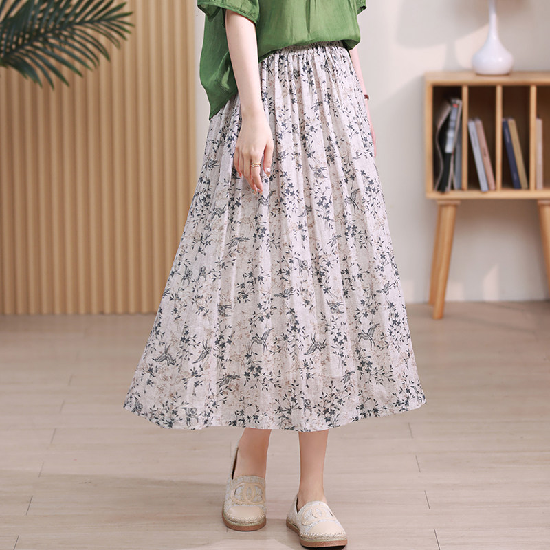 Длинная ретро юбка в складку, цветочный принт, средней длины, из хлопка и льна, А-силуэт