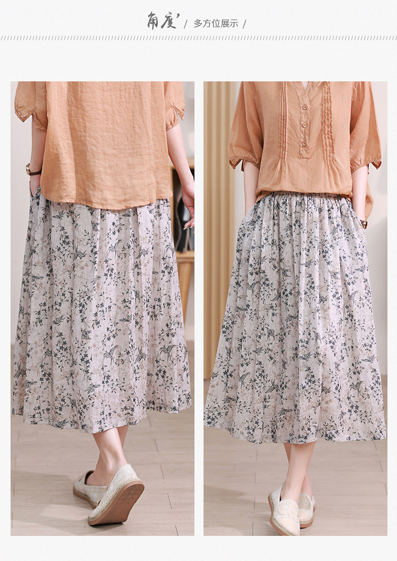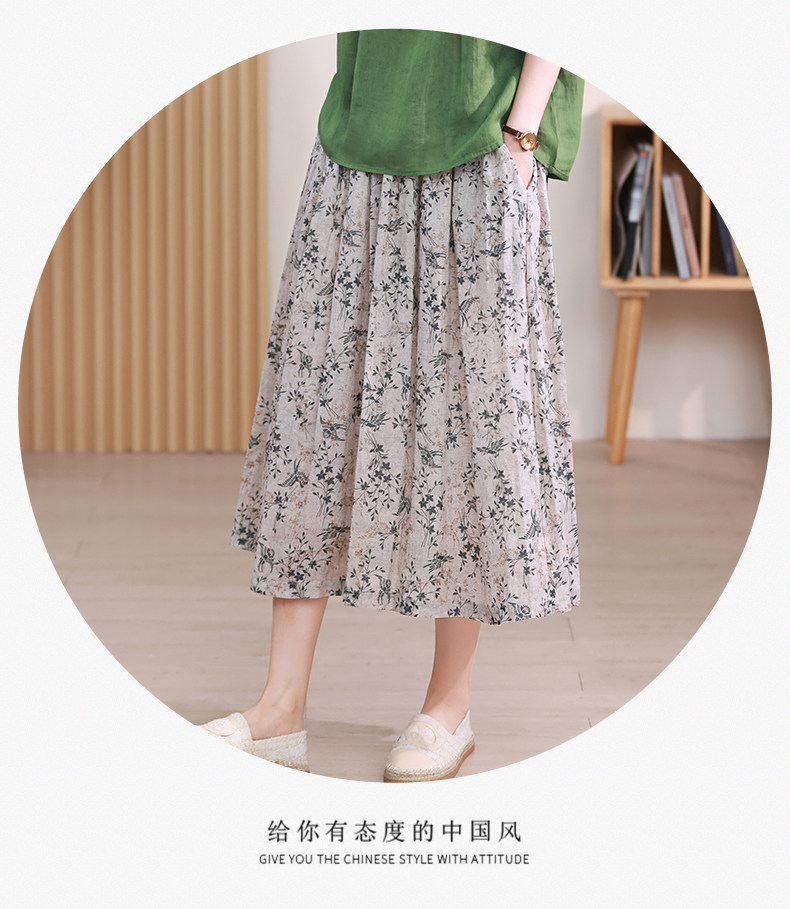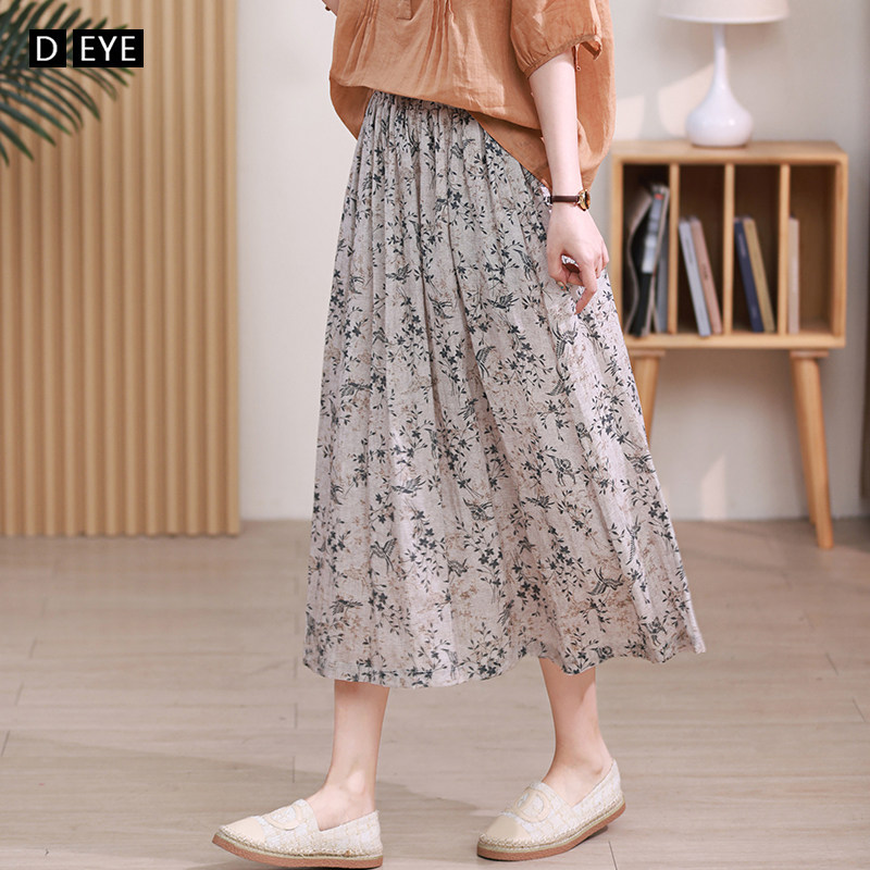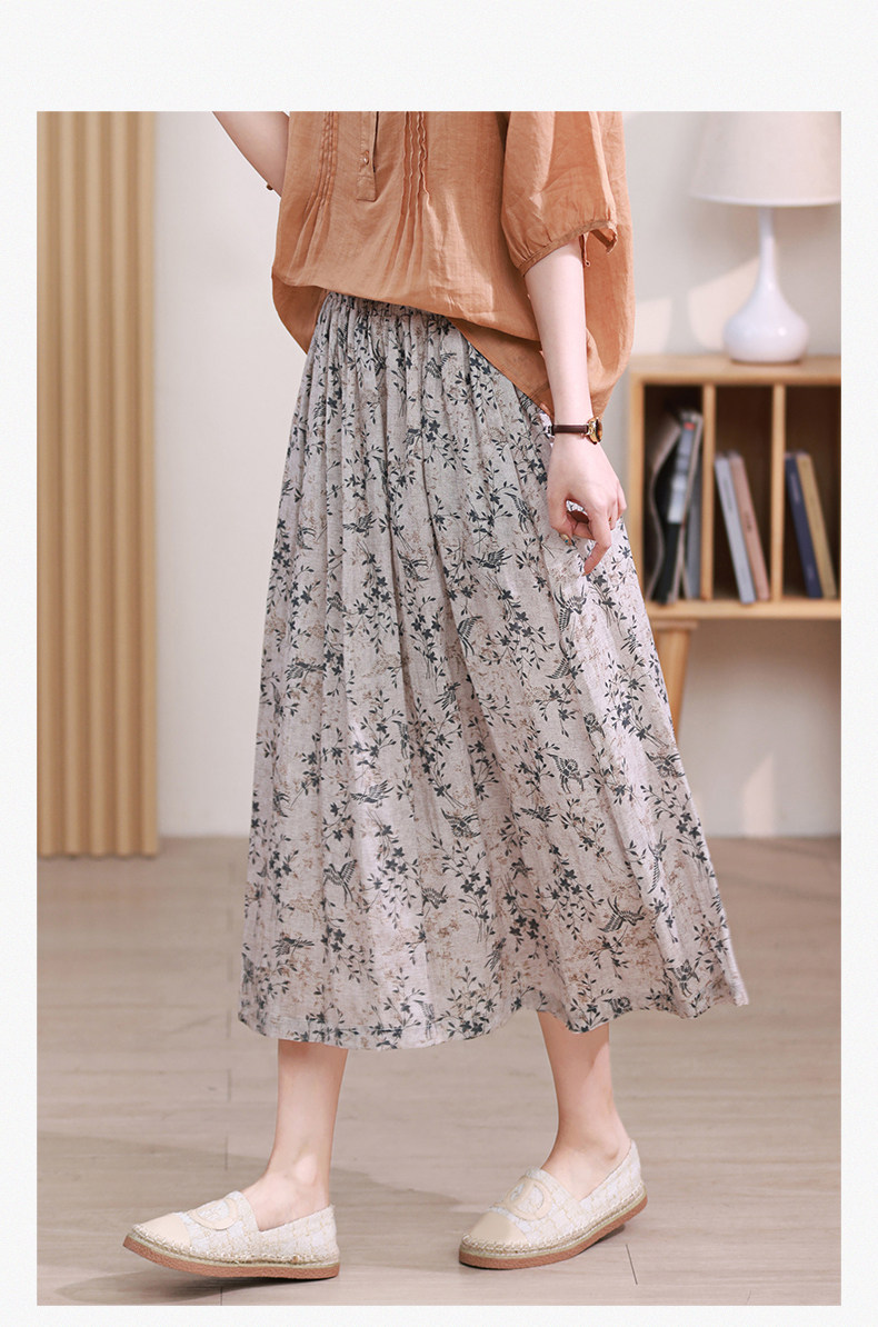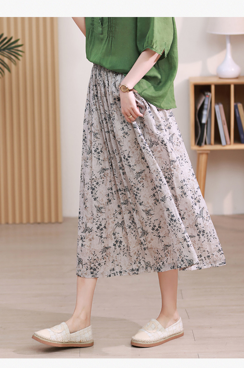 Длинная ретро юбка в складку, цветочный принт, средней длины, из хлопка и льна, А-силуэт