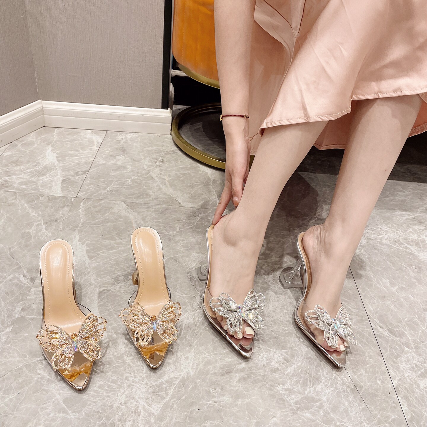 Foreight Fashion Fashion Mueller Shoes Transparent Bow Diamond High Heel High Slipper Женщины Lazada Women Antryals