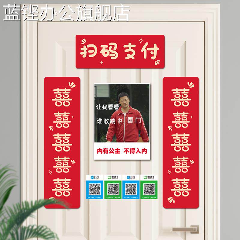 Дверные наклейки на дверь заблокировали забавную свадьбу свадьбы, подняв реквизит и счастливую пару хаха QR -код Печать флаг свадебной комнаты.