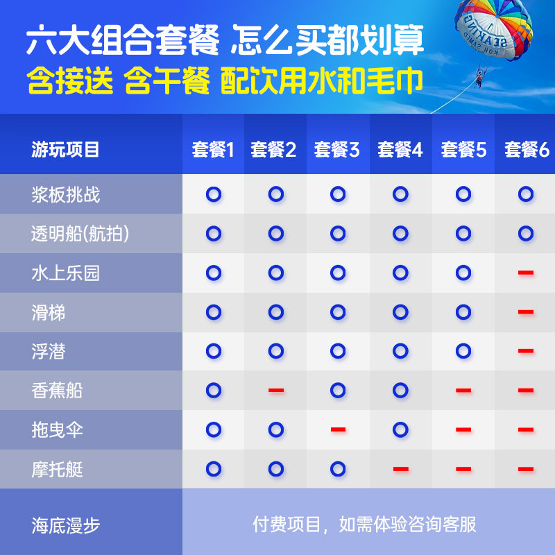 | Тип пакета: | Пакет 3: Никакого парашюта, Пакет 4: Без моторной лодки, Пакет 5: подводное плавание + горка + парк + доска для серфинга + аэрофотосъемка, Пакет 6: Сопровождающий билет, включая трансфер + питание + аэрофотосъемку, Пакет 1: Полный комплект проектов: лодка-банан+парасейлинг+моторная лодка., Пакет 2: без лодки-банана, Подводная прогулка (не используется отдельно, необходимо сочетать с пакетом), Подводная прогулка + фотографирование (не только используется, но и должно быть совмещено с пакетом) |