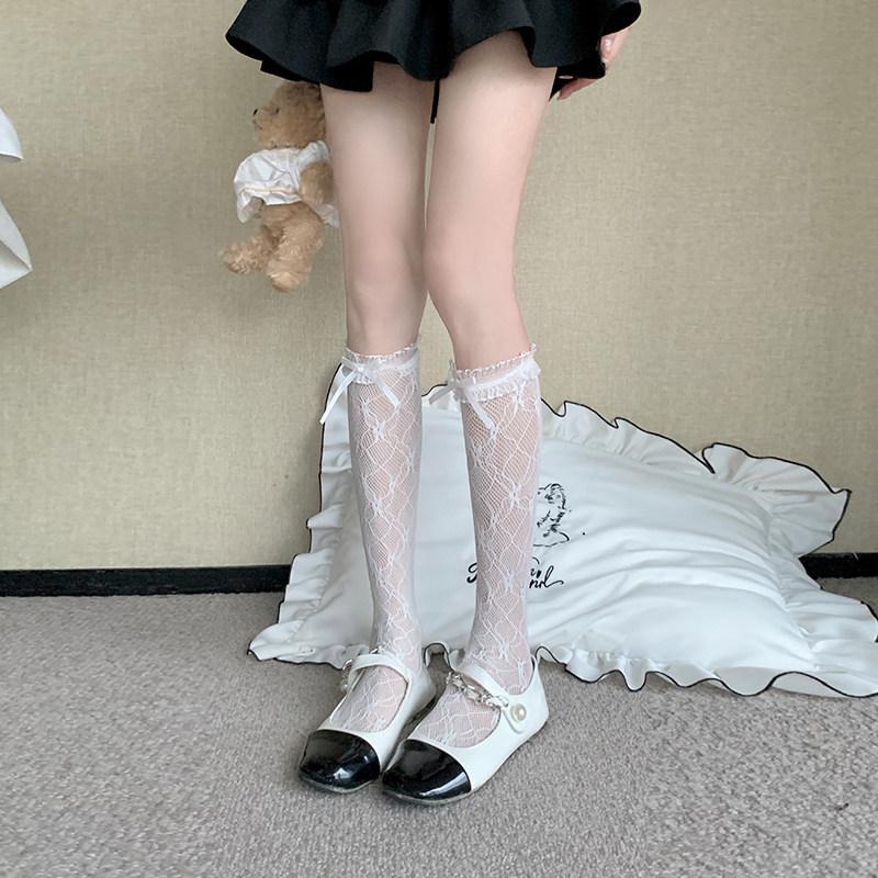 Белые кружевные летние тонкие носки с бантиком, средней длины, в стиле Шанель