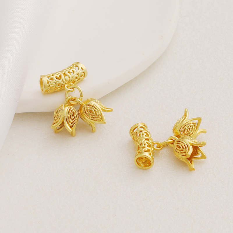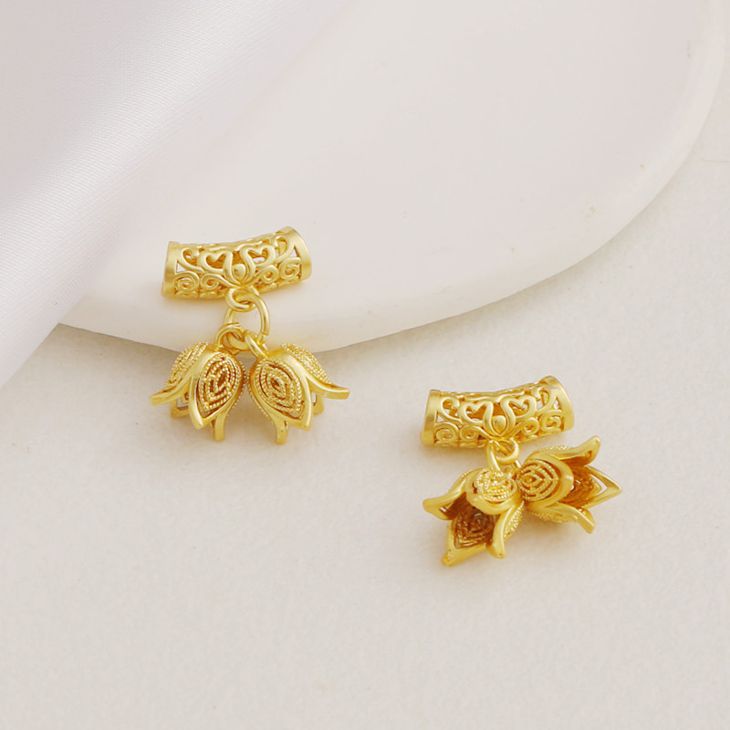| Цвет: | Набор матовых золотых подвесок с полыми бочонками и бутонами цветов. |