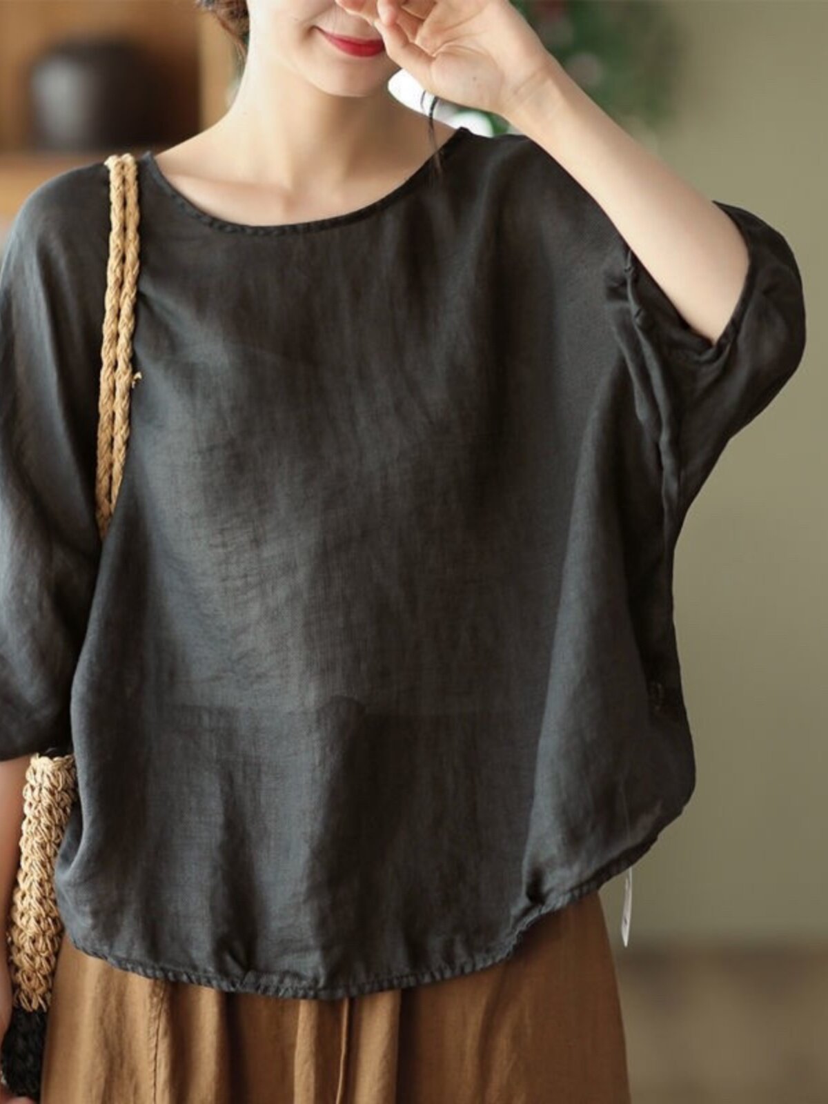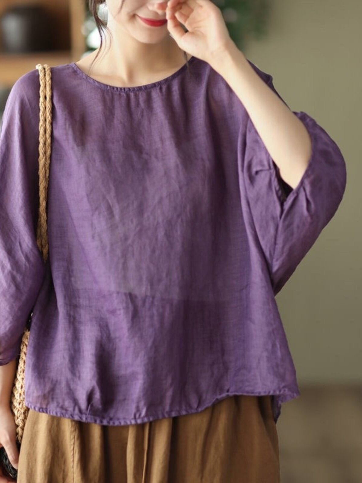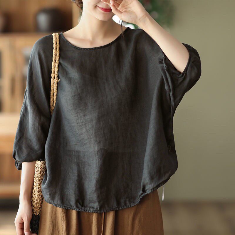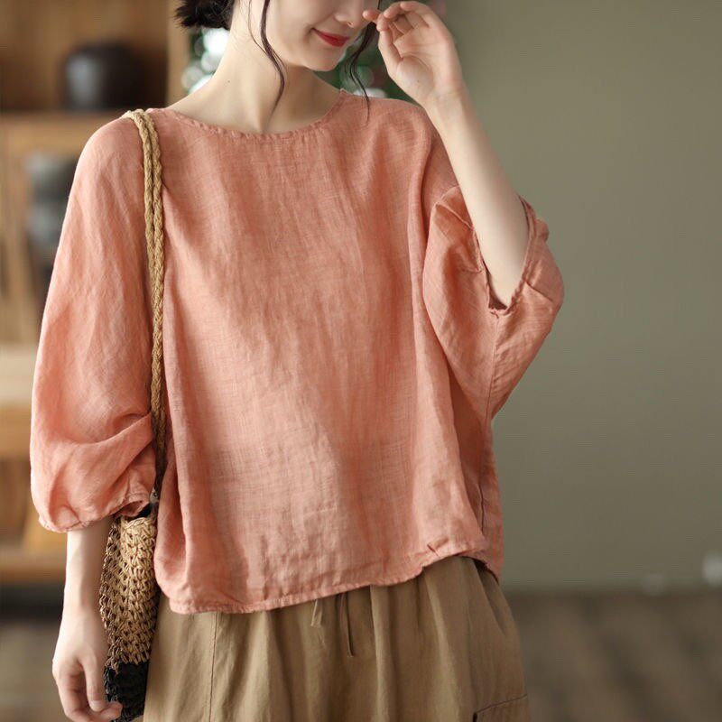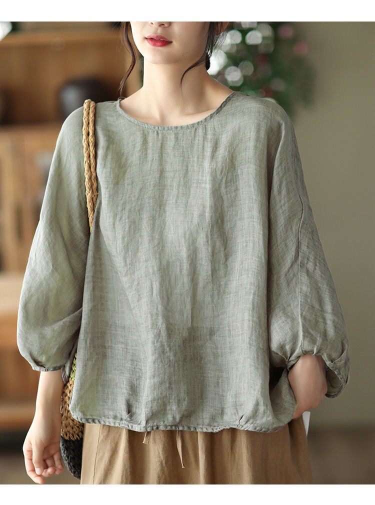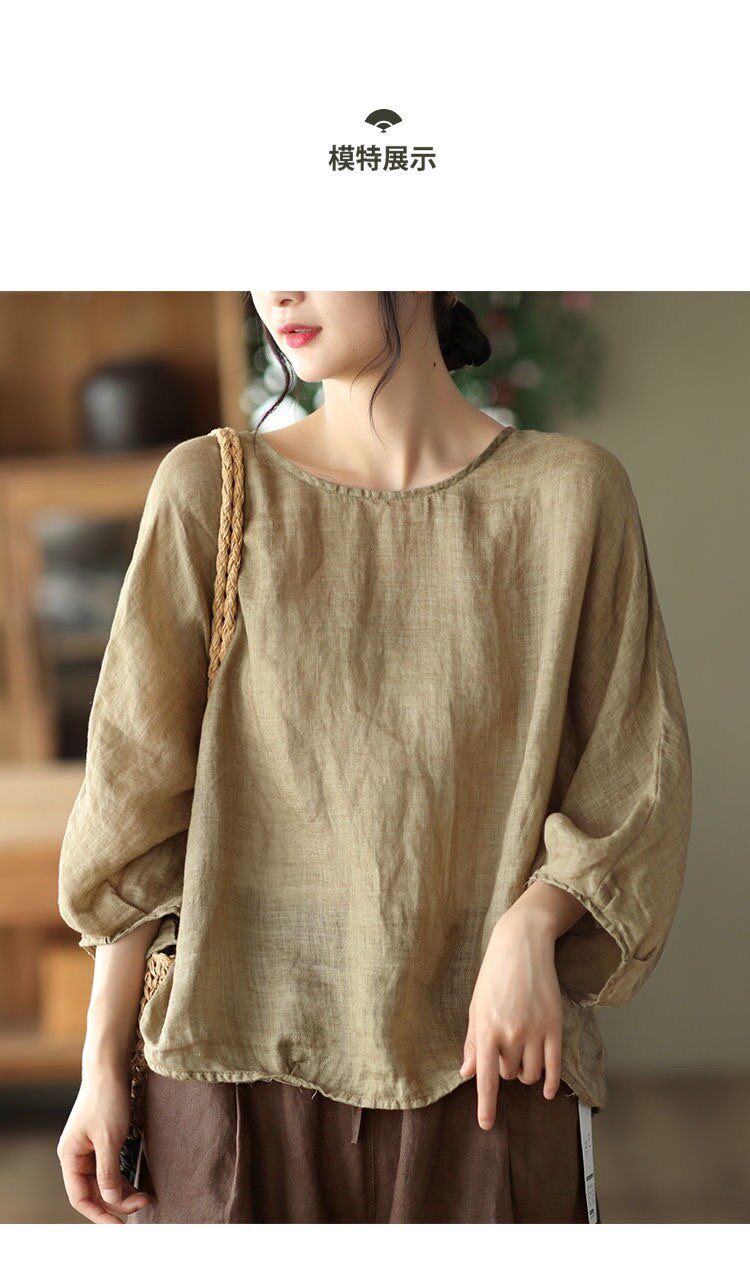 Ретро тонкая футболка, из хлопка и льна, французский стиль