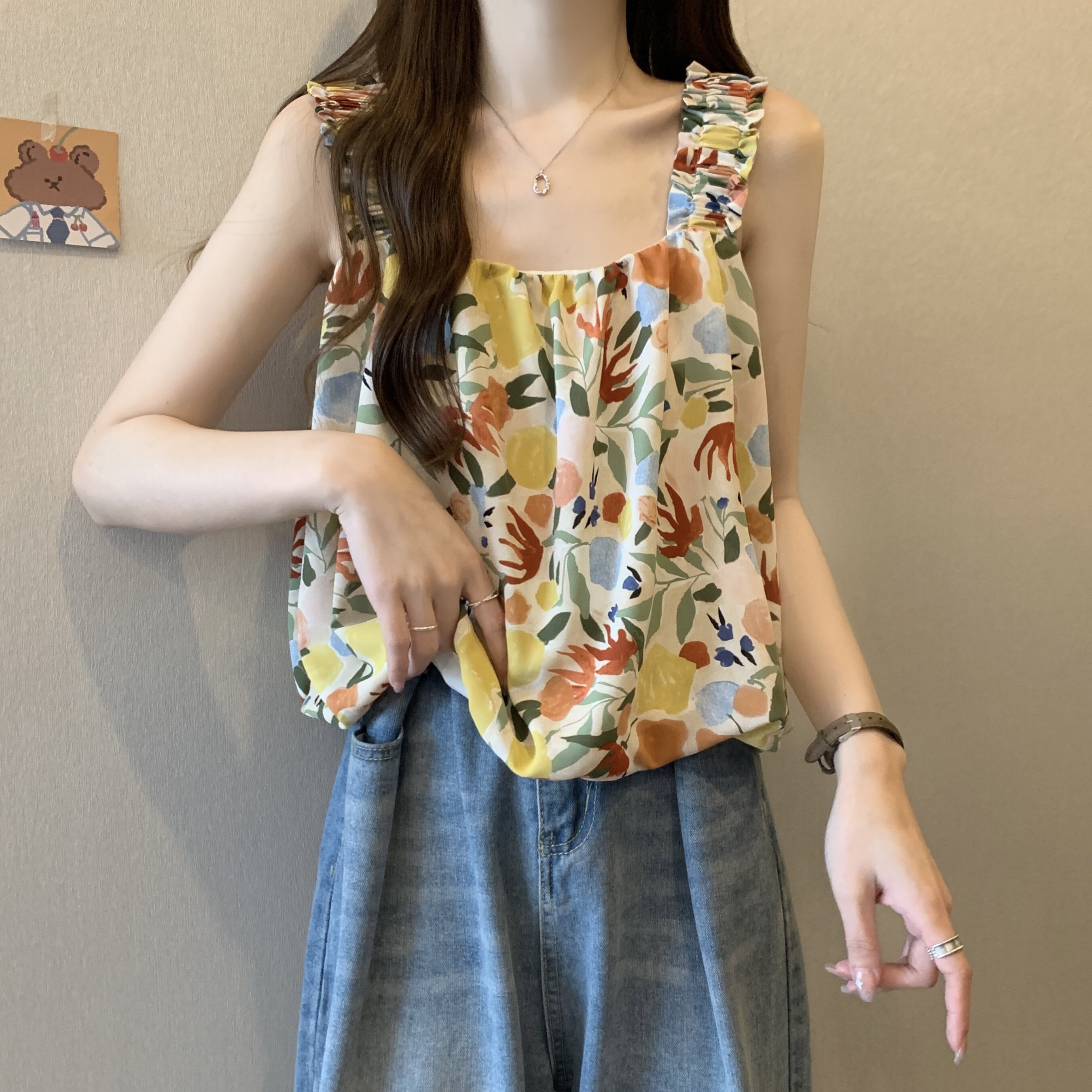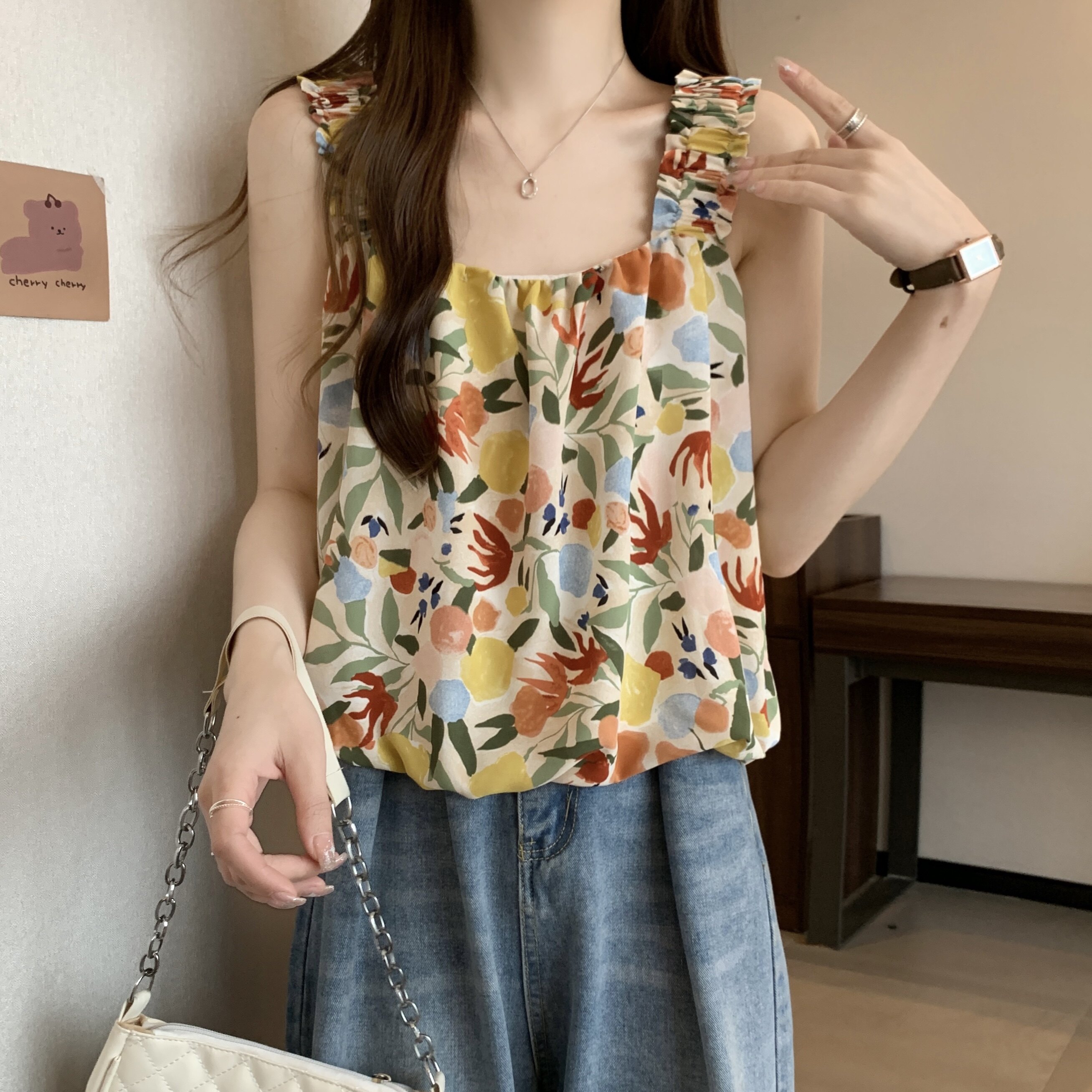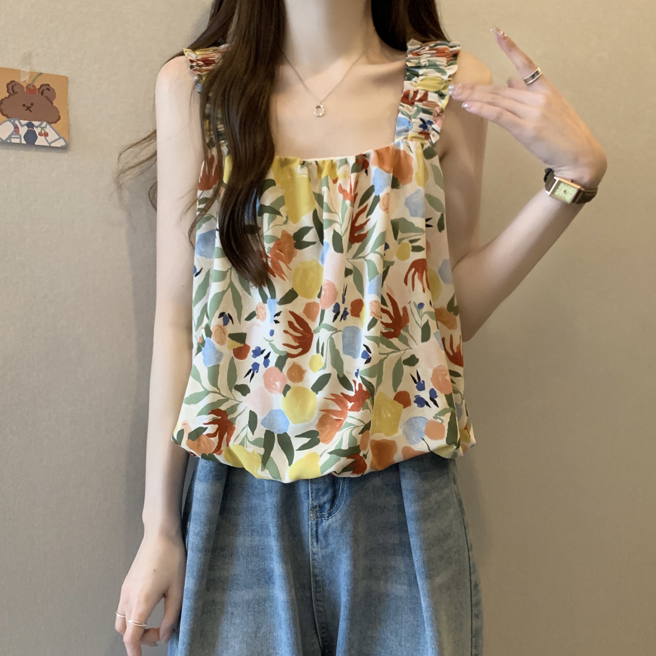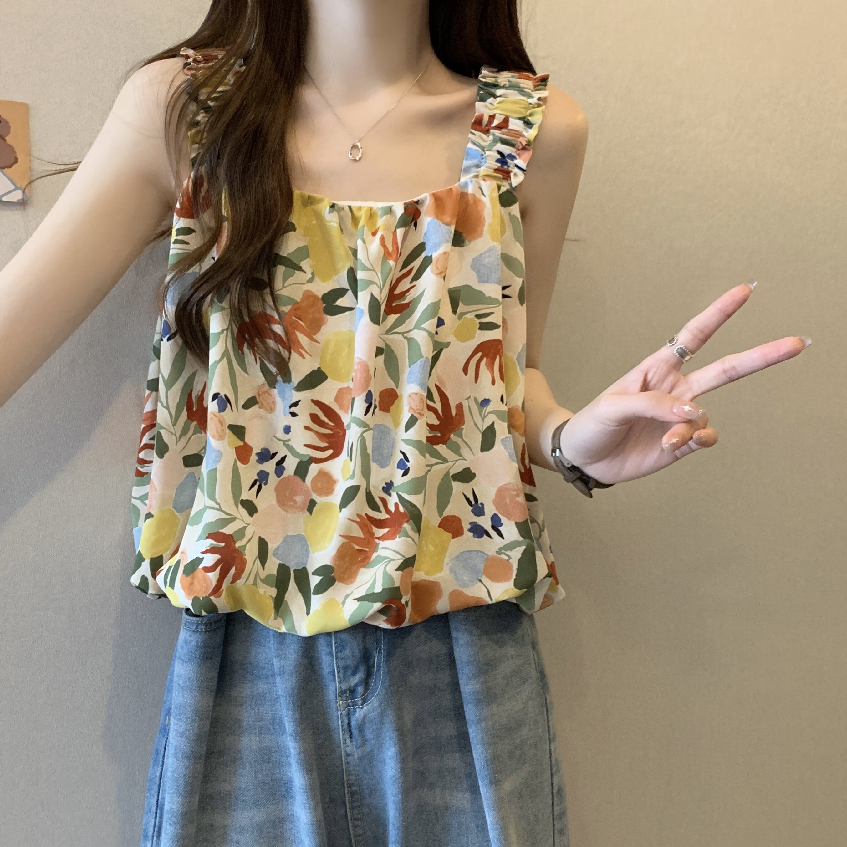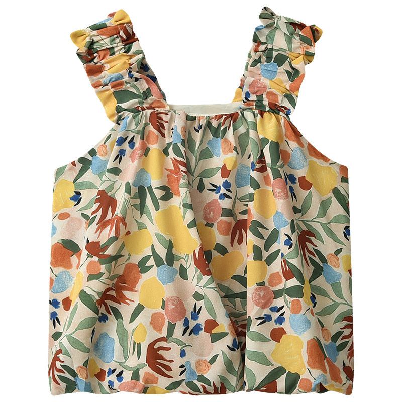 Дизайнерская пляжная майка топ без рукавов, французский стиль, цветочный принт, тренд сезона, большой размер